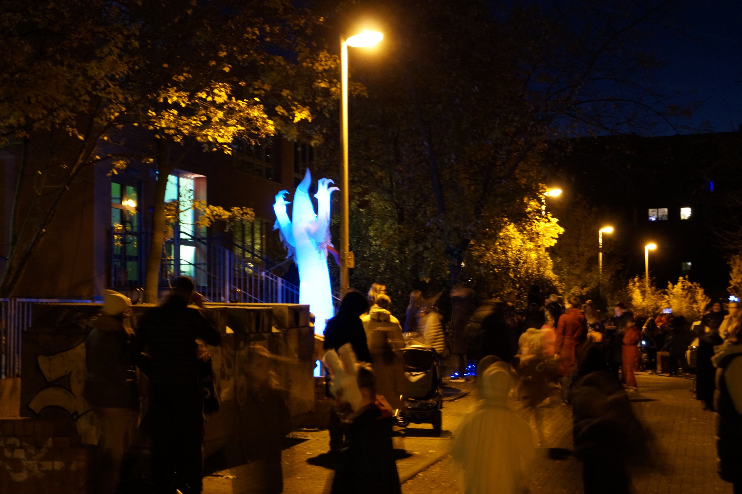 Um 18.00 Uhr öffneten wir nach einem Countdown die Türen - und eine bunte Parade verkleideter Kinder stürmte begeistert hinein. Im ganzen Haus gab es etwas zu entdecken: Grusel-Labyrinth, lustige Spiele, Geisterbowling und im Lichthof wurde zu aktuellen Hits getanzt.
