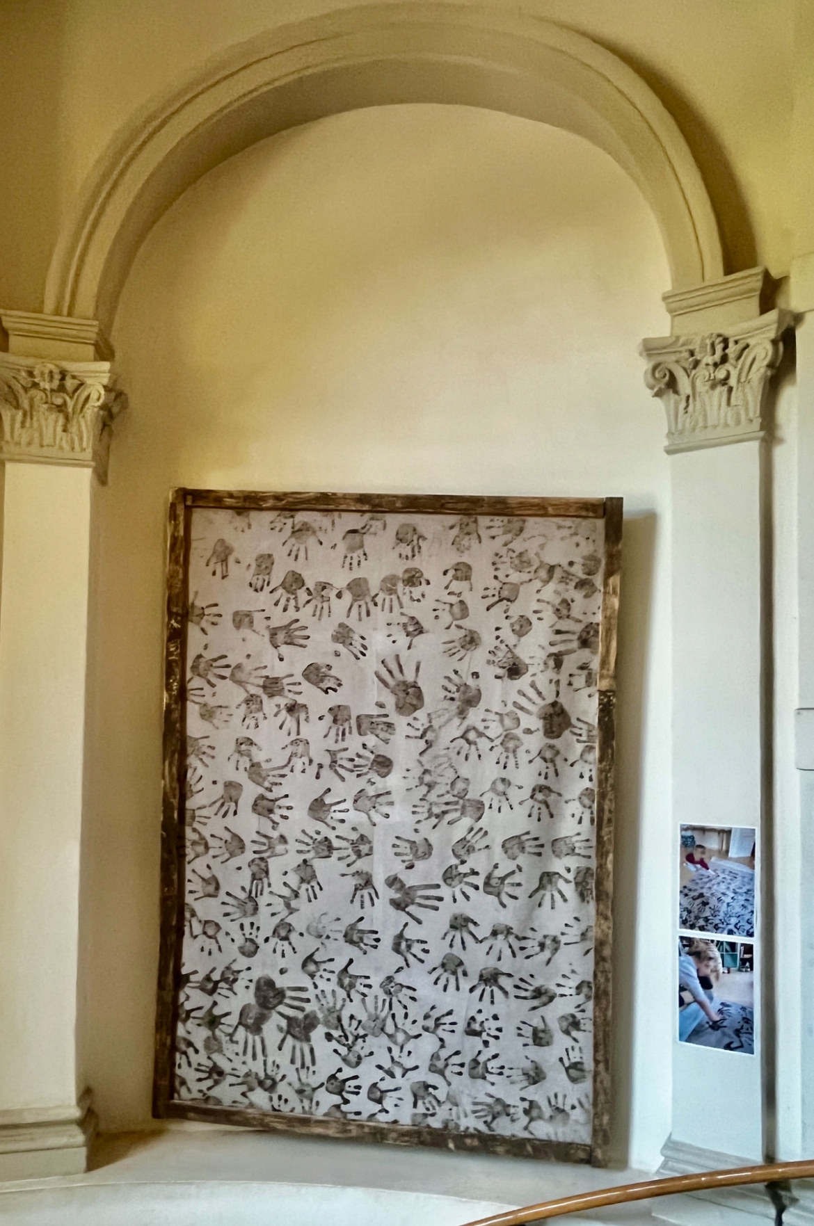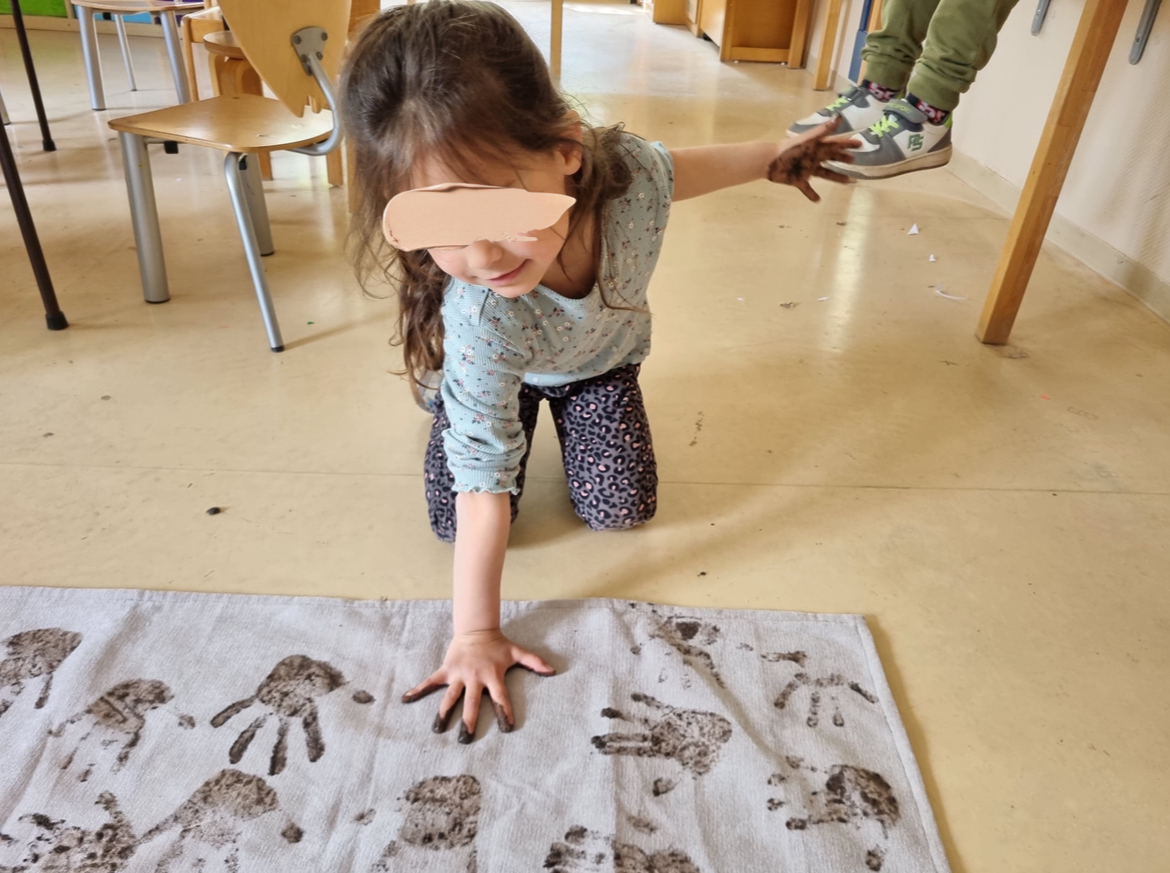 Besonders inspiriert durch die Naturkunst von Richard Long gestalteten die Kinder gemeinsam eine große Stoffleinwand – ausschließlich mit Handabdrücken aus Matsch. Das kreative Arbeiten mit natürlichen Materialien, das bewusste Einsetzen des eigenen Körpers und das gemeinsame Gestalten standen dabei im Mittelpunkt.
