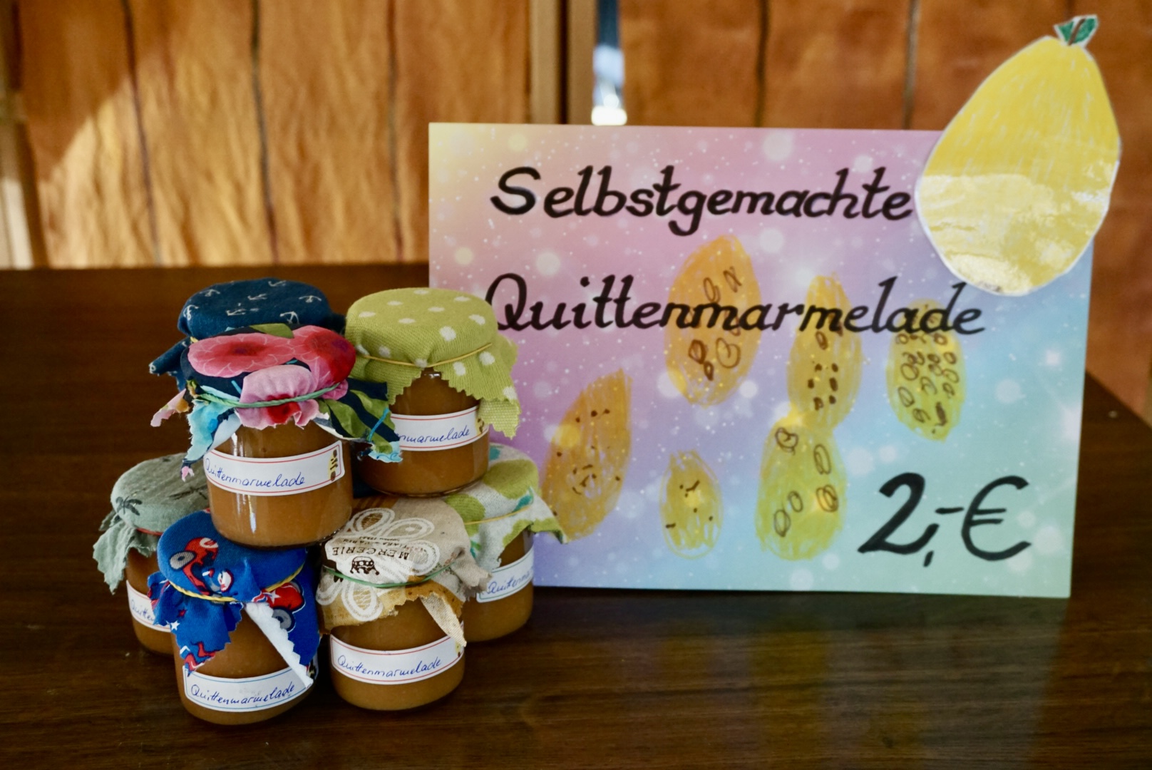 Auch in unserer Kita-Küche ist jede Menge los: Inspiriert von den kleinen Gärtnern, die bereits zum Sommerfest ihre selbst gekochte Erdbeermarmelade verkauft haben, entstand nun die Idee, die Quitten aus Catrins Garten zu verarbeiten. Schon beim Schälen und Rühren duftet das ganze Haus und wenn der Quittenschaum wie Schnee durch die Räume fliegt, weiß jeder: Die Marmeladenzeit ist da!