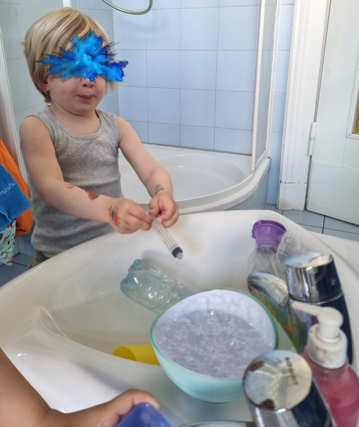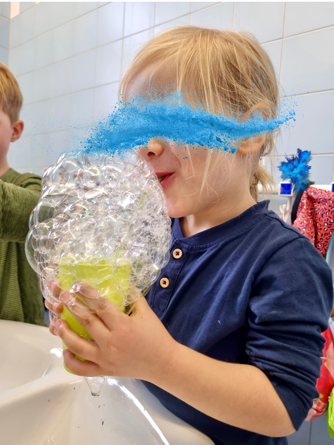 Mit Strohhalmen wird geblubbert, Schaum wird produziert, Wasser wird umgefüllt, geschüttet und beobachtet. Es darf spritzen, tropfen und fließen – alles im Sinne eines freien, lustvollen Erlebens.