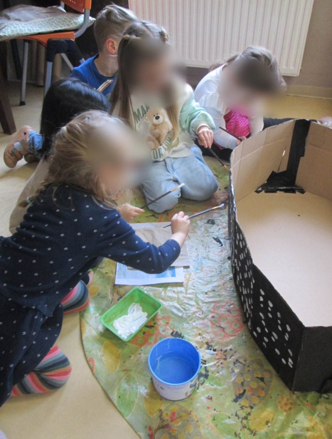 Das entstandene Gemeinschaftswerk hängt nun im Flur unserer Einrichtung – als sichtbares Zeichen für die Vielfalt, Ausdruckskraft und Begeisterung, mit der Kinder Kunst entdecken, erleben und mitgestalten.
