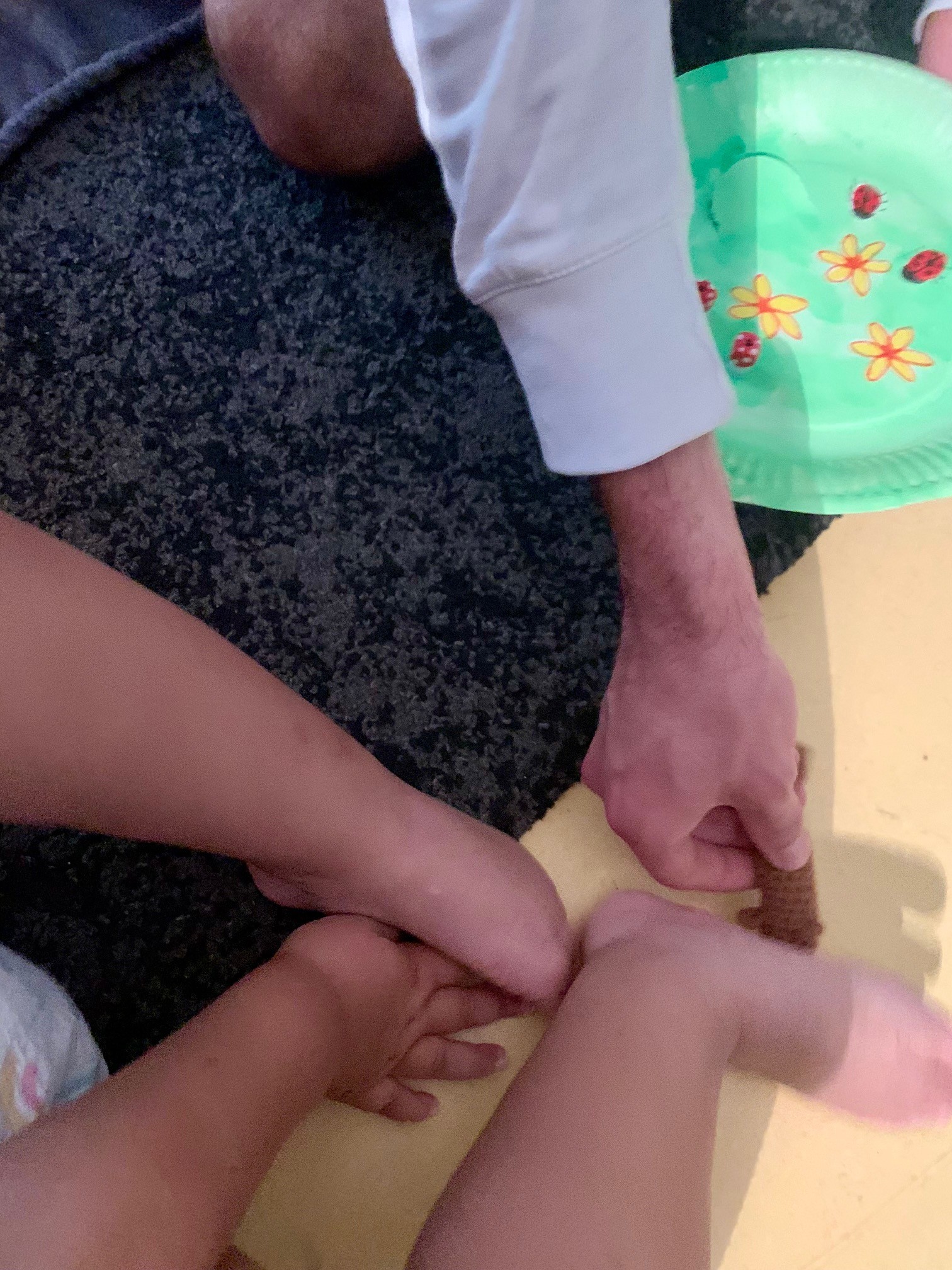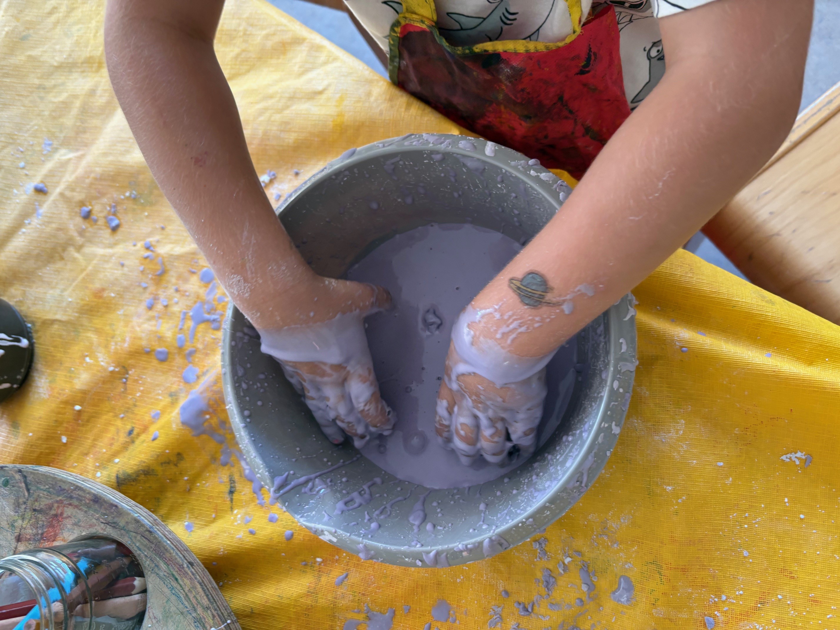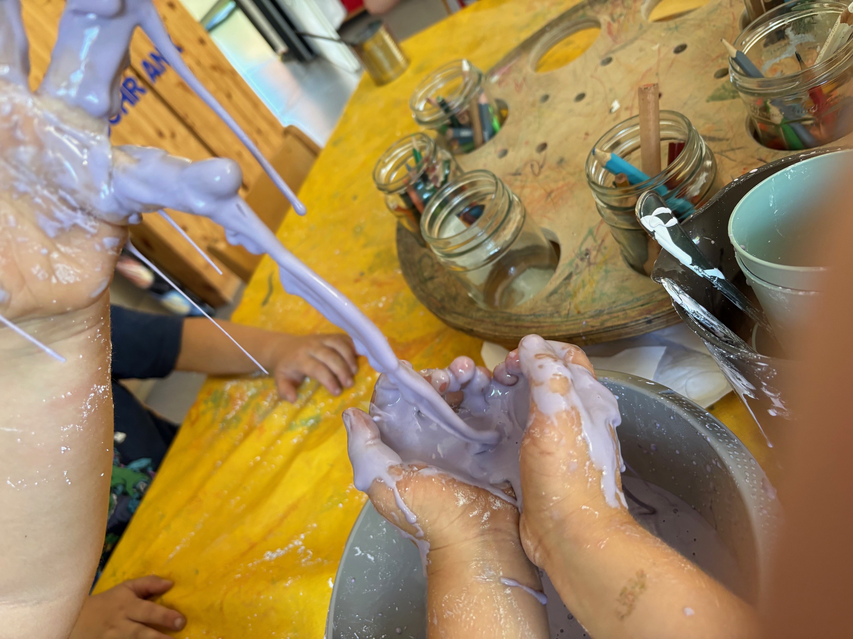 Die Kinder hatten große Freude daran, zu fühlen, zu matschen und zu beobachten, wie sich die Konsistenz verändert. Um es noch aufregender zu machen, haben wir eine Schüssel mit lila Lebensmittelfarbe eingefärbt.