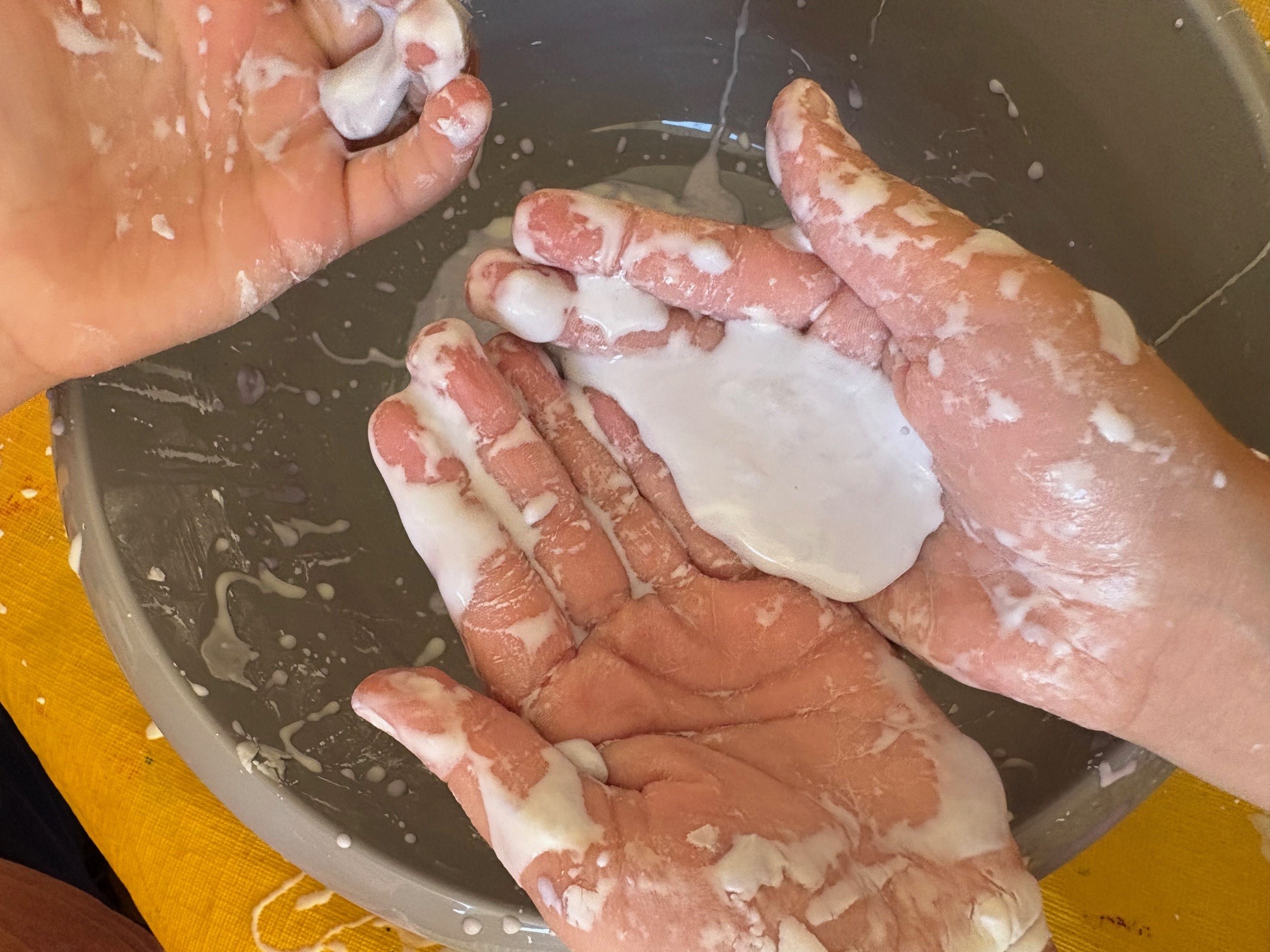 Wir haben gemeinsam eine nicht-newtonsche Flüssigkeit hergestellt – besser bekannt als eine „Zauberflüssigkeit“ aus 2 Bechern Speisestärke und 1 Becher Wasser.
