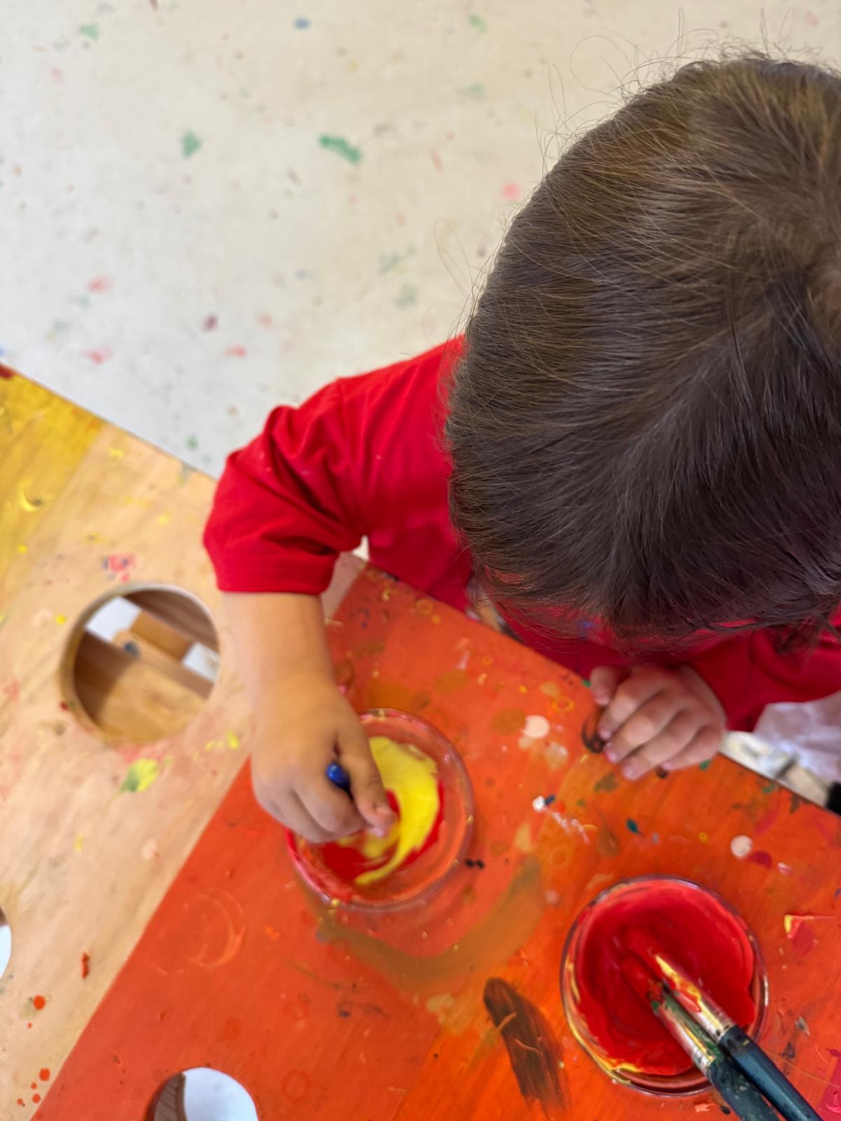 Durch das aktive Experimentieren und Zusammenfügen von Primärfarben erleben die Kinder wie neue Farbtöne entstehen. Hierdurch erhalten die Kinder spielerisch einen Zugang zur Farbenlehre.
