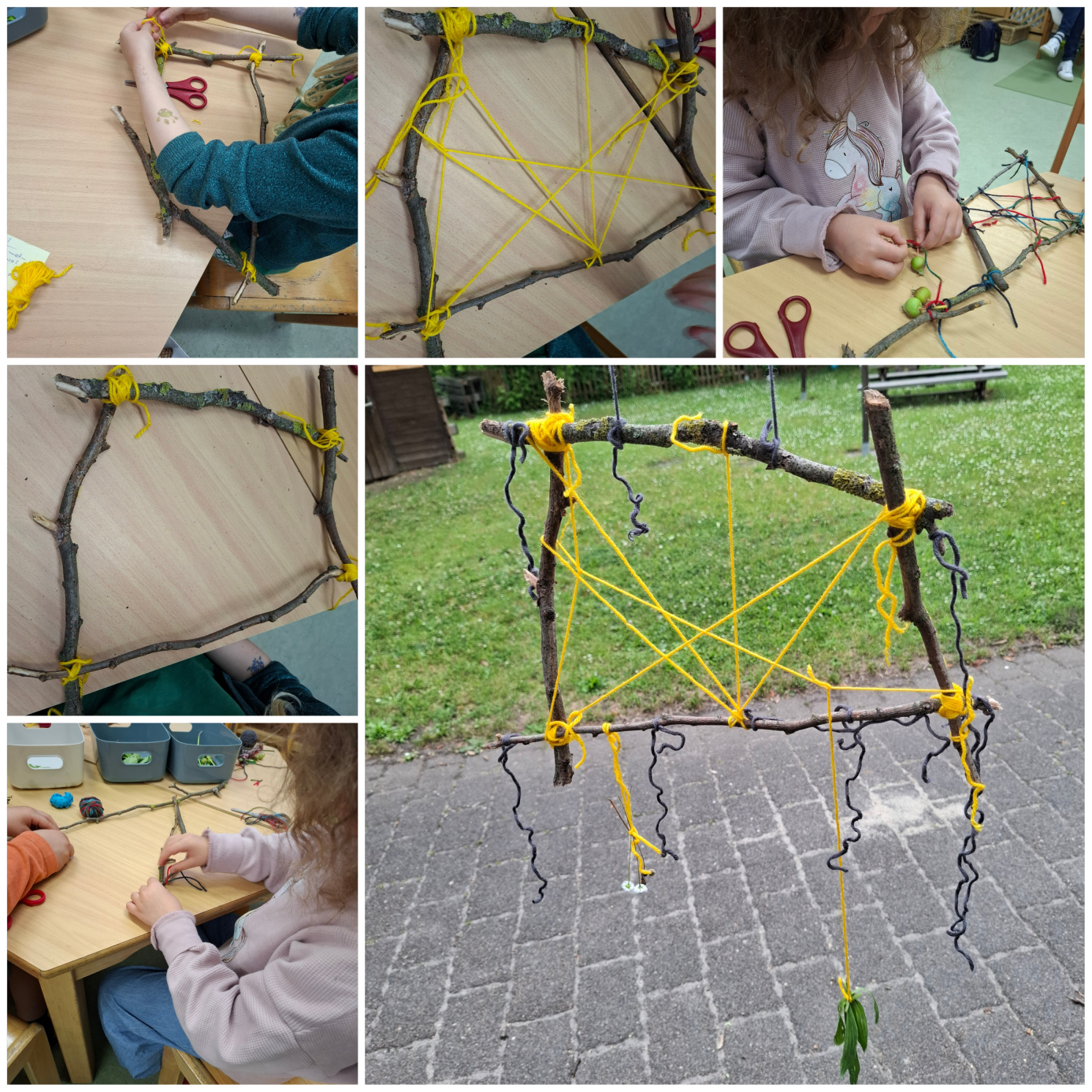 - Rahmen bauen: Die drei - vier Äste mit Wolle zu einem stabilen Viereck oder Dreieck binden.