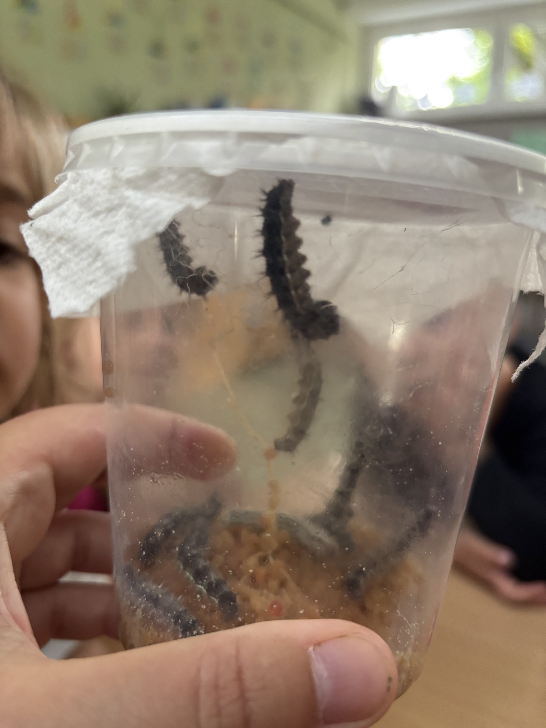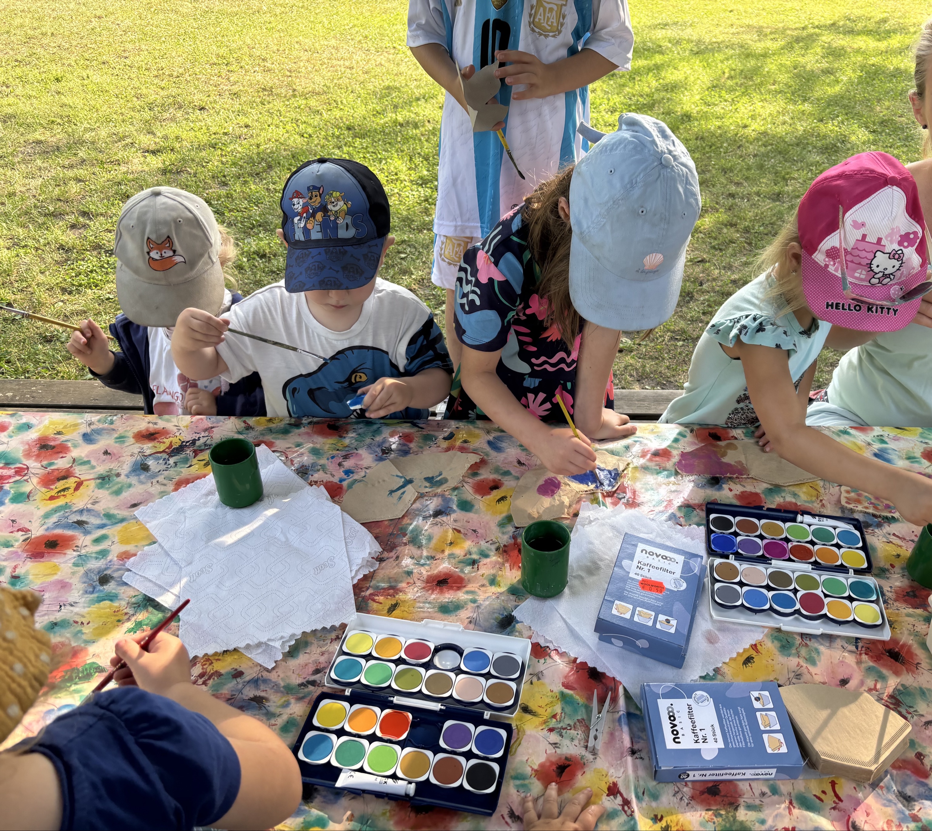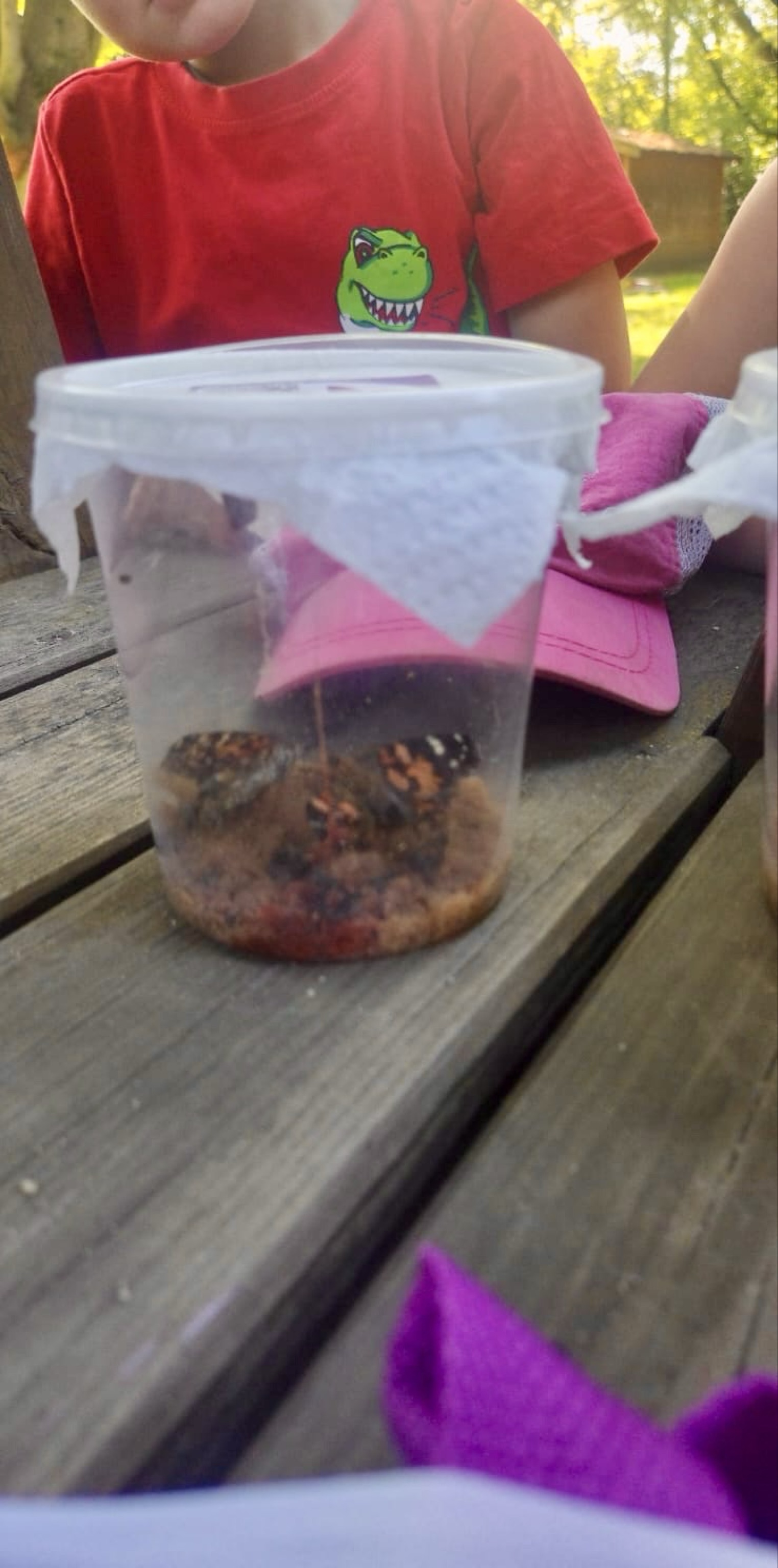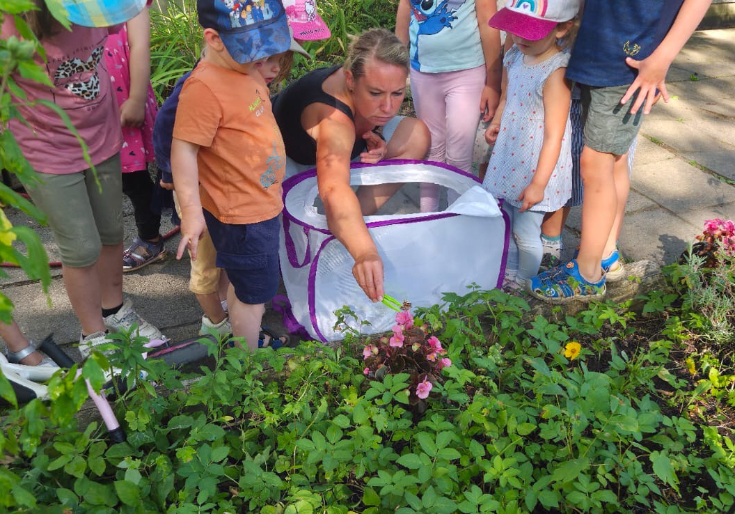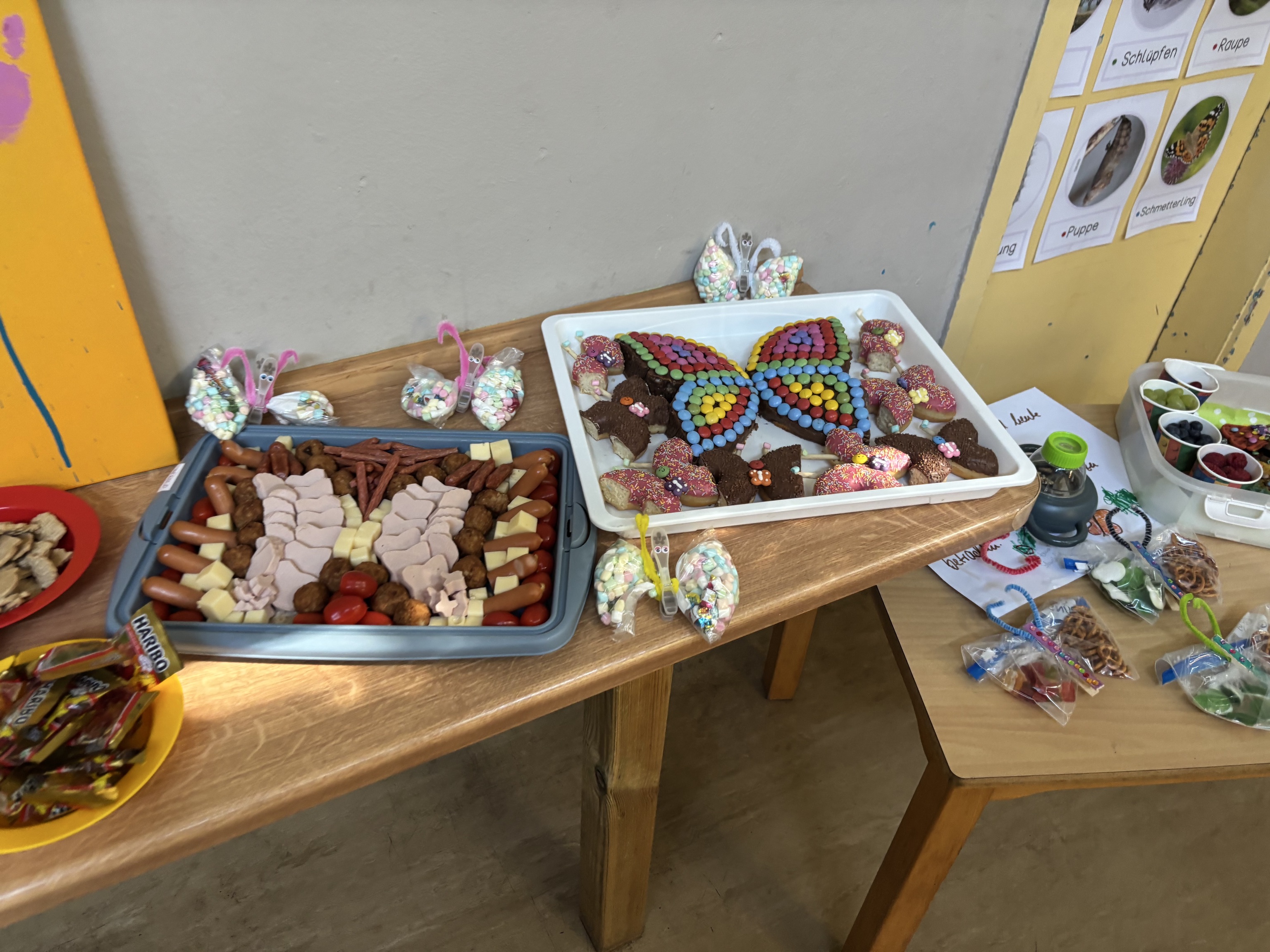 In diesem Sommer starteten wir im Elementarbereich unser spannendes Projekt „Schmetterlinge“. Schon zu Beginn war das Interesse der Kinder groß. Aus winzigen Schmetterlingseiern durften sie Schritt für Schritt die faszinierende Metamorphose beobachten. Täglich entdeckten sie Veränderungen in den kleinen Bechern, die Raupen wuchsen, verpuppten sich und entwickelten sich weiter, bis schließlich der große Moment bevorstand. Damit die Raupen nicht alleine waren, nahmen die Kinder die Becher zeitweise mit nach Hause und begleiteten die Entwicklung mit viel Begeisterung. Begleitend zum Beobachten gab es viele kreative und spielerische Angebote. Die Kinder druckten Raupen mit Luftballons, gestalteten bunte Schmetterlinge mit Schwämmen, marmorierten eigene Schmetterlingsbilder und lauschten der Geschichte „Die kleine Raupe Nimmersatt“. Auch in der Natur gingen wir auf Entdeckungsreise und konnten echte Schmetterlinge beobachten. Als unsere eigenen Schmetterlinge geschlüpft waren, setzten wir sie vorsichtig in eine Volière. Dort wurden sie mit frischen Blüten und Obst versorgt, bis der große Abschied kam.