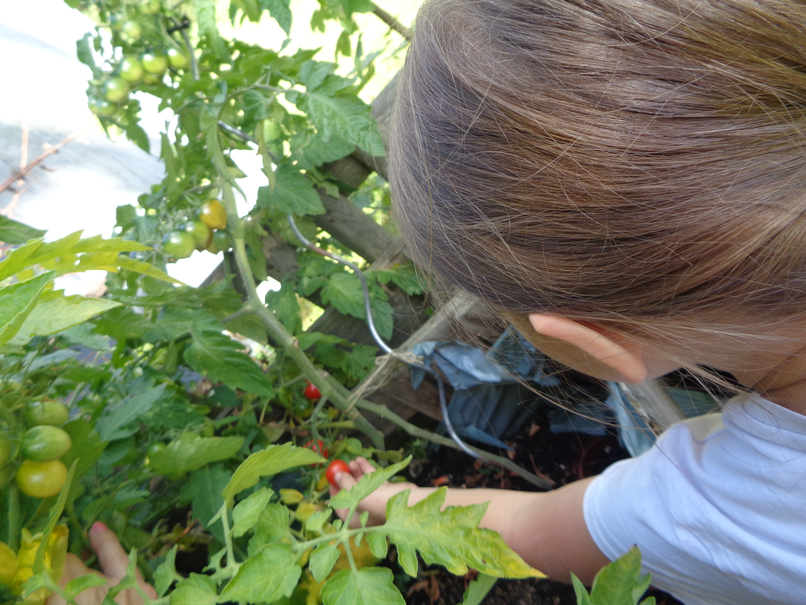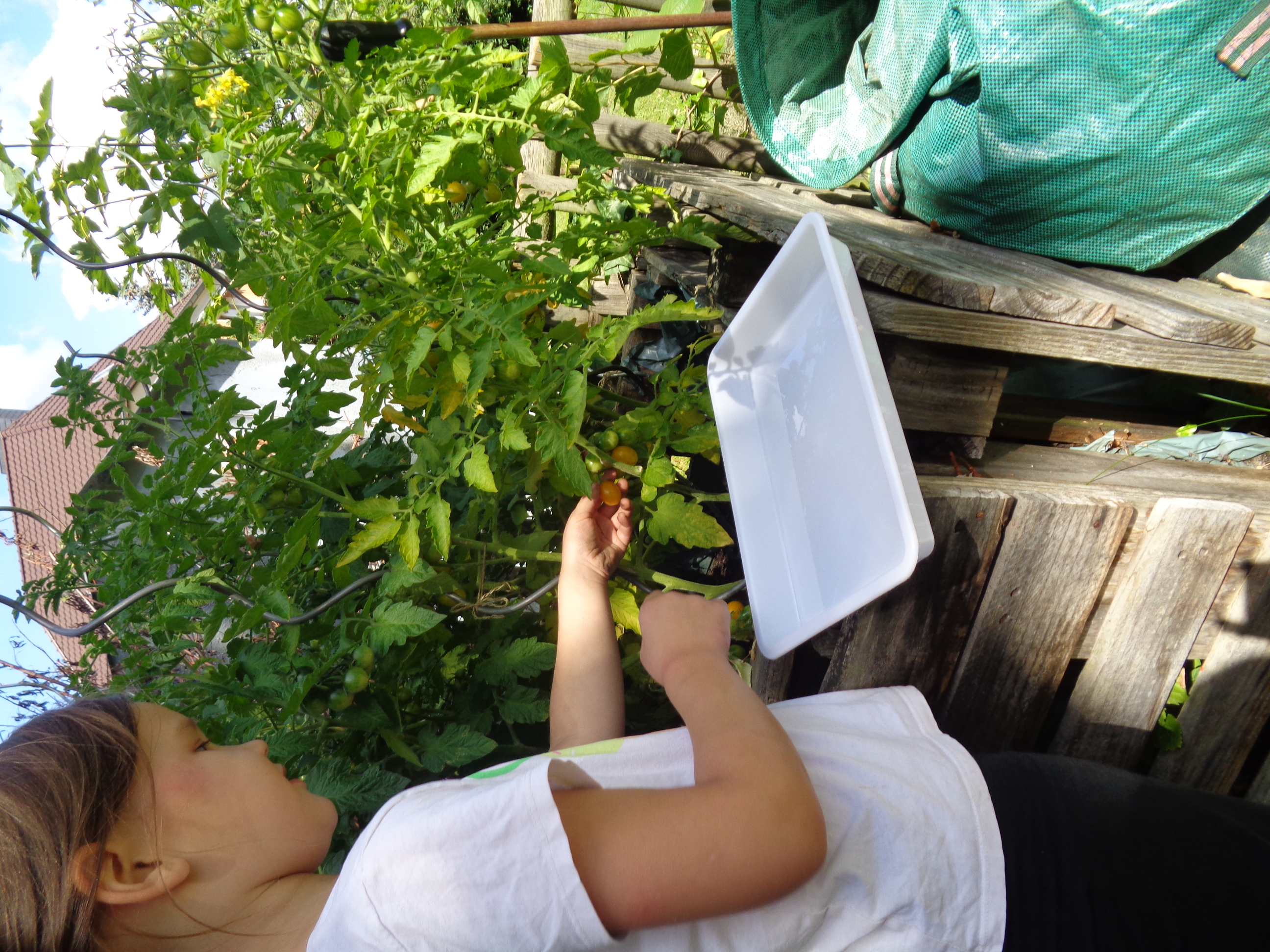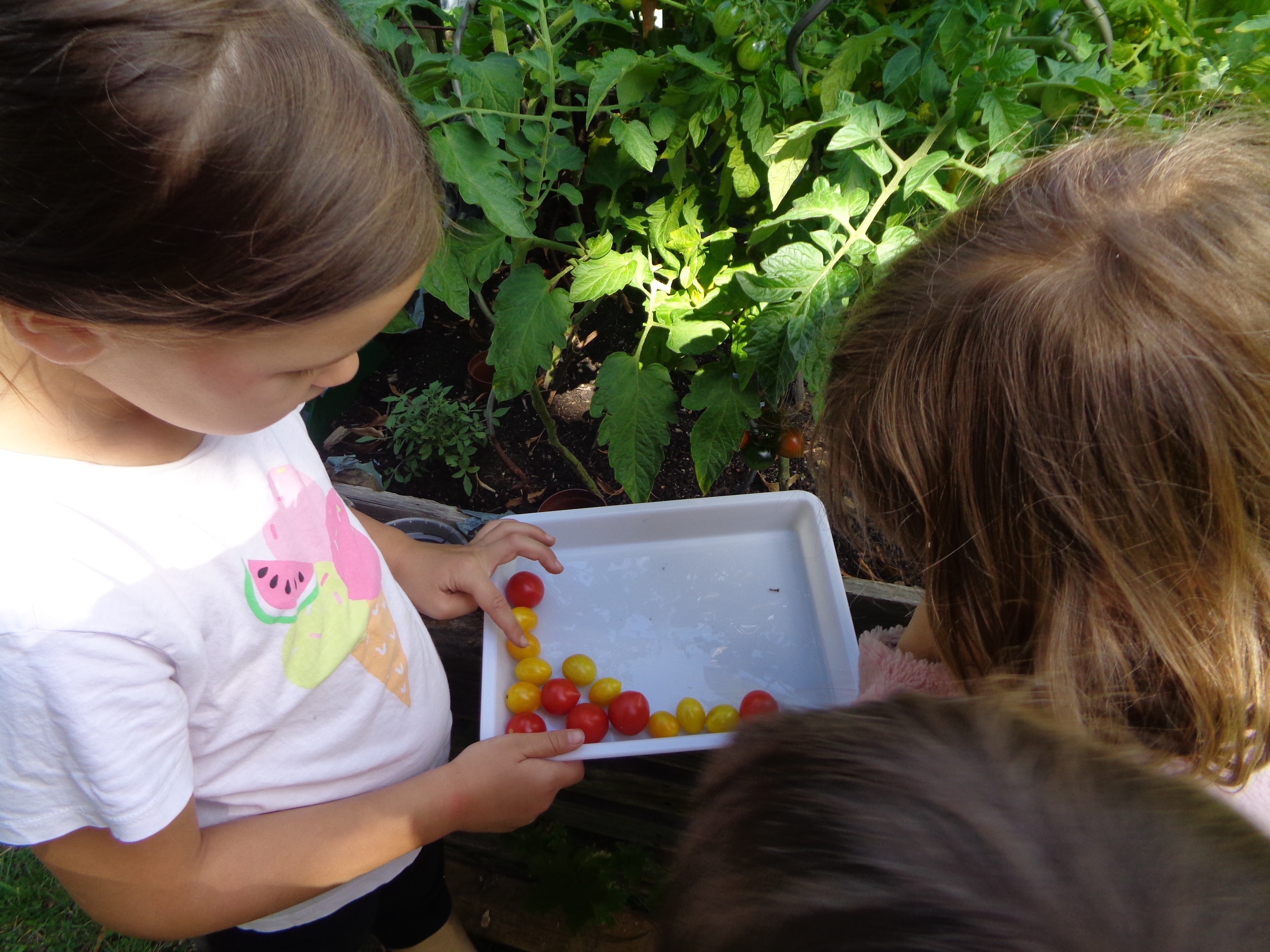 Die Kinder haben das Wachsen von Tomaten- und Gurkenpflanzen verfolgt. Nach der Zeit der Pflege können nun die ersten Tomaten geerntet werden. Egal, ob gelb oder rot, sie schmecken alle ganz lecker.