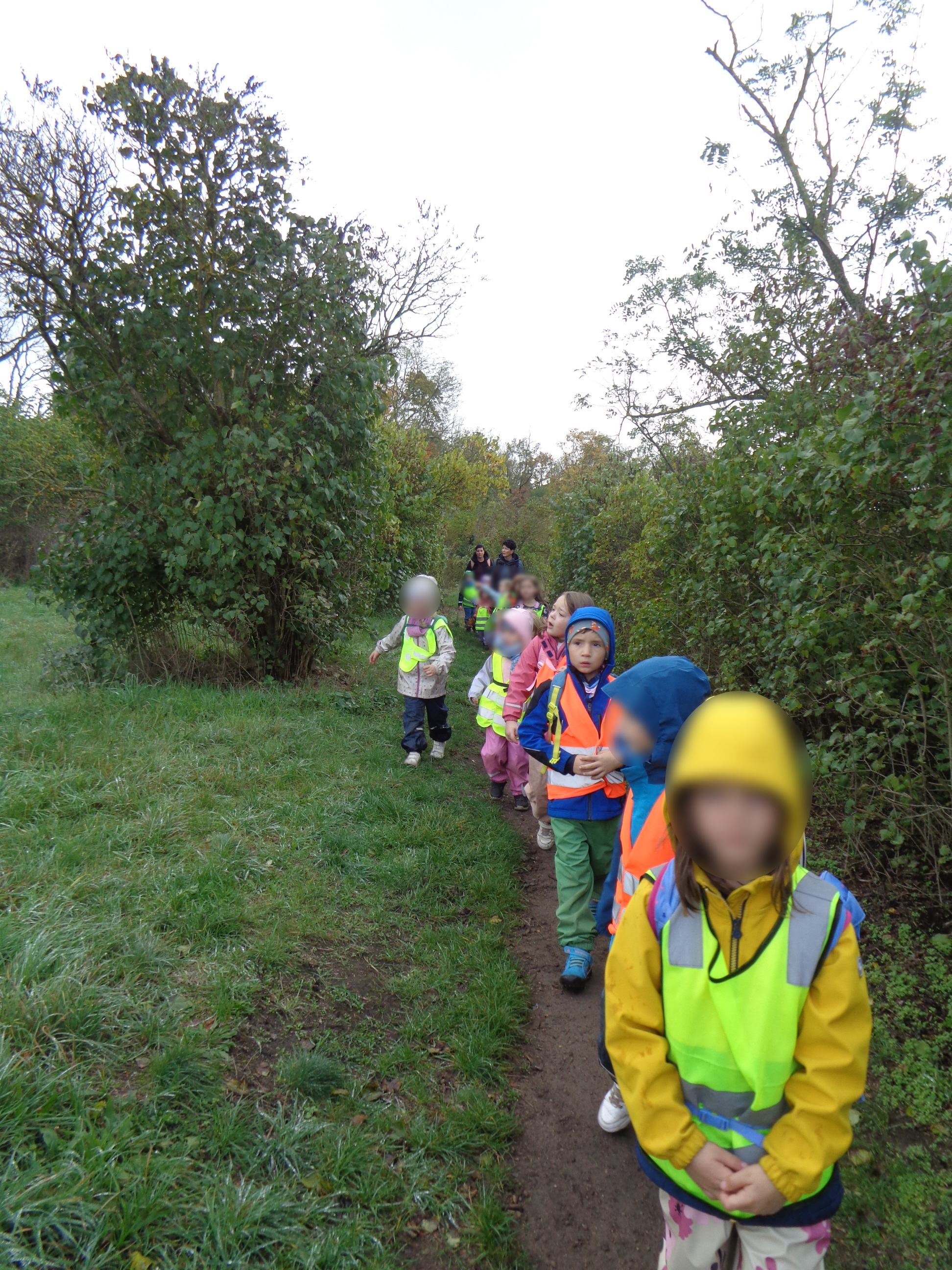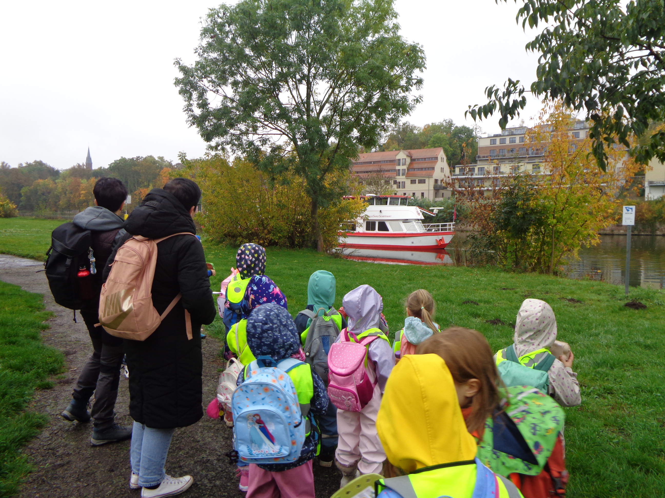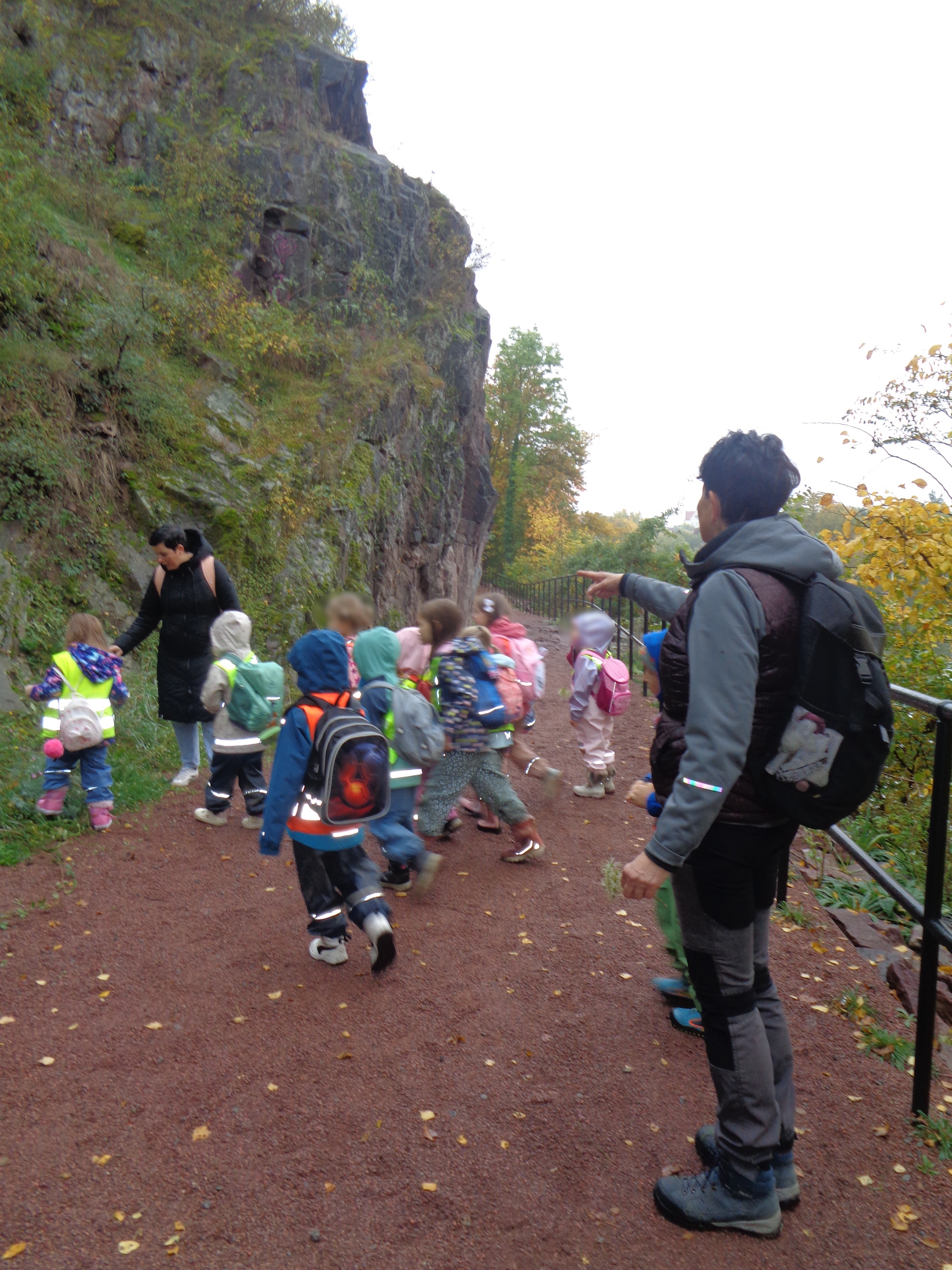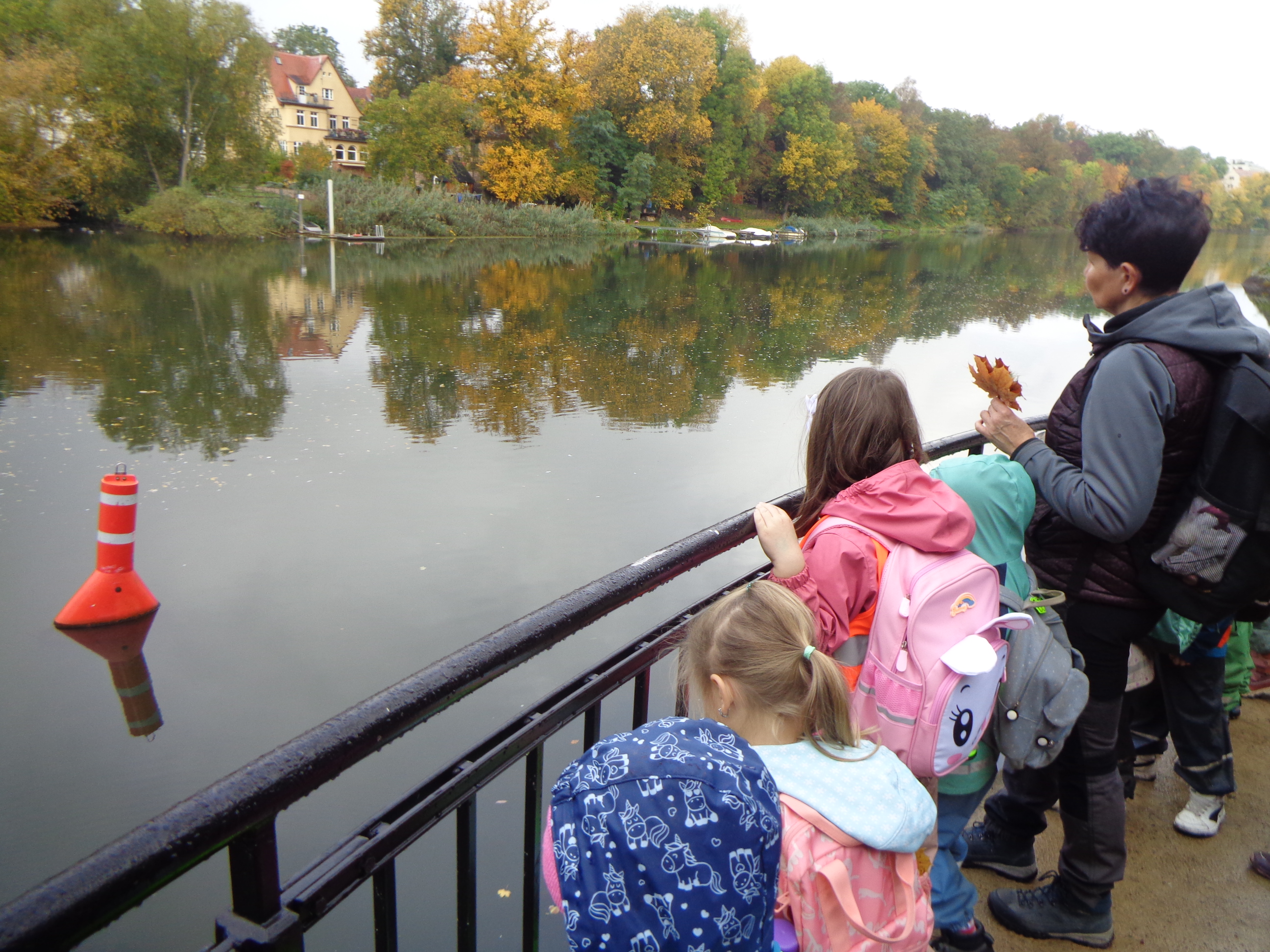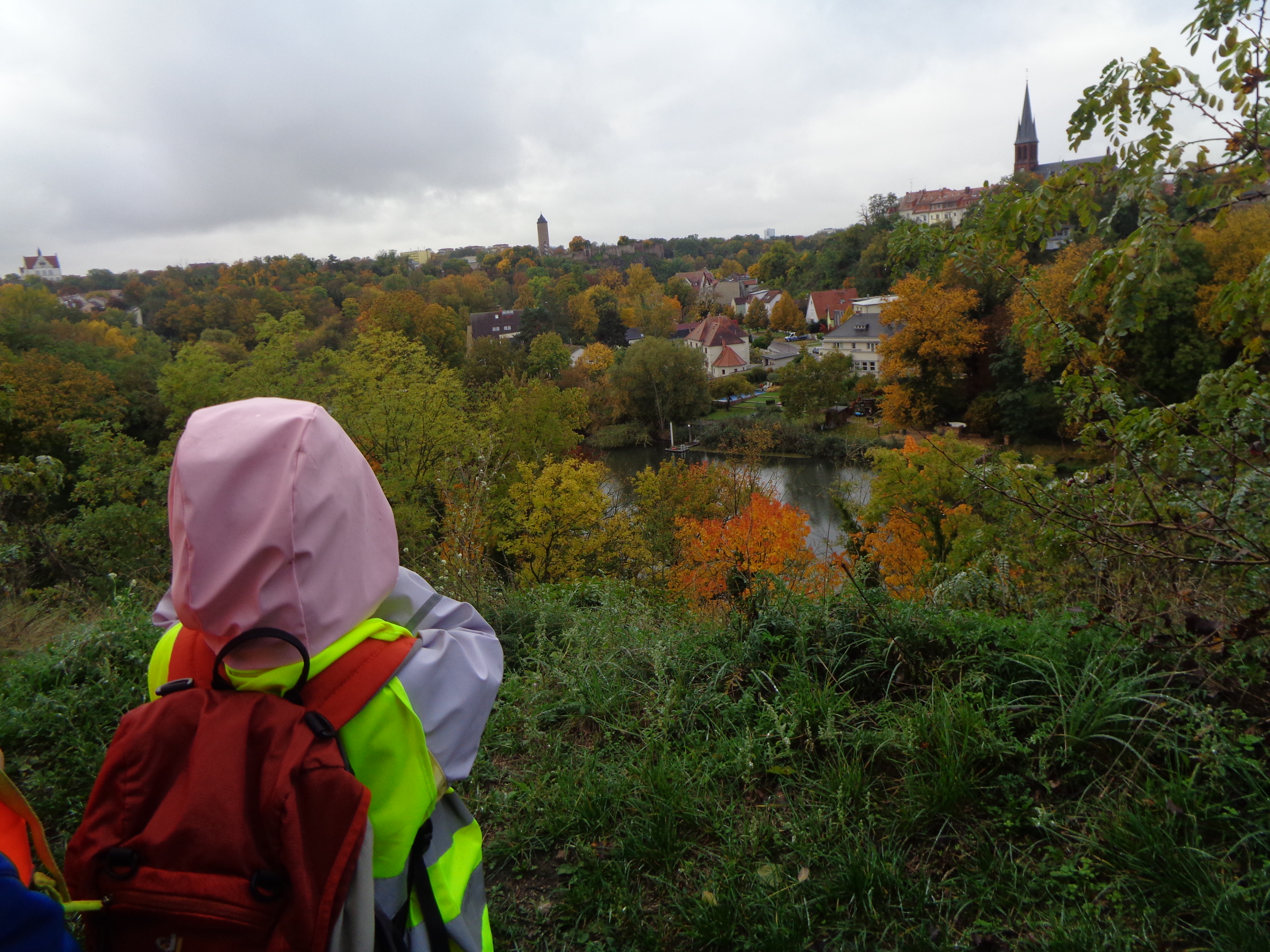 Bei echtem Herbstwetter sind wir zu unserer Wanderung in Richtung Saale aufgebrochen. Unterwegs hatten die Kinder die Möglichkeit, vorbereitete Sammelboxen mit allerlei spannenden Dingen zu füllen, z.B. etwas, was vom Baum fällt, etwas Leichtes oder etwas in ihrer Lieblingsfarbe. Natürlich hatten wir auch tolle Ausblicke auf die Saale, die Petruskirche und die Burg Giebichenstein. Oberhalb der Klausberge machten wir noch ein kleines Picknick, bevor es wieder zurück in die Kita ging. Wir haben den Herbst mit allen Sinnen gespürt und die einstimmige Meinung war: "Das müssen wir nochmal machen."