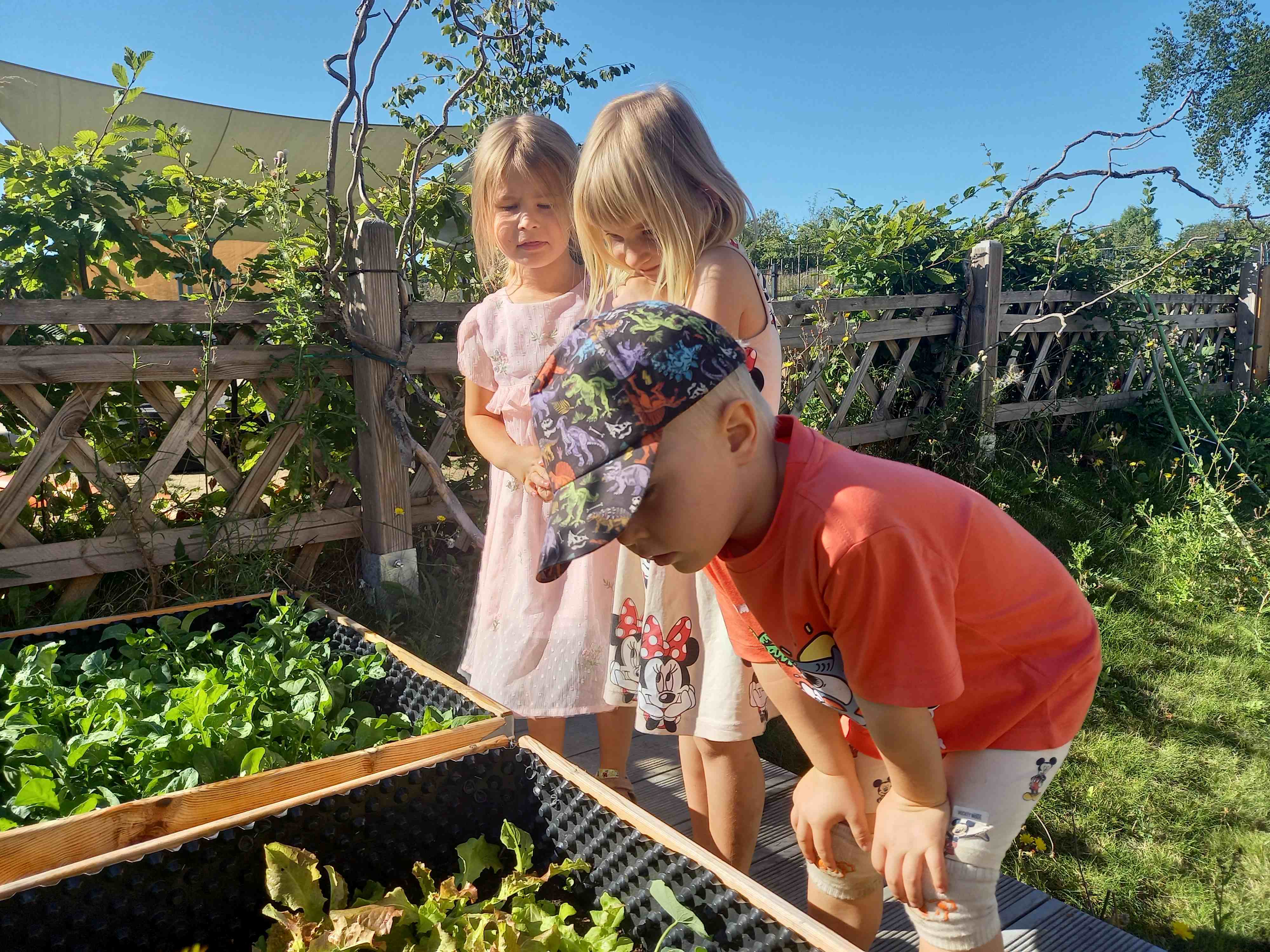 Täglich begleitet eine pädagogische Fachkraft einige Kinder beim Gießen der Pflanzen.