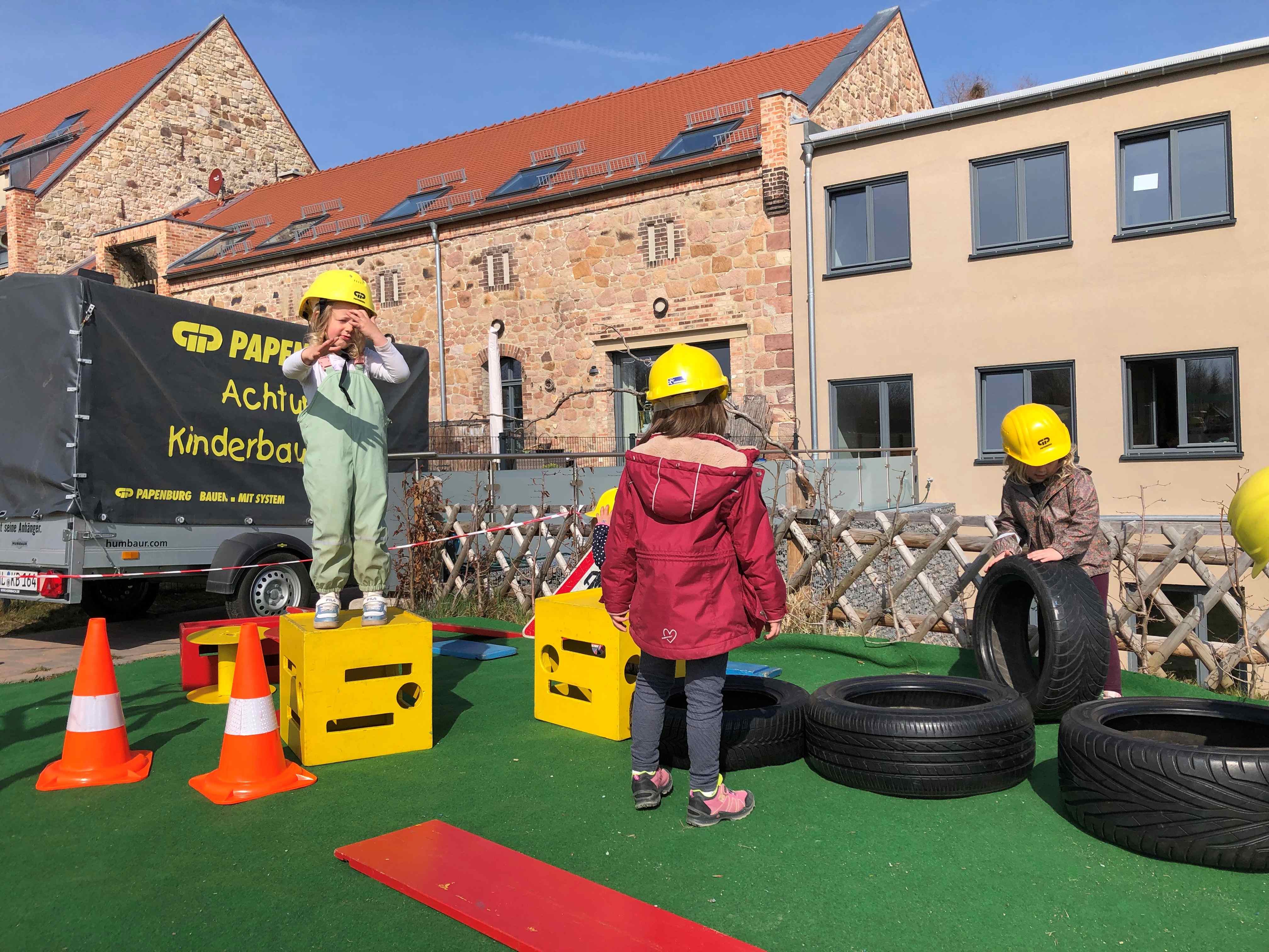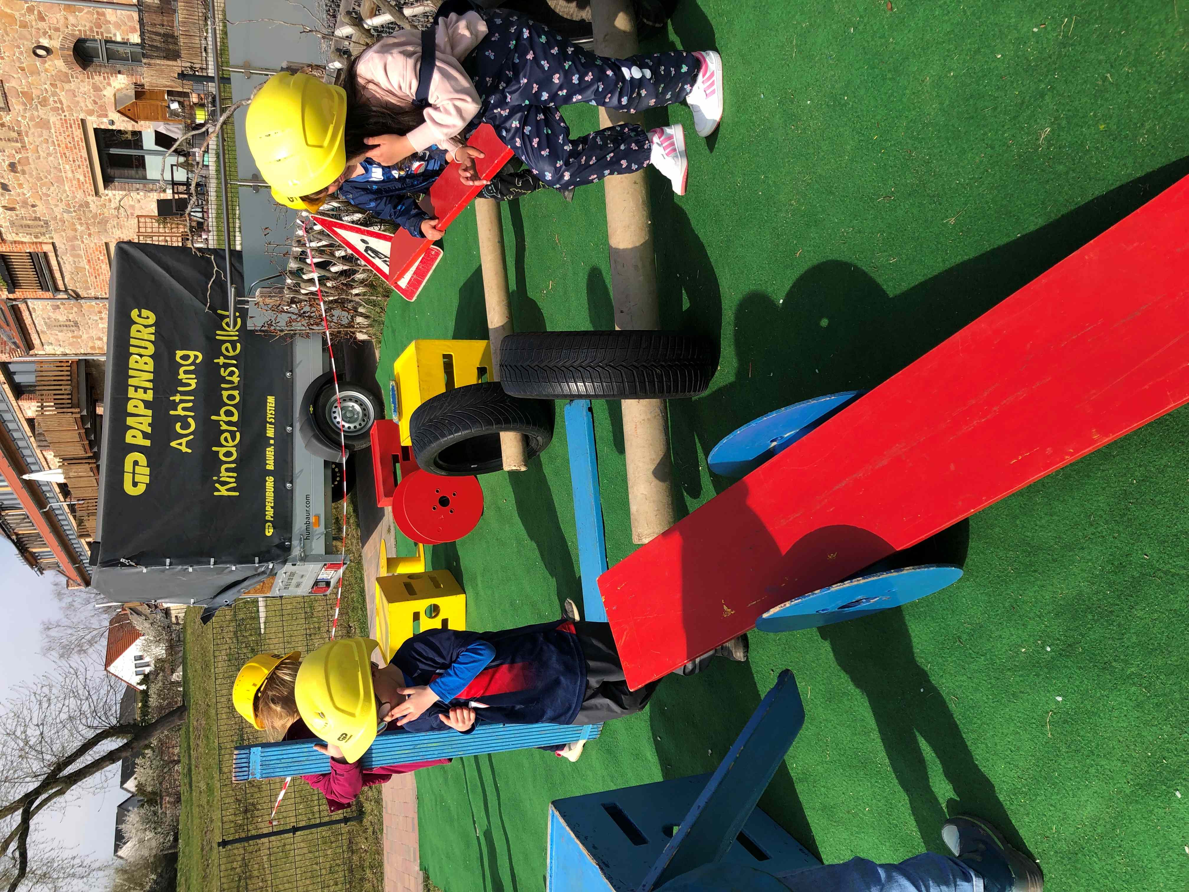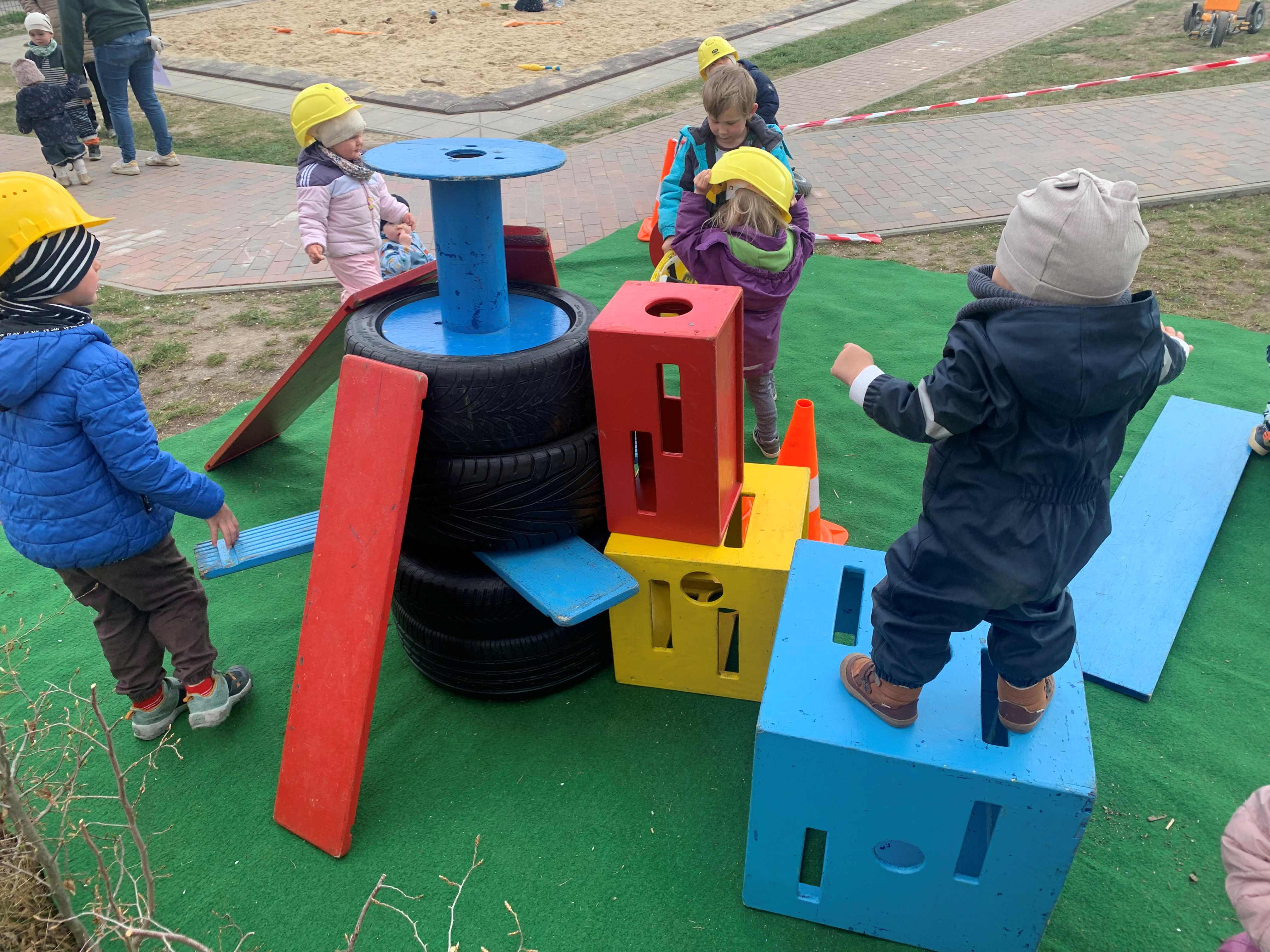 Da liegt es nahe, das tolle Angebot der Firma Papenburg anzunehmen, eine Kinderbaustelle temporär in der Kita einzurichten.
