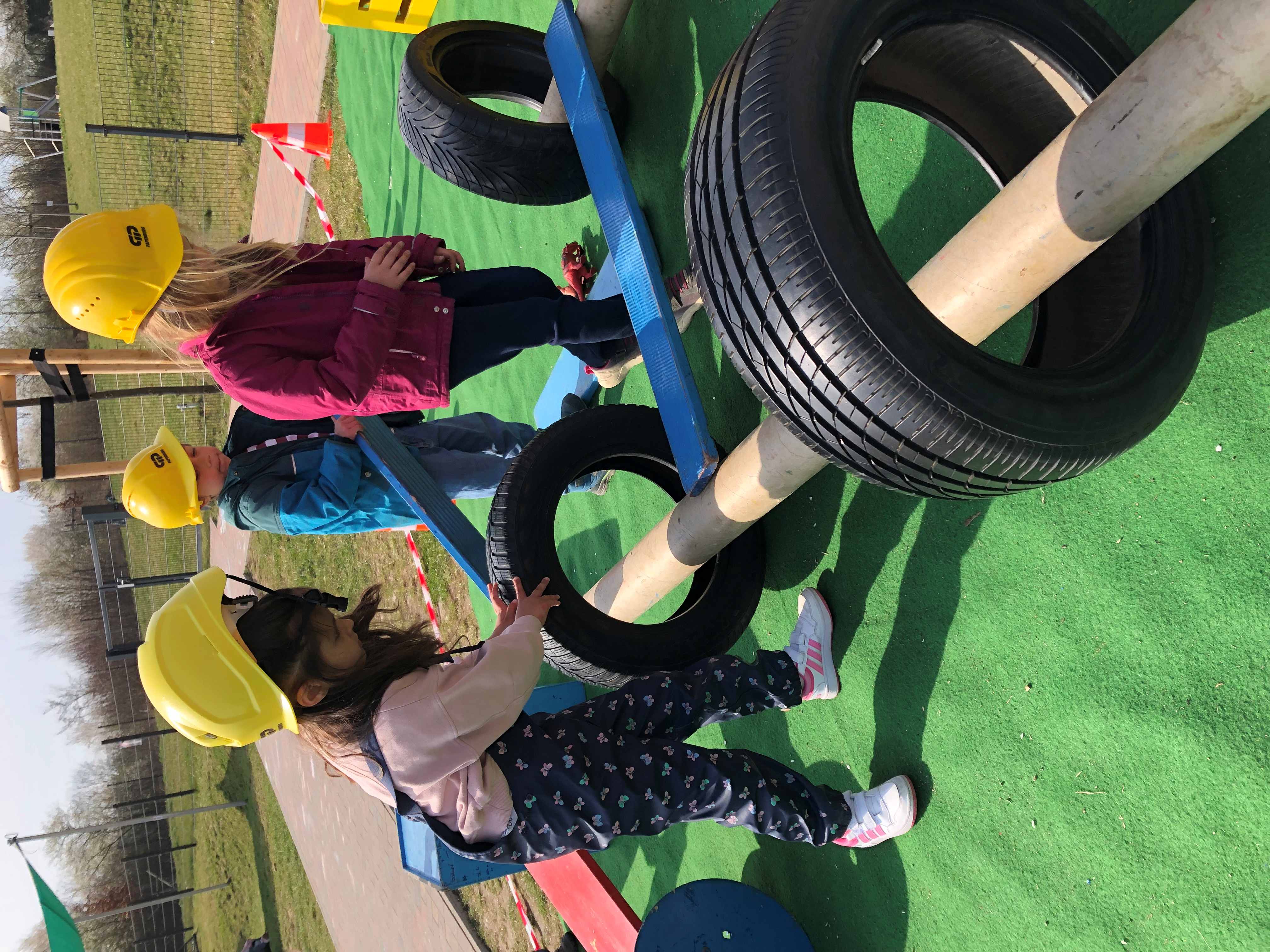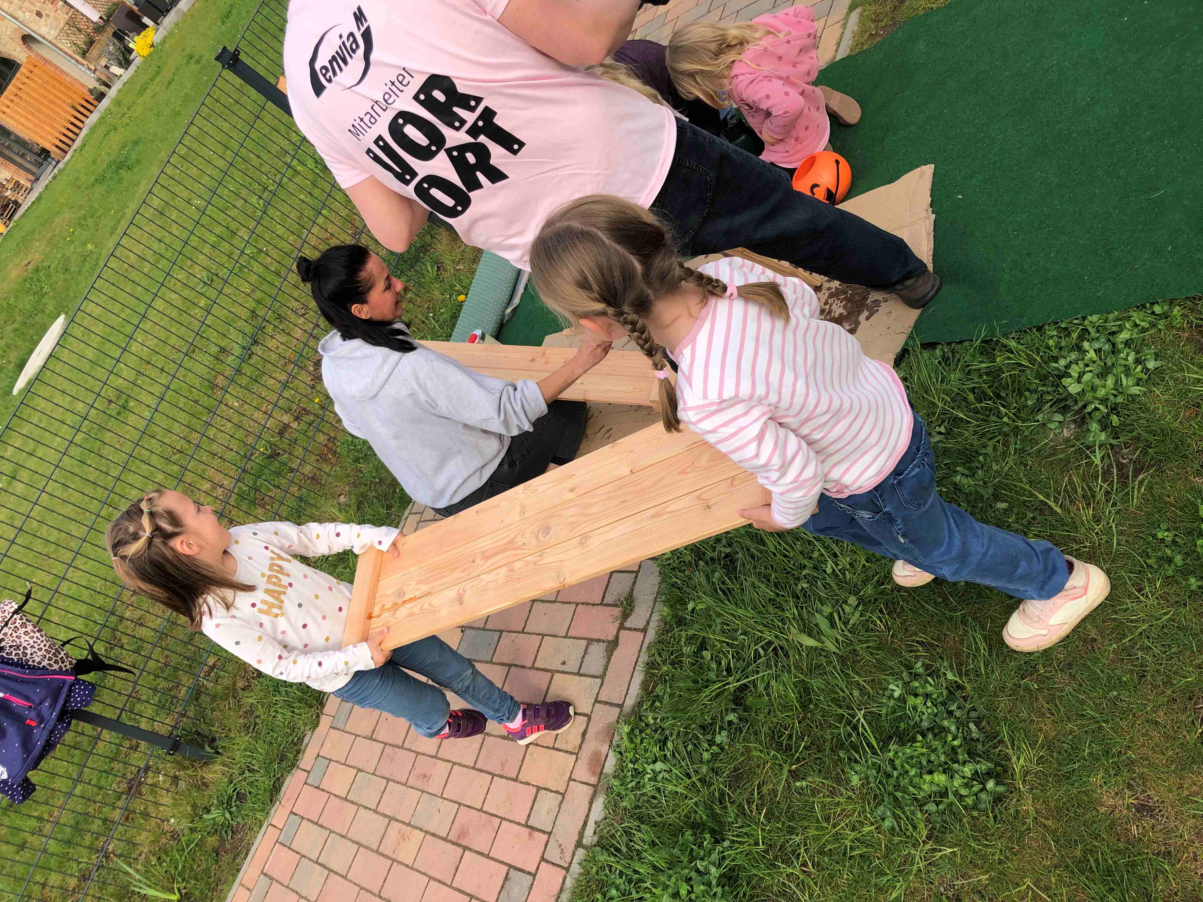 Ausdauernd und konzentriert arbeiten die Kinder auf der Baustelle, dabei müssen sie sich gut abstimmen, damit das Bauwerk erfolgreich zum Abschluss gebracht werden kann.
