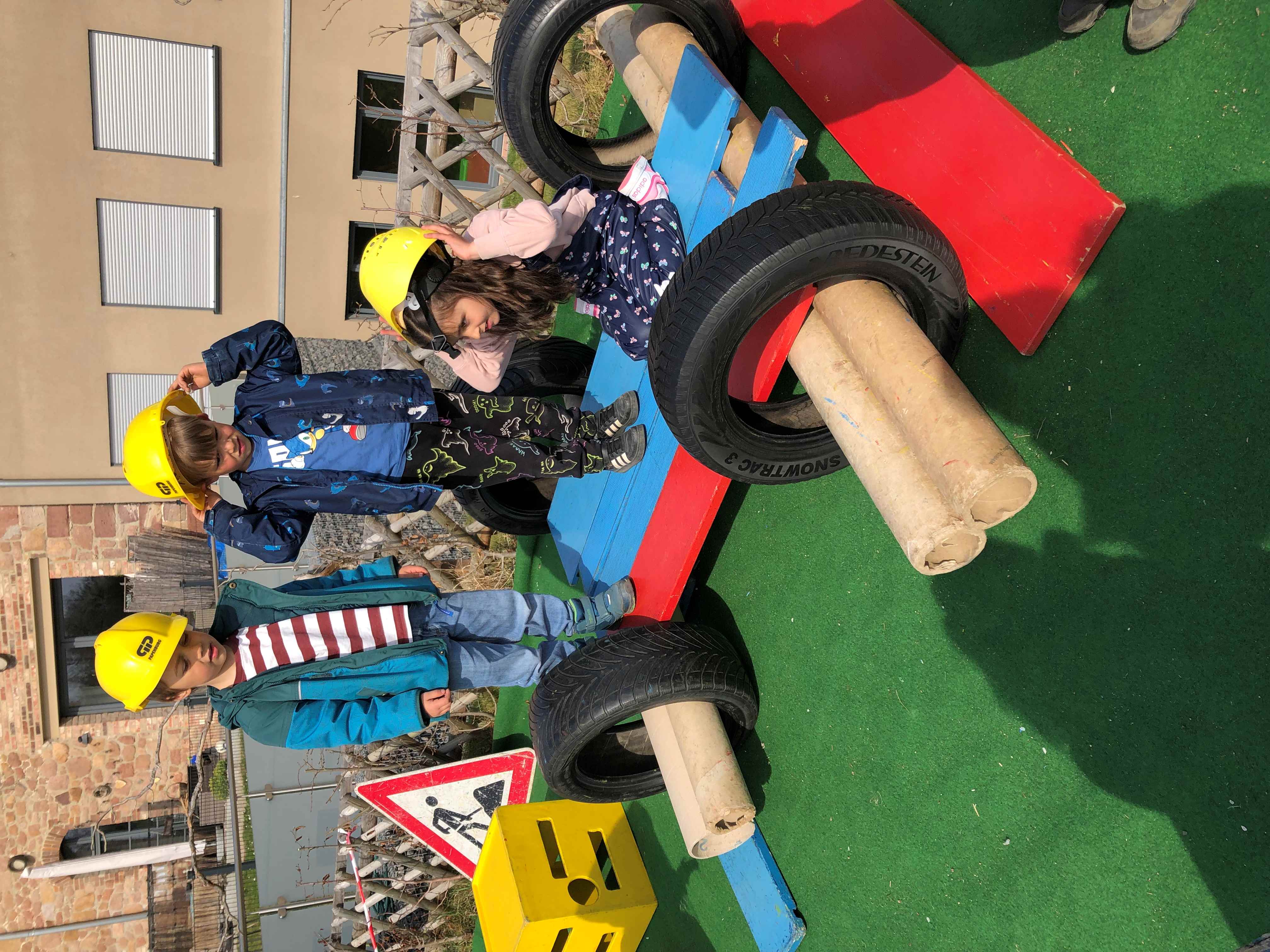Während einer Woche haben die Kinder die Möglichkeit, die Materialien, die sich in einem großen Anhänger befinden, auszuprobieren und im Großen zu konstruieren: es entstehen einfache Türme und komplexe Maschinen und Autos.