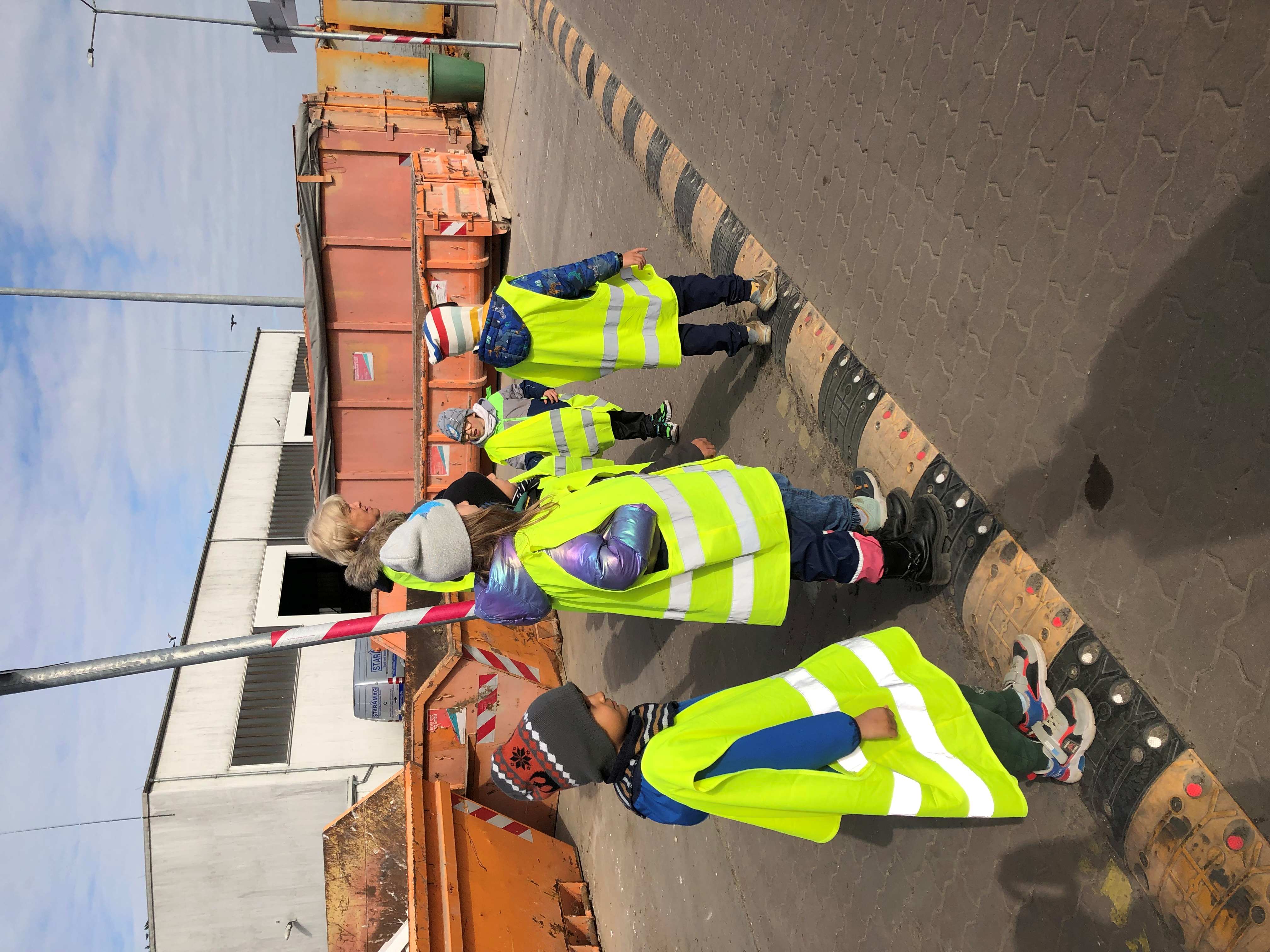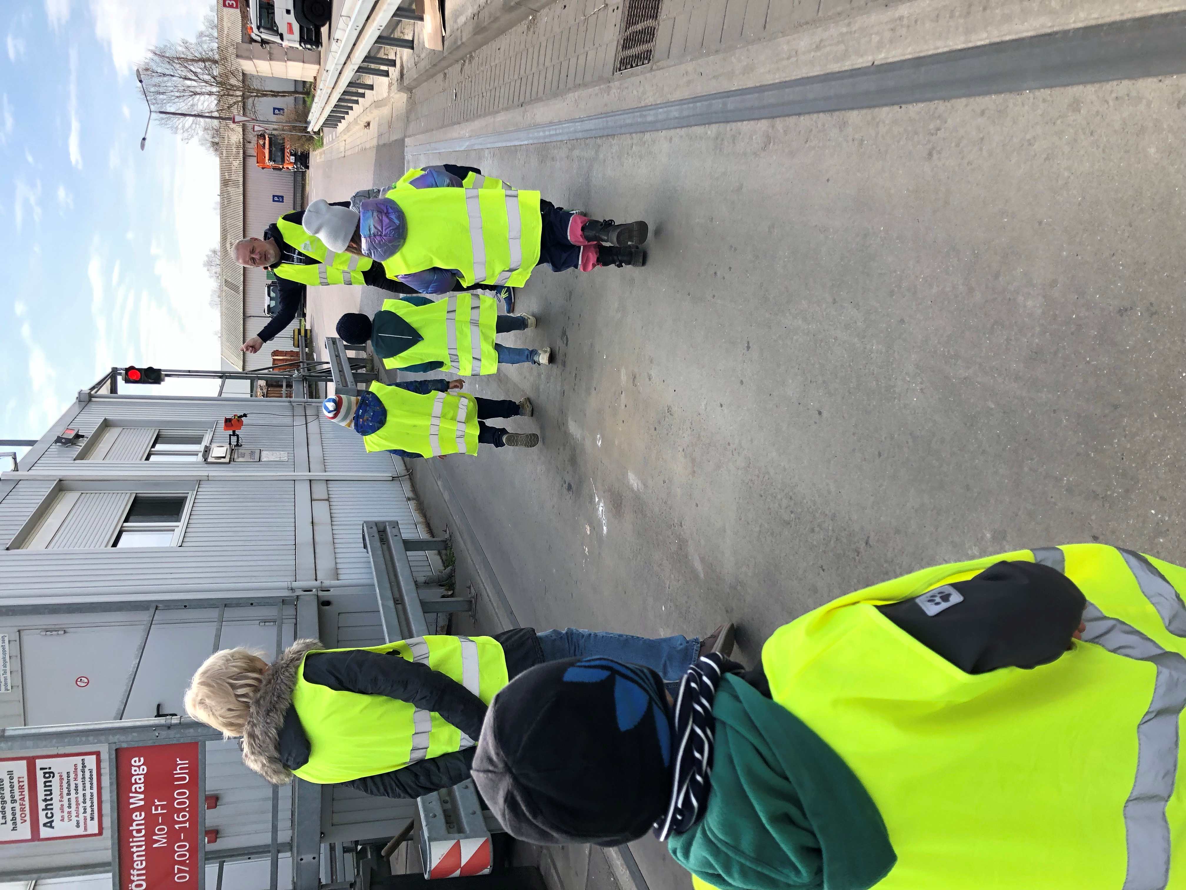 Angekommen, erhalten alle Kinder und Begleitpersonen eine neongelbe Warnweste, damit alle Mitarbeiter und Fahrer auf dem Wertstoffhof wissen, dass wir Besucher sind und Bereiche, in die man sonst keinen Einblick erhält, anschauen können.