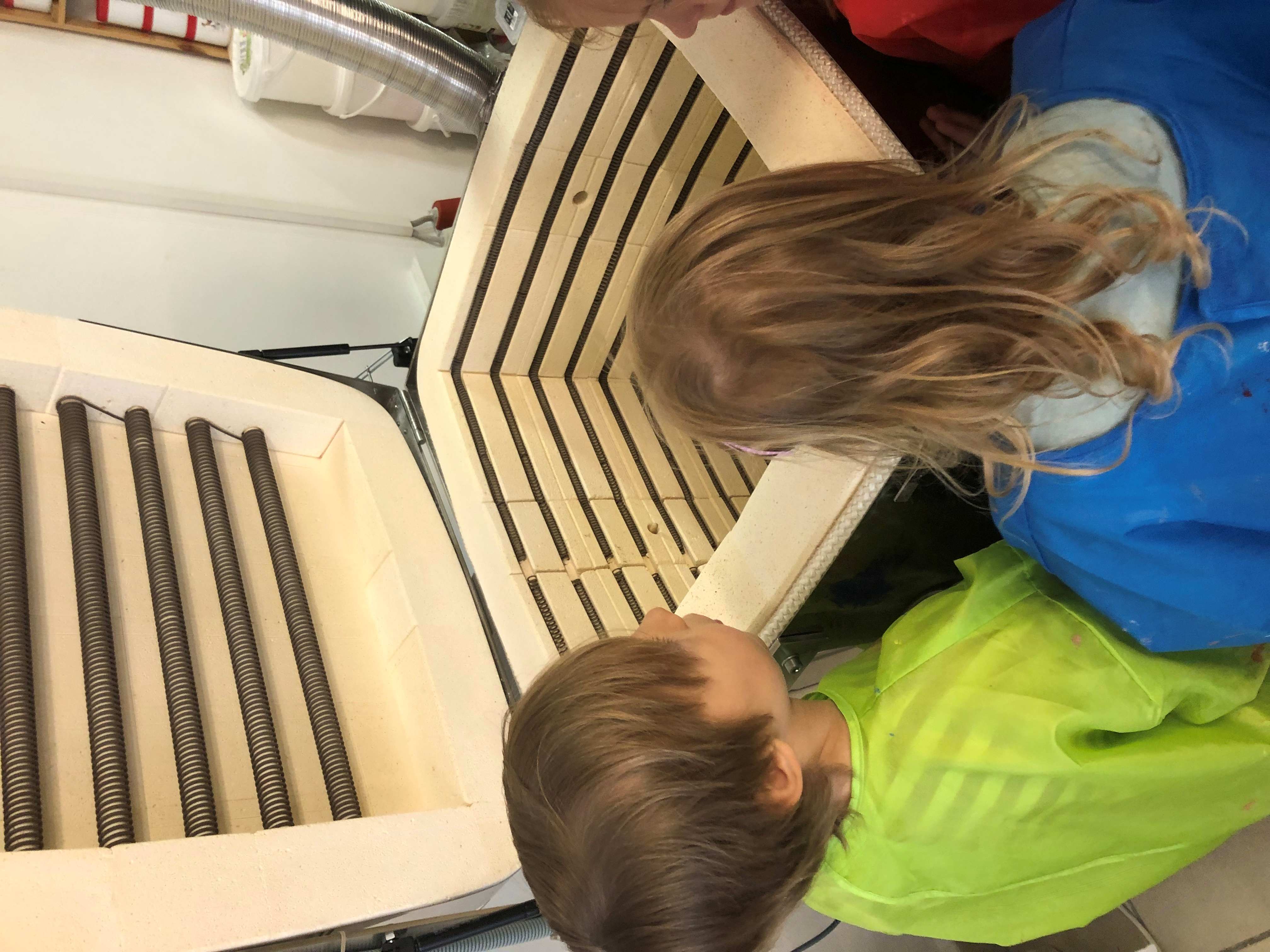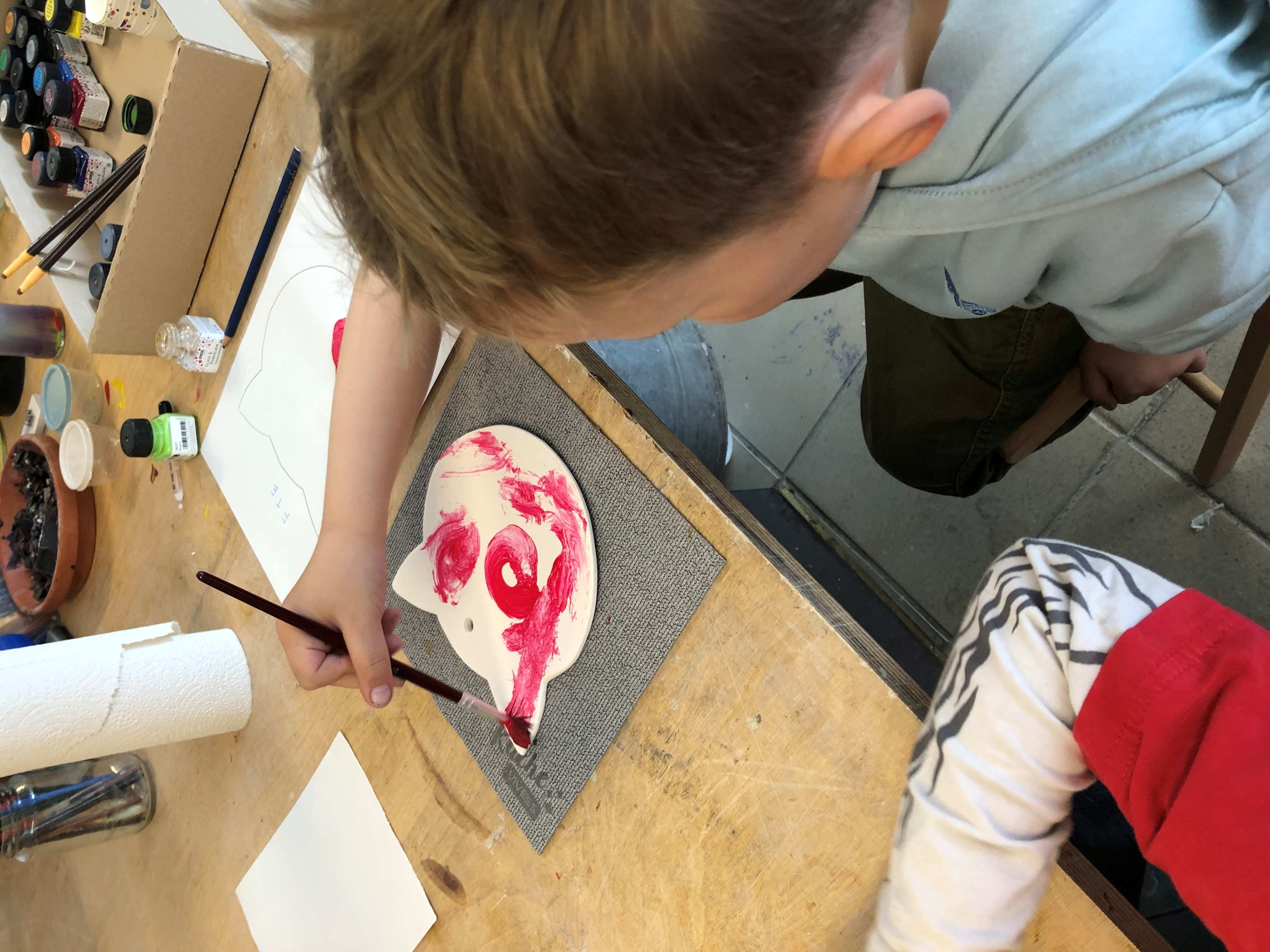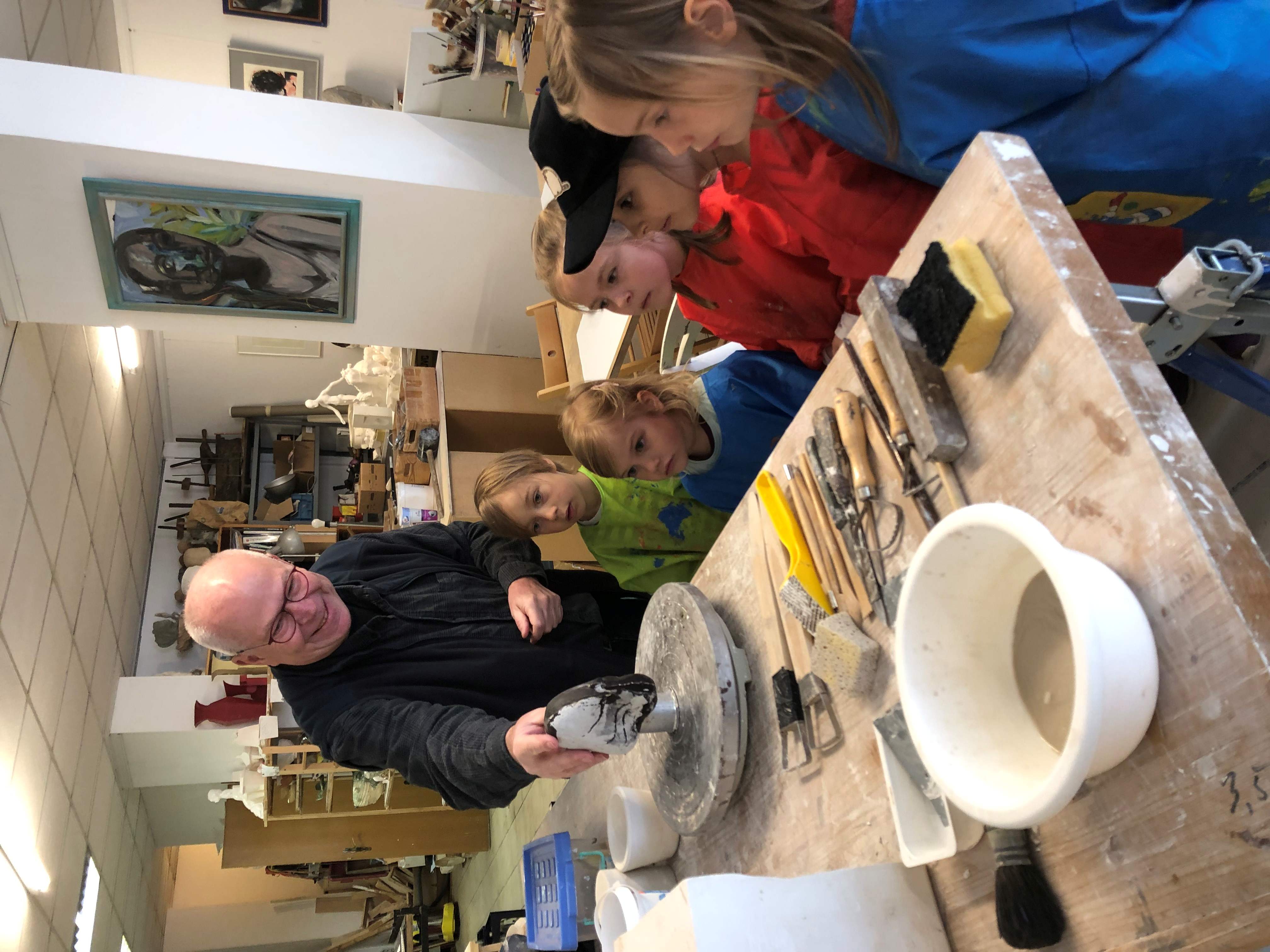 Nachdem Herr Alexander den Kindern sein Atelier und Arbeitsweise mit dem Werkstoff Porzellan erläutert hat, können sie sich selbst ausprobieren.