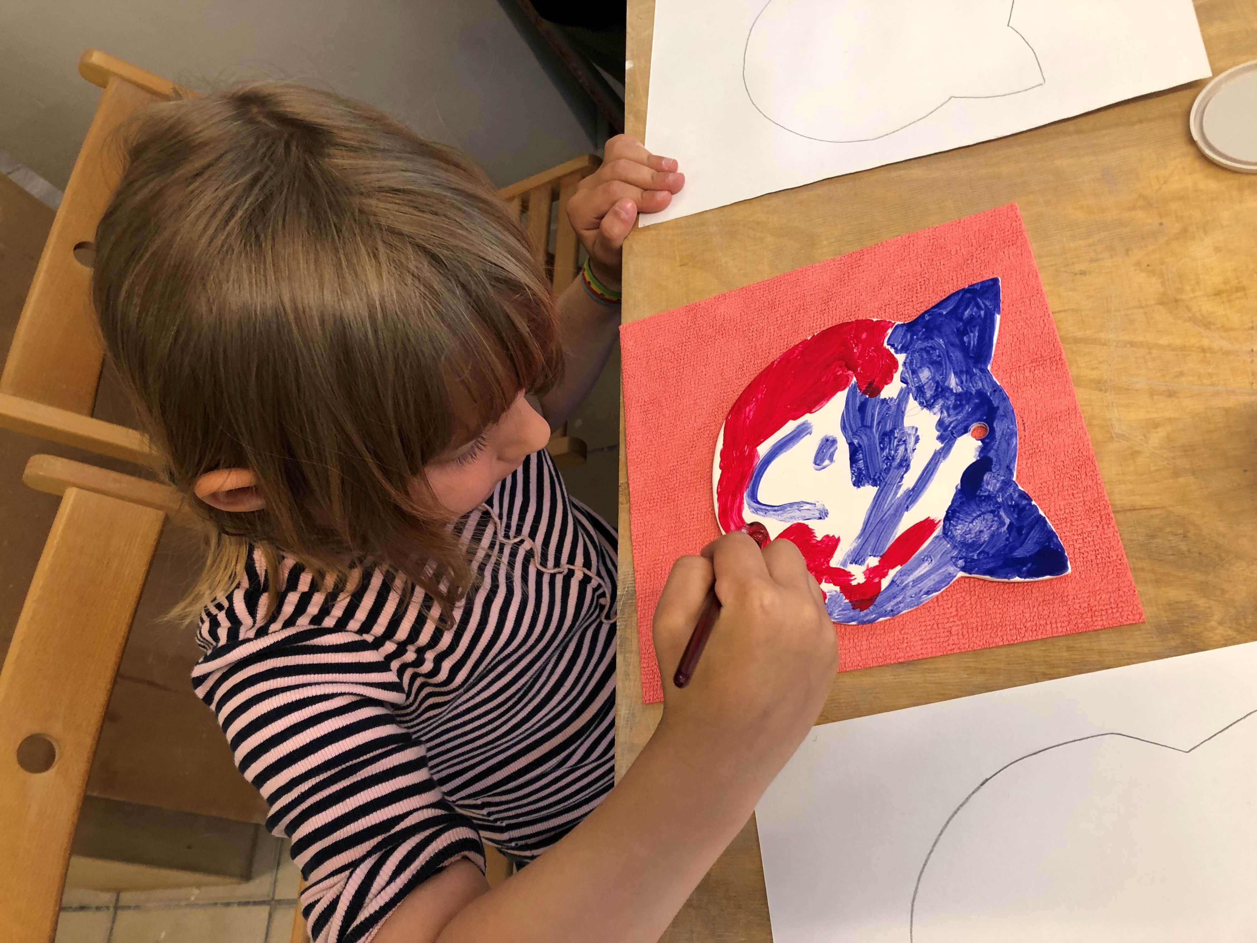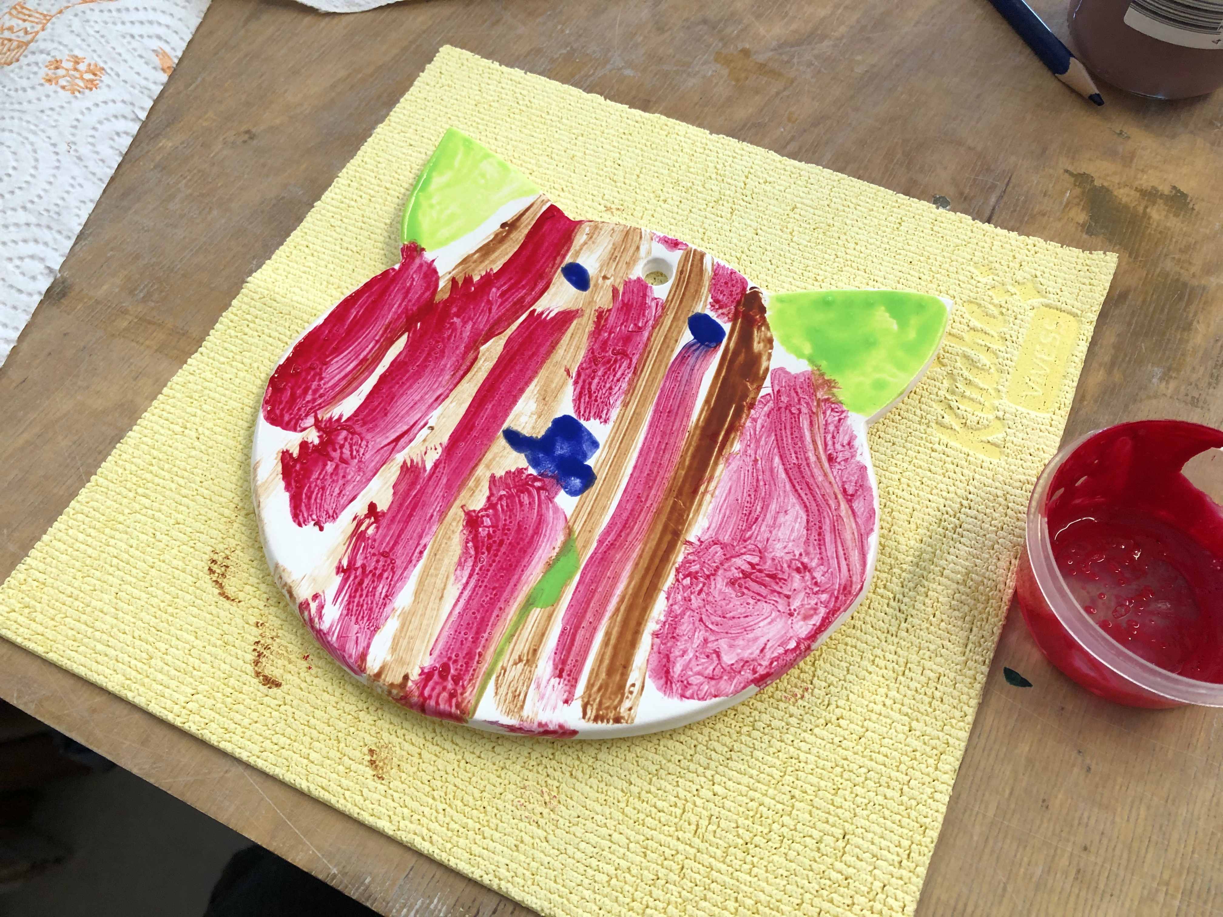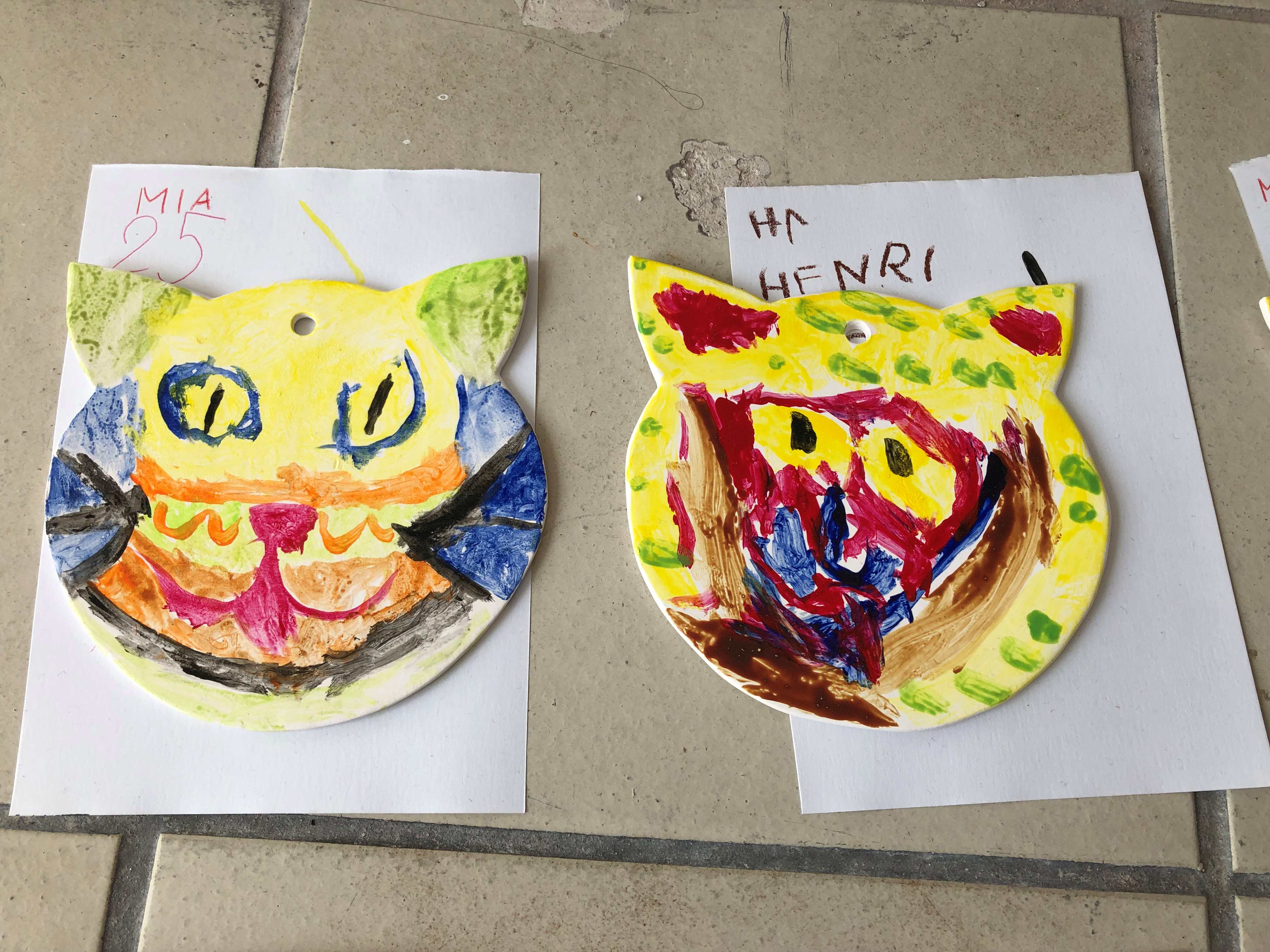 Als ersten Arbeitsschritt können die Kinder ihren Katzenkopf auf Papier malen. Im zweiten Arbeitsschritt bemalen die Kinder Porzellanplatten in Form eines Katzenkopfes. Diese müssen im dritten Arbeitsschritt gebrannt werden.