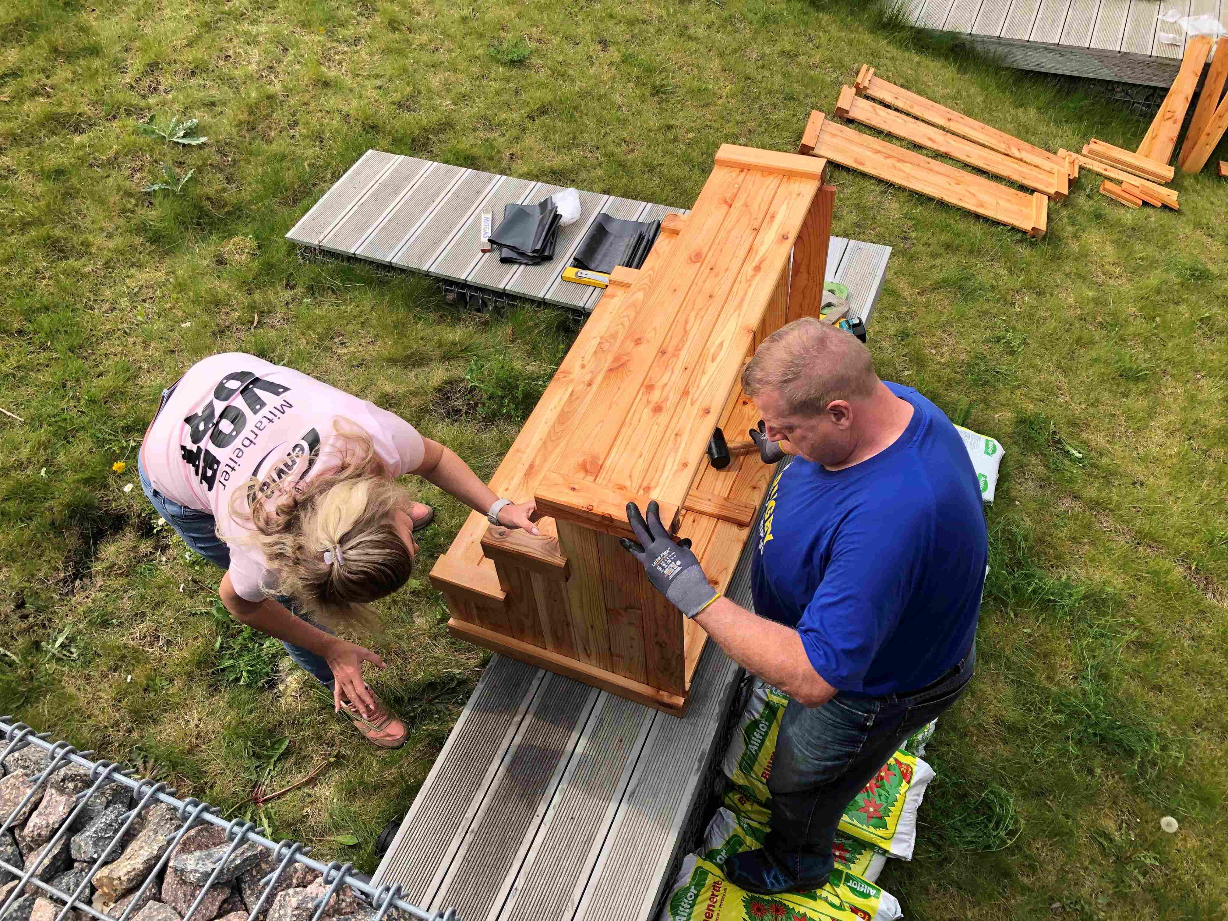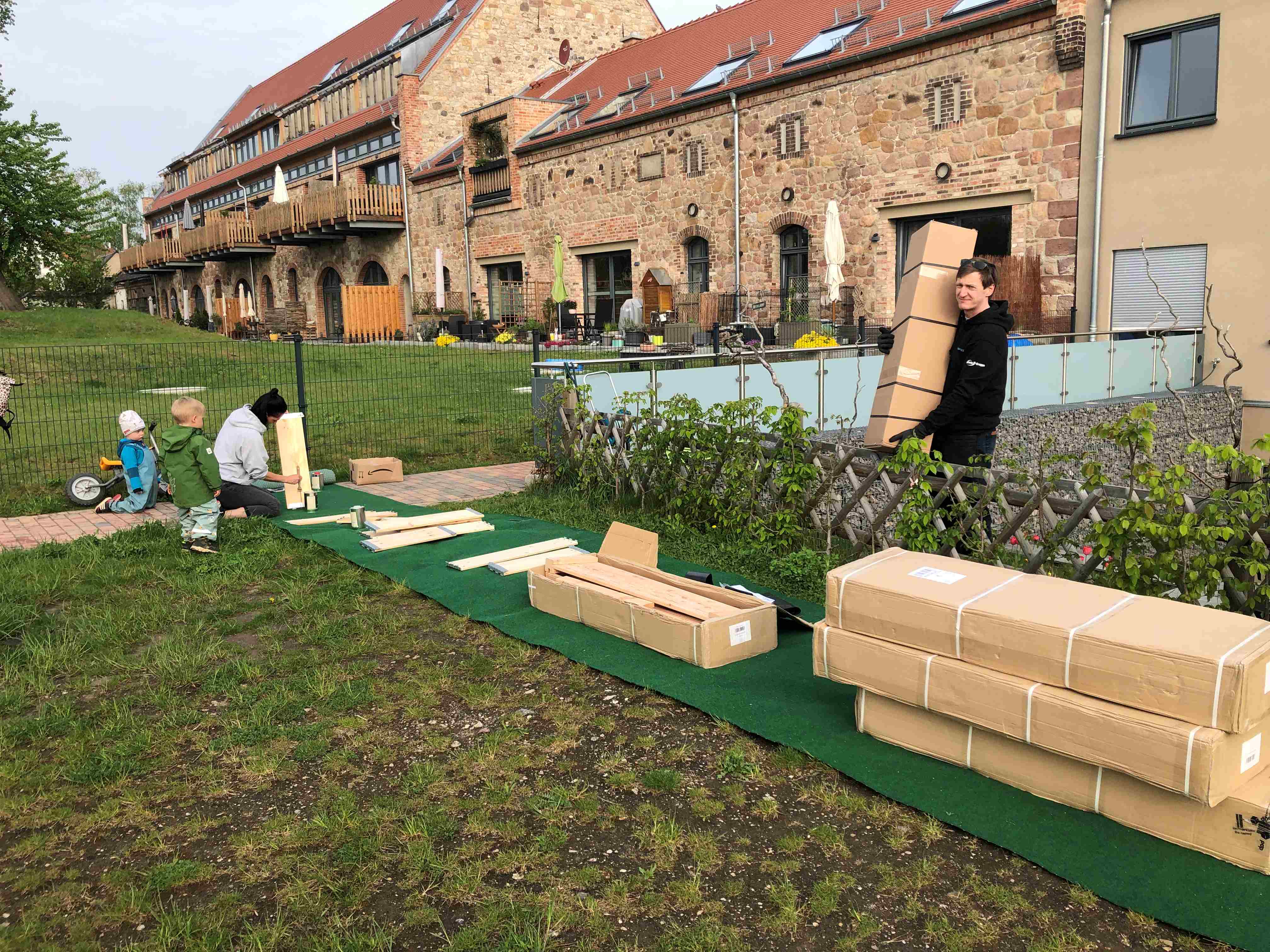 Am Ende des Tages stehen alle Hochbeete im Garten und warten nun darauf, mit Erde befüllt und bepflanzt zu werden.