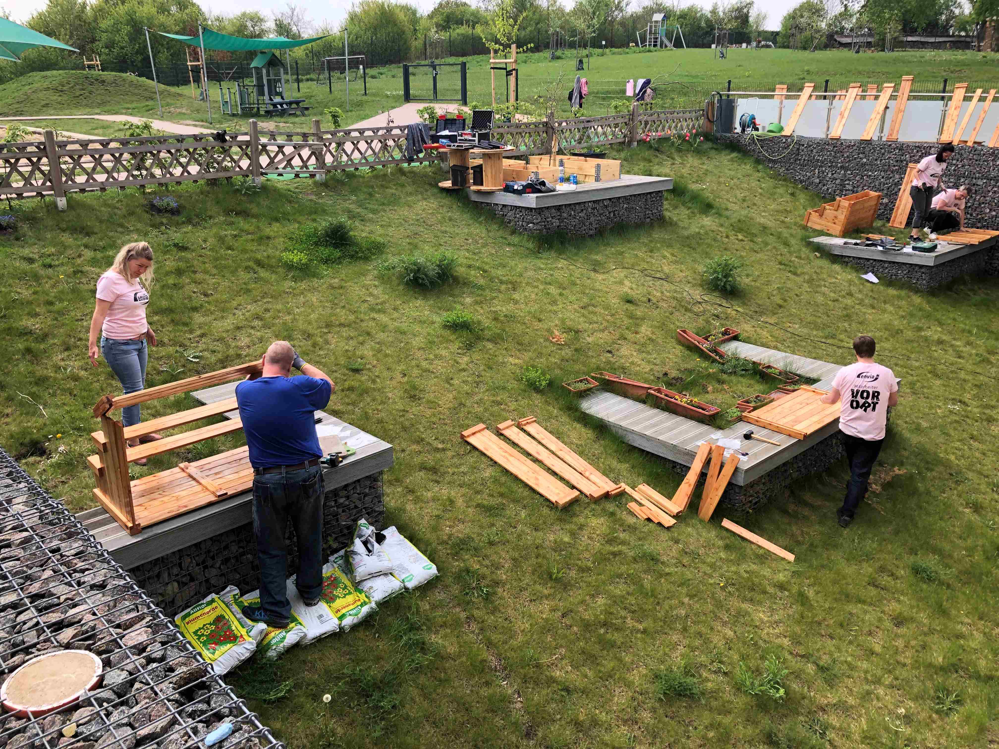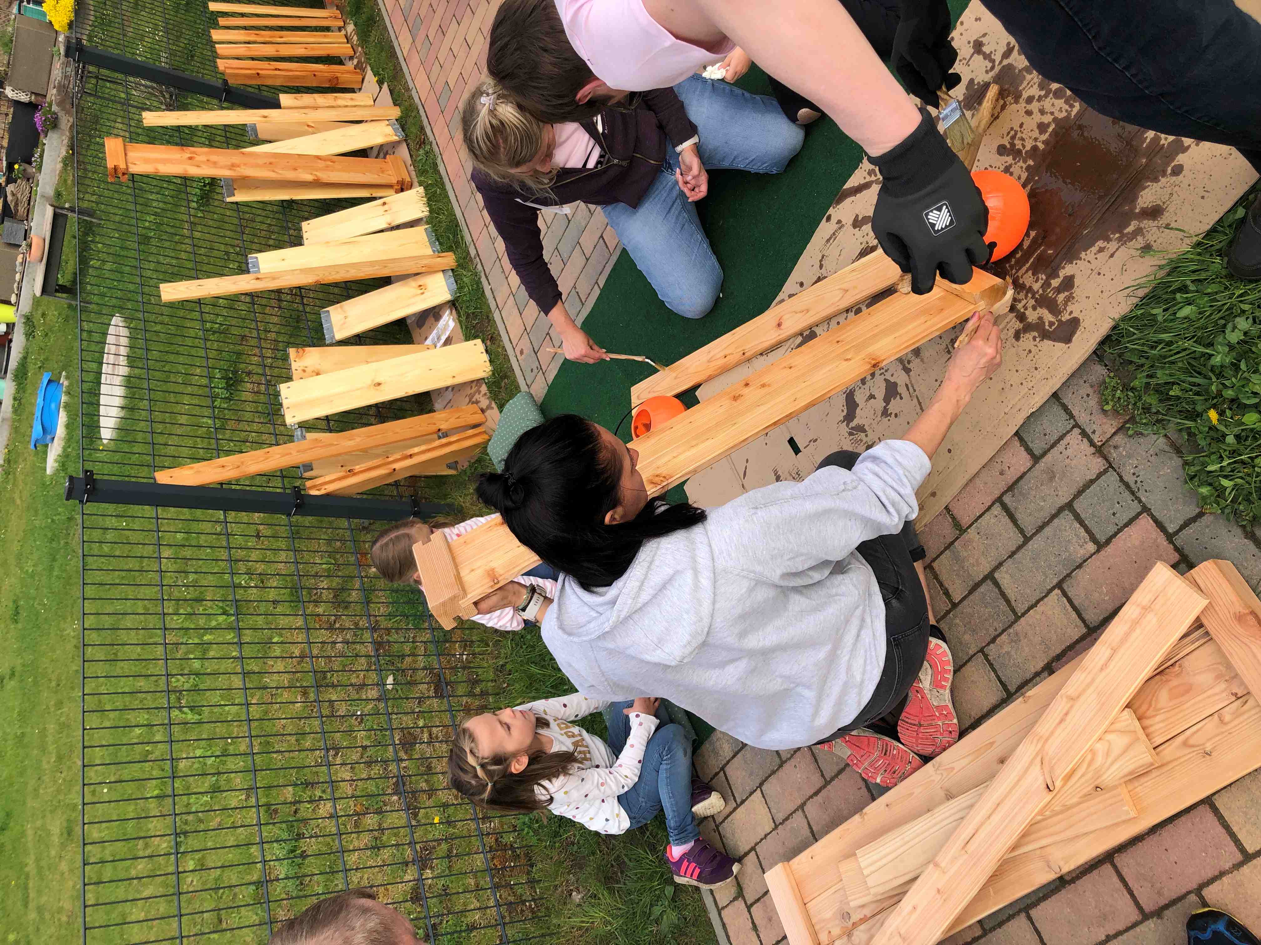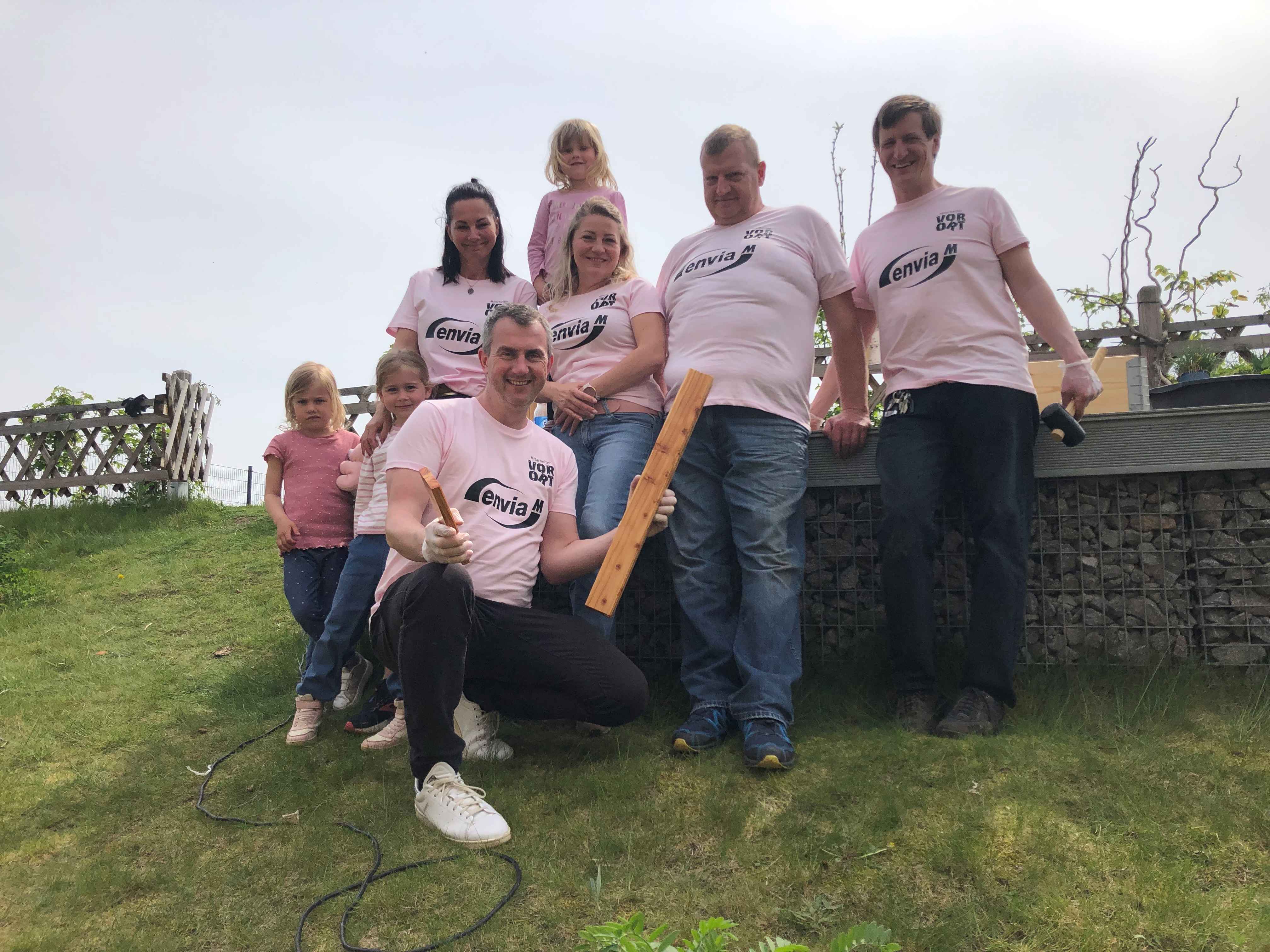 Danke einer engagierten Familie unterstützt uns das Unternehmen enviaM in der Gestaltung des Außengeländes mit einem Geldwert in Höhe von 1500€ sowie fünf Mitarbeitern, die uns tatkräftig beim Aufbau von vielen Hochbeeten helfen.