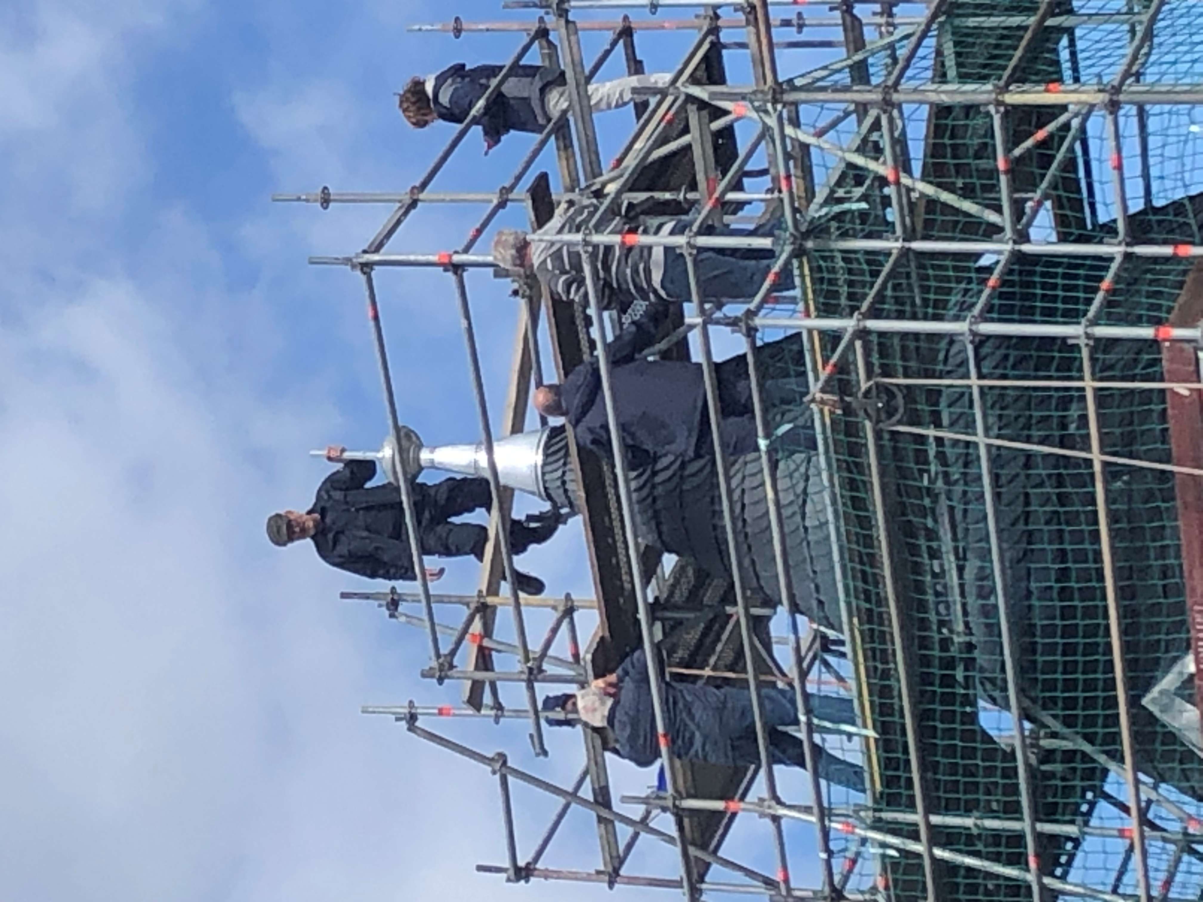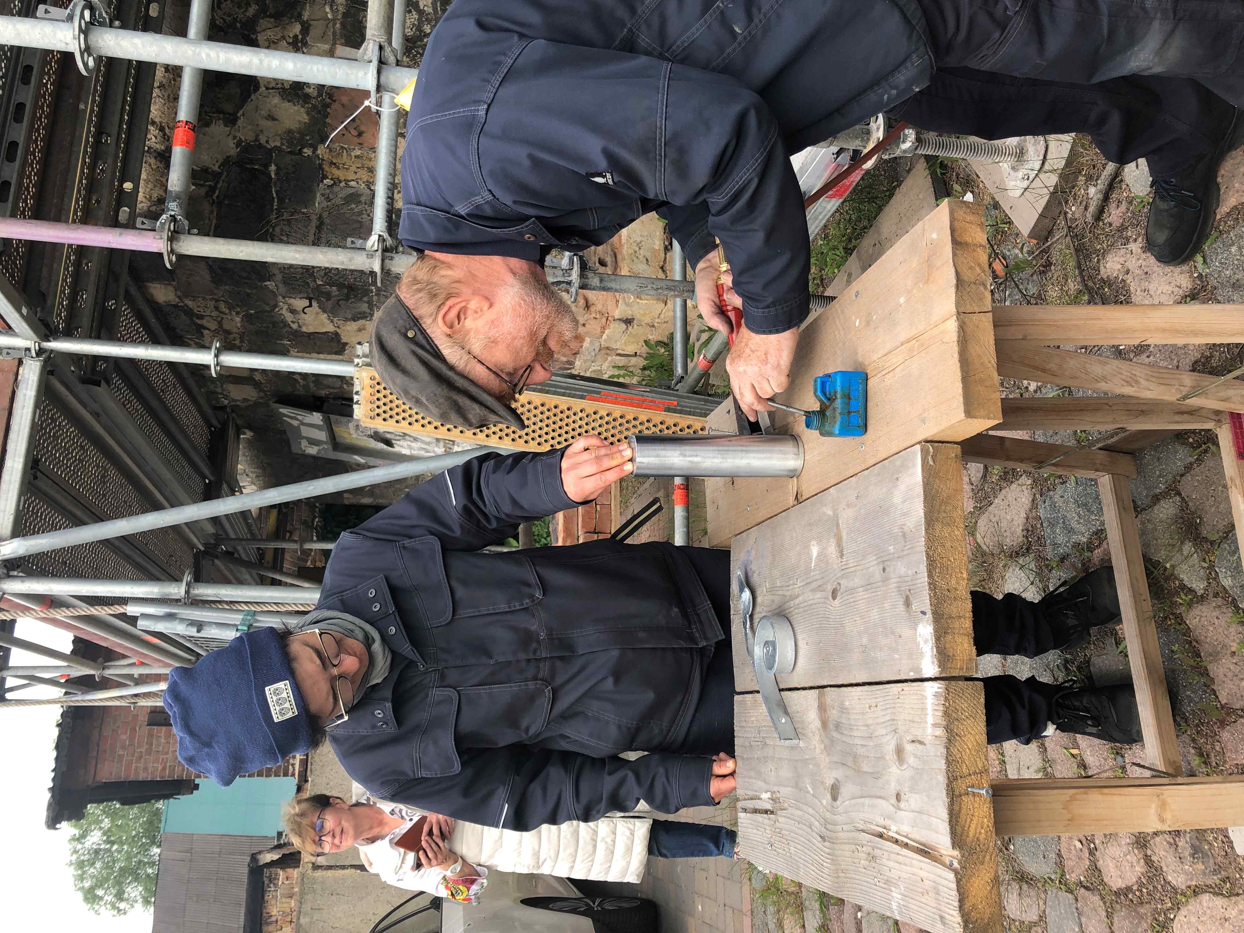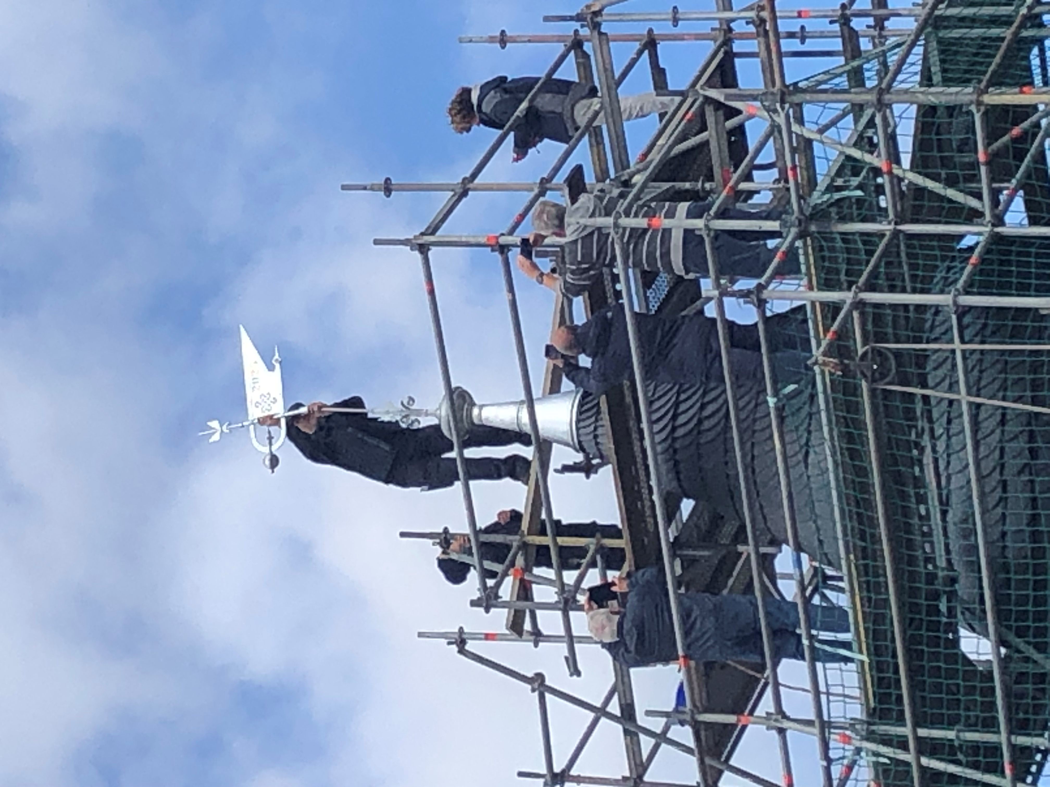 Wir haben beobachtet, wie Herr Otto, der Metallgestalter und sein Team, die Spitze auf den Turm angebracht haben.