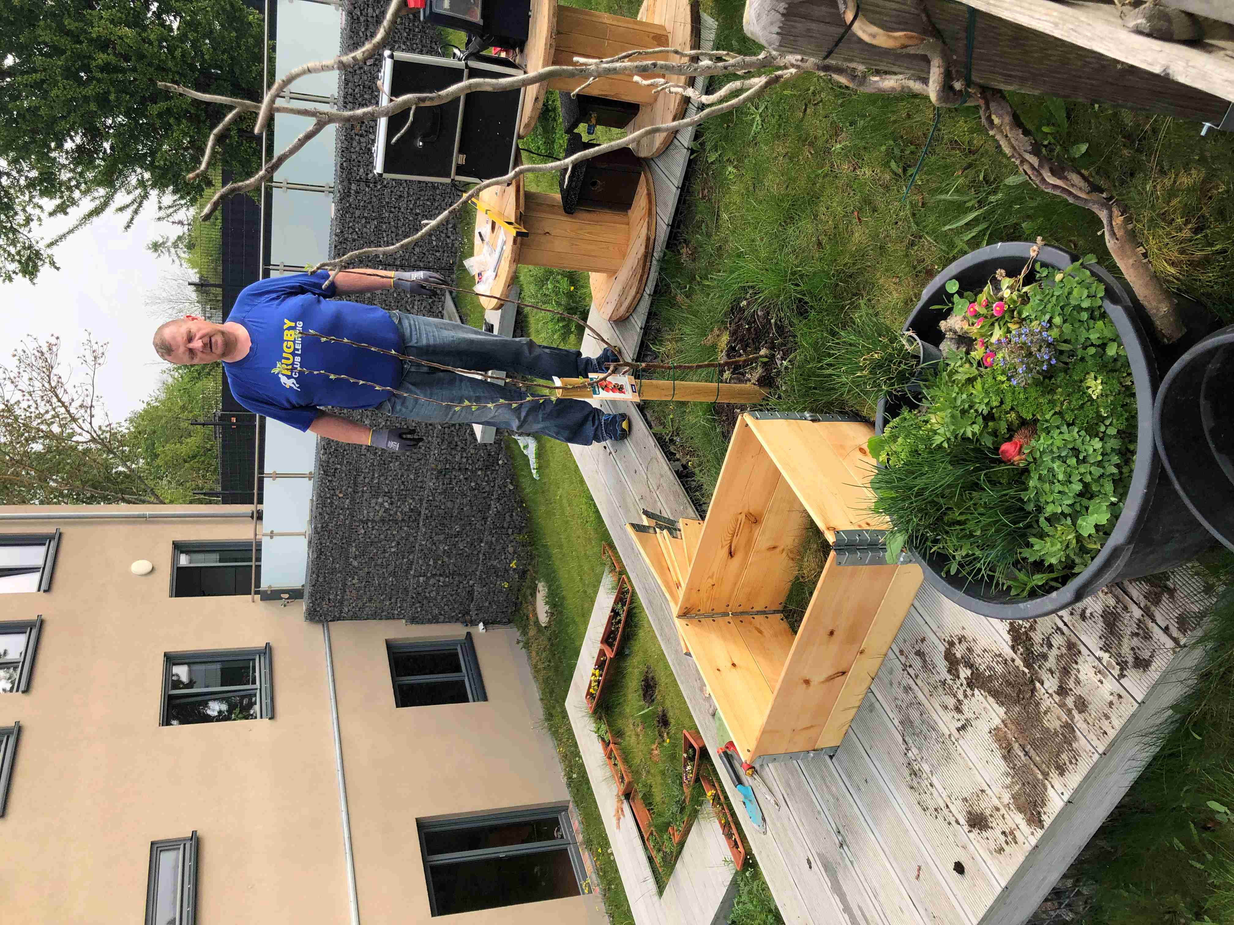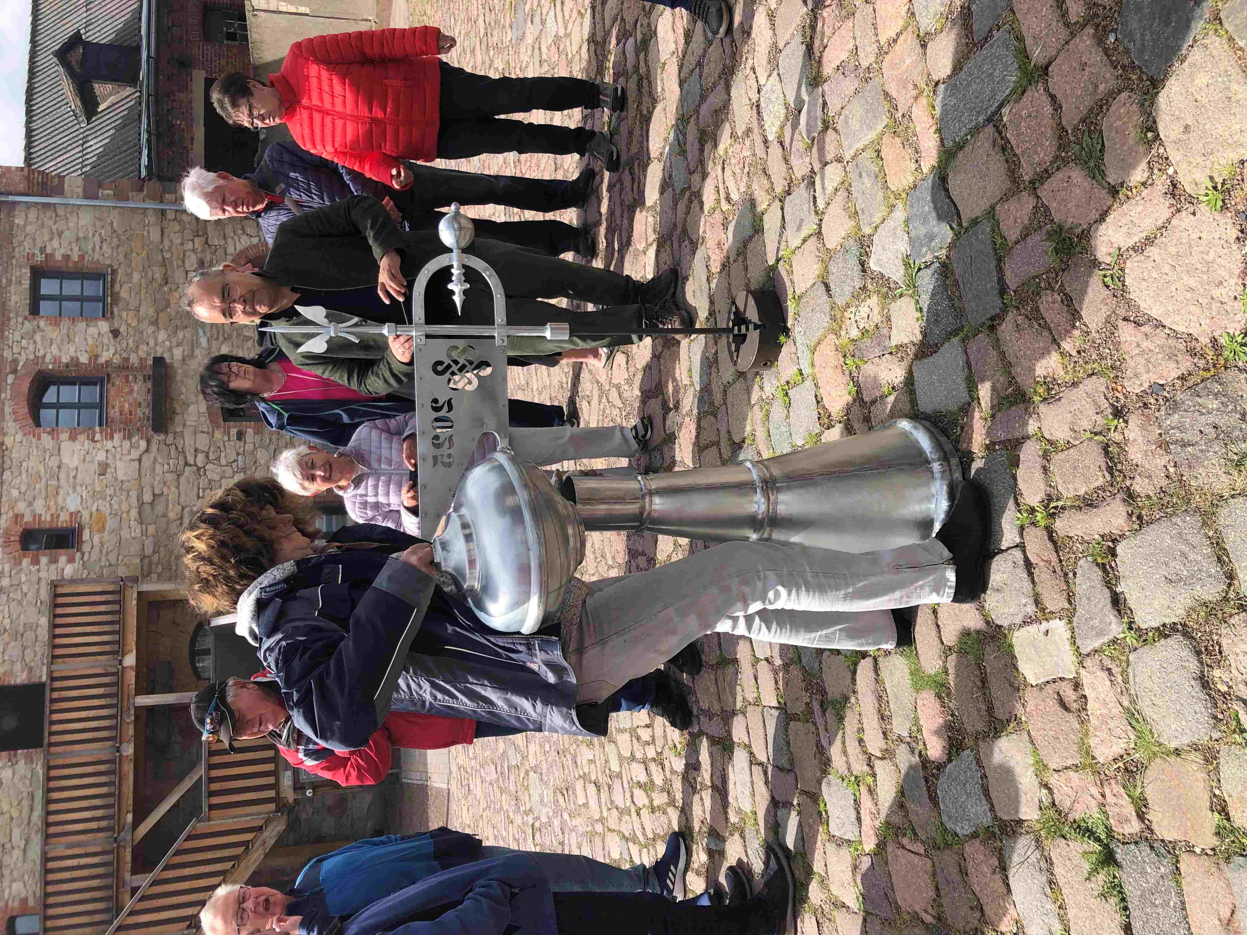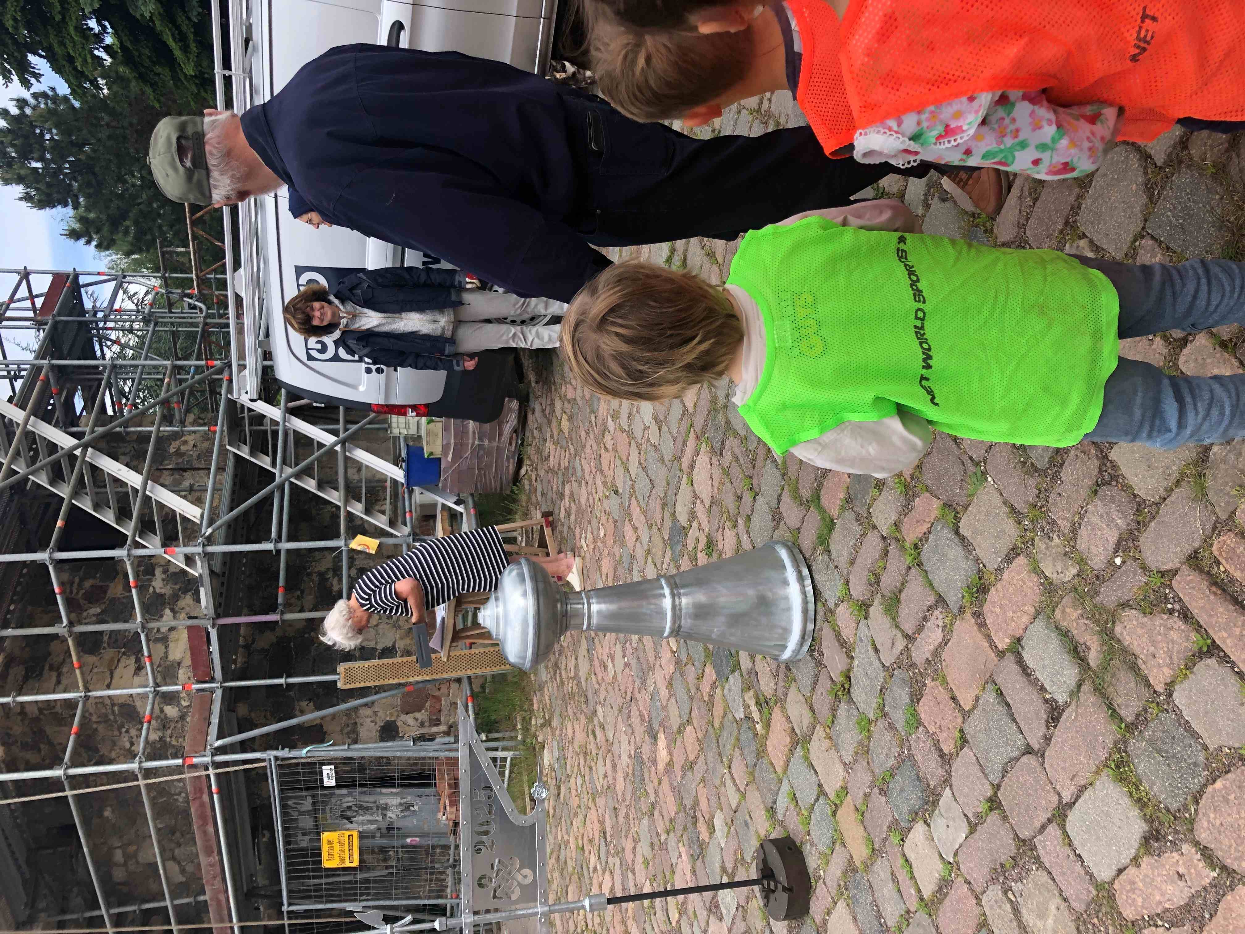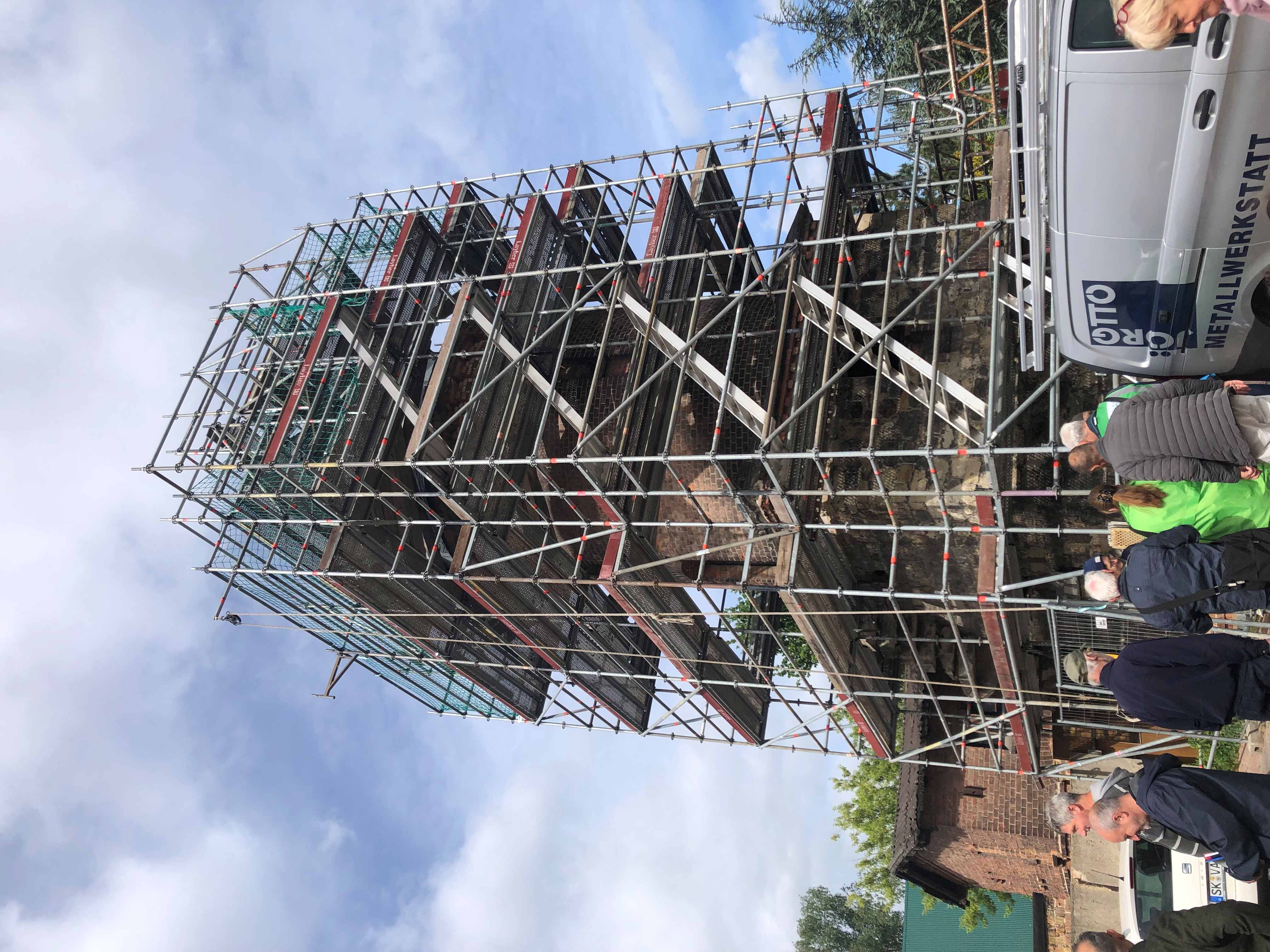 Wir haben beobachtet, wie Herr Otto, der Metallgestalter und sein Team, die Spitze auf den Turm angebracht haben.