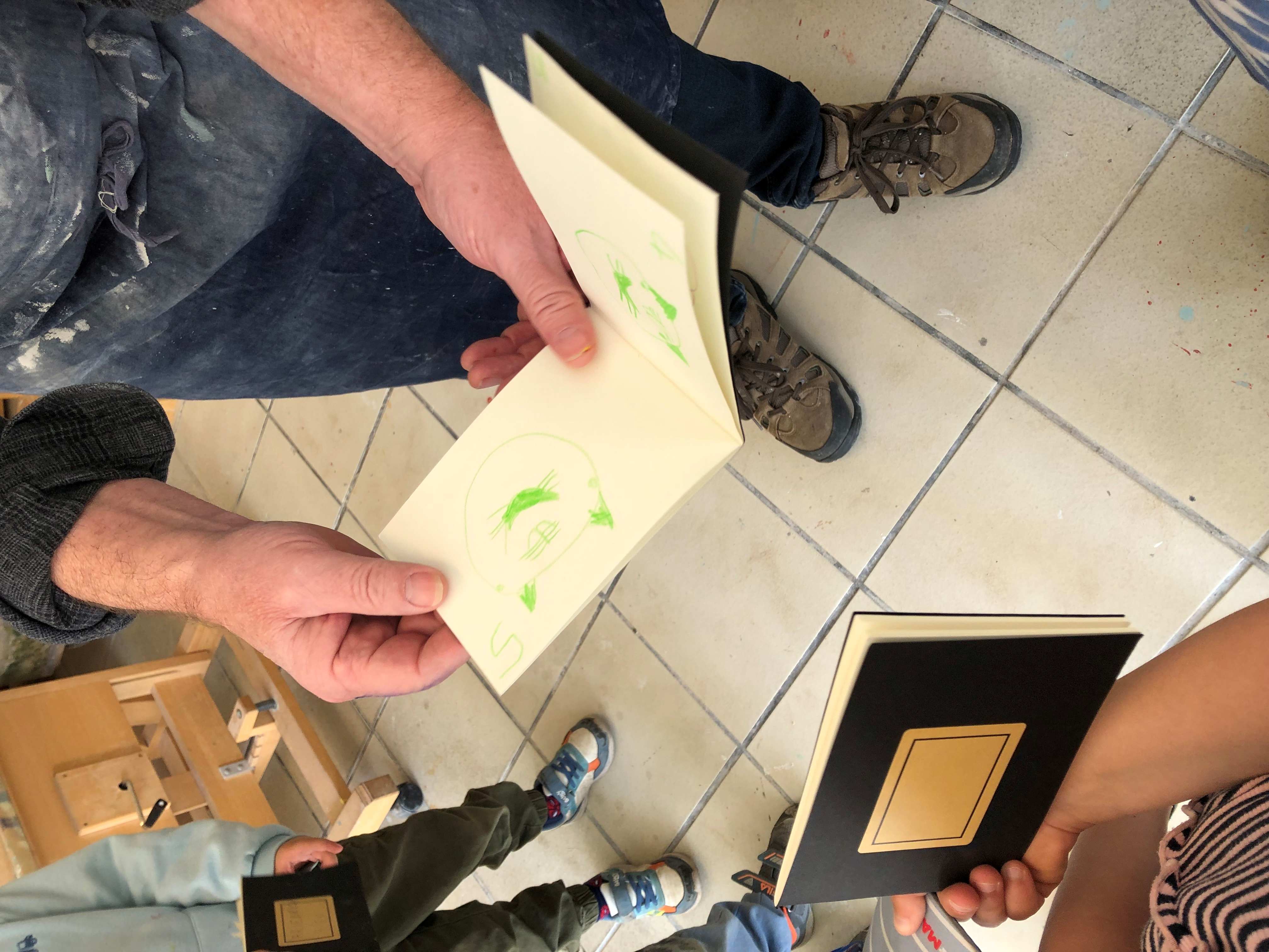 Damit sie auch nach der Kunststunde im Atelier kreativ sein können, hat ihnen Herr Alexander ein Skizzenbuch mitgegeben. In dieses können sie zu jederzeit ihre Ideen hinterlassen.