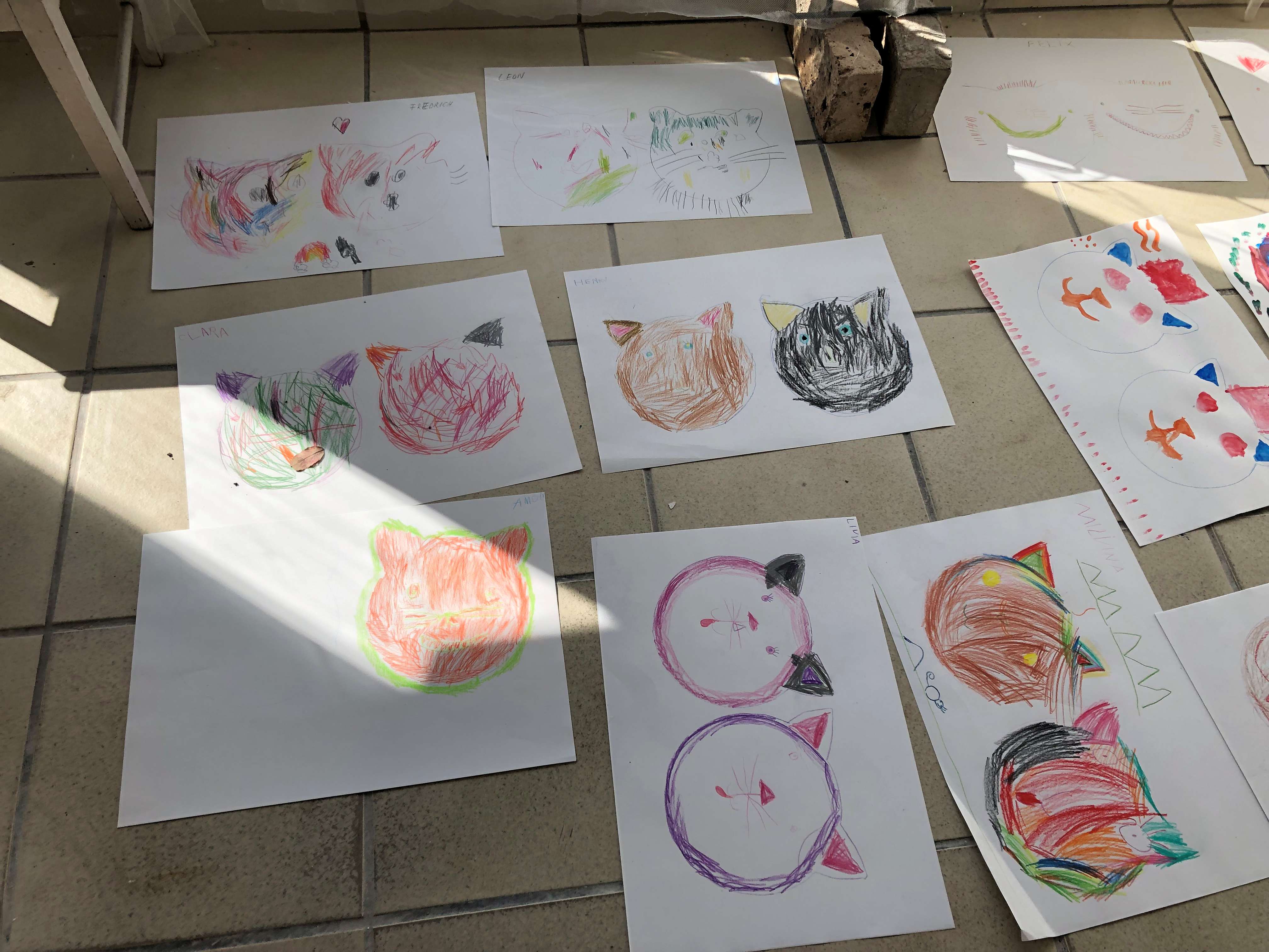 Als Hausaufgabe bekommen sie in kleines Skizzenbuch mit, in dem sie weitere Katzen-Köpfe malen oder zeichnen können.