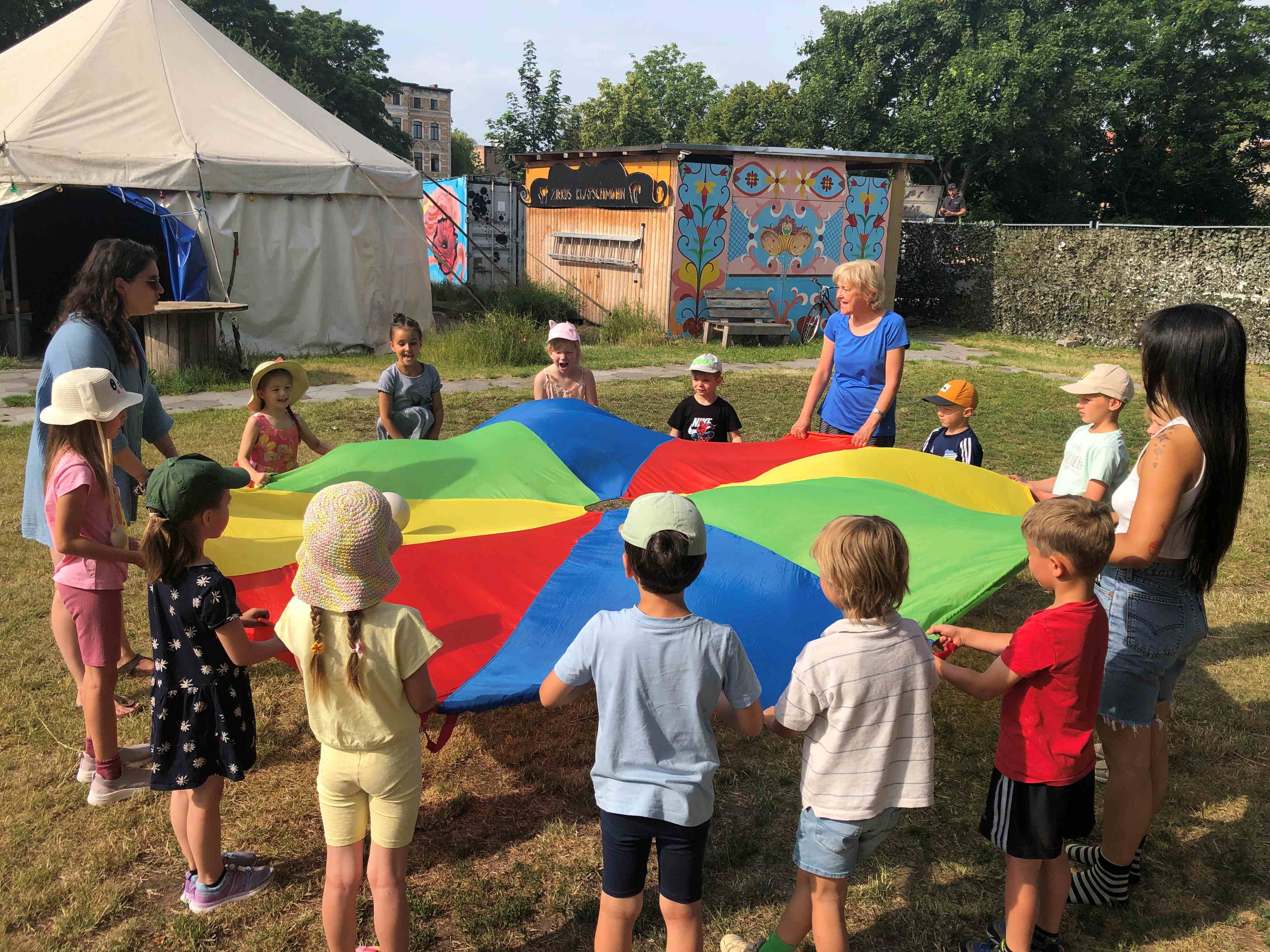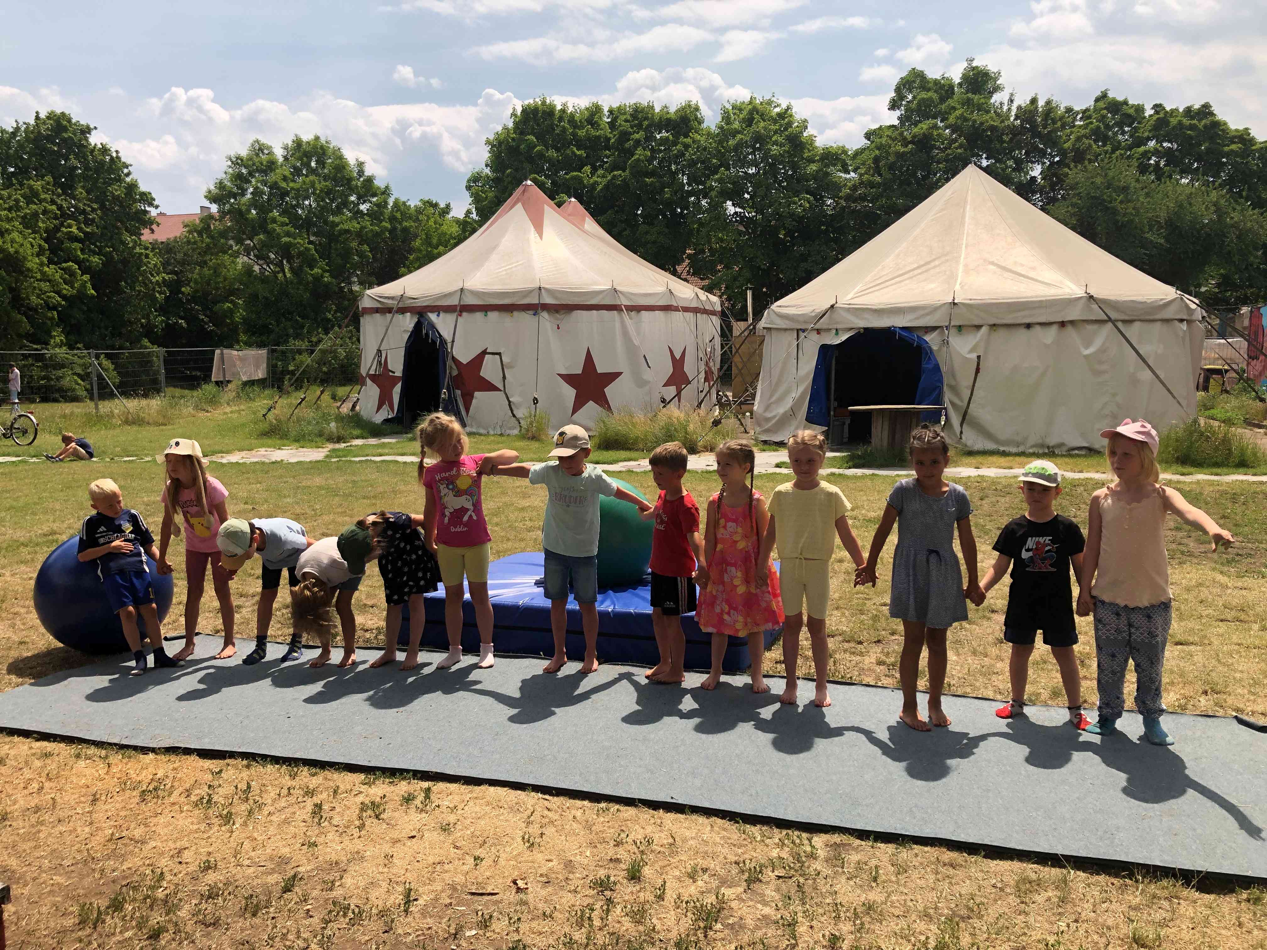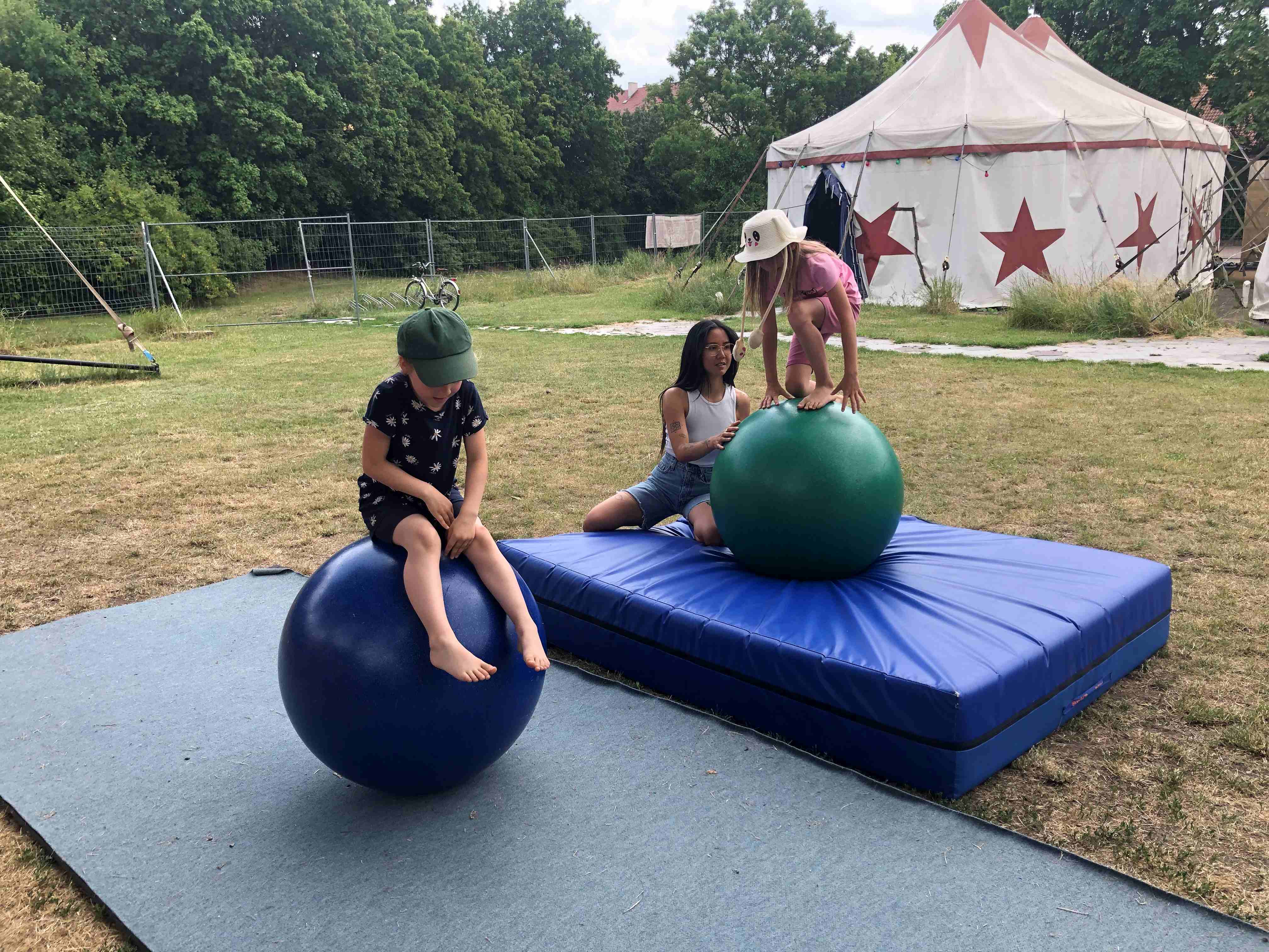 Als Abschluss-Ausflug der Vorschulgruppe verbringen die Kinder einen halben Tag auf dem Zirkusgelände und erproben die Luftanlage sowie die große Kugel.