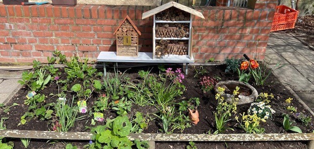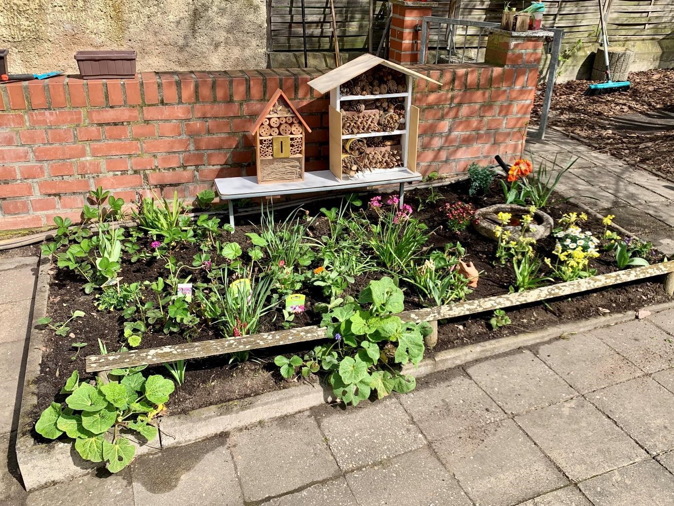 Bei herrlichstem Sonnenschein wurden die Beete gepflegt und bepflanzt. Und tatsächlich kamen bereits die ersten Bienchen zum Nektarsammeln.
