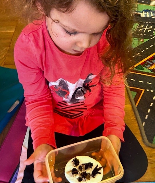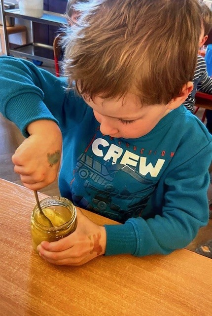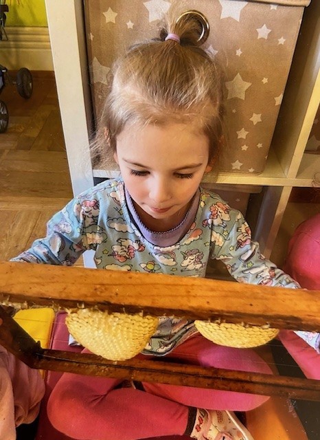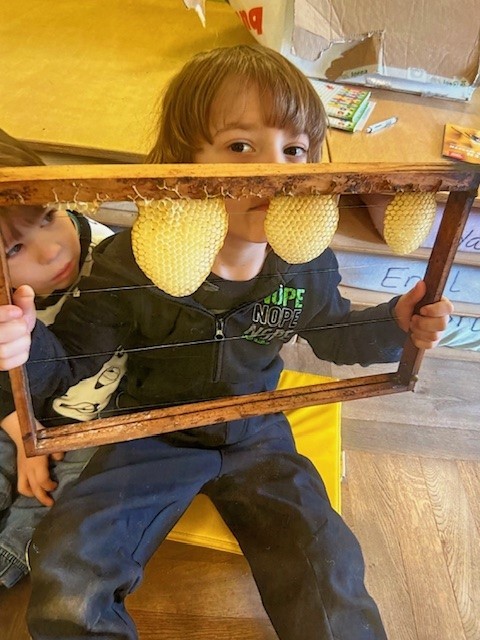 Die Bienenwelt zu entdecken, ist ein faszinierendes Thema. Viele neue Fragen kamen bei den Kindern auf. „Wo wohnen Bienen? Was essen Bienen?“ etc. Auch diesen Fragen sind wir auf den Grund gegangen. Wir schauten uns einen Bienenstock an, von innen und außen und entdeckten die vielen kleinen Waben und ihre Gerüche.