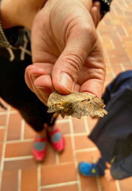 Auf unserer Terrasse entdeckten wir einen kleinen Besucher „eine kleine Biene“. Neugierig wurde sie von allen Kindern beobachtet. Nach diesem Erlebnis ging die große Bienensuche im Garten los.