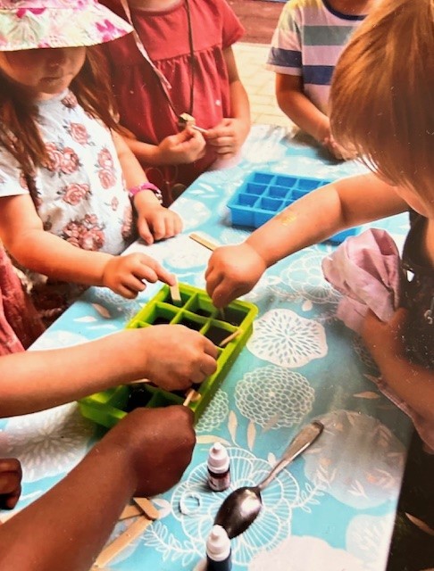 Auf dem Tisch stehen Lebensmittelfarben, zwei Silikonformen für Eiswürfel, Holzstiele und eine Kanne mit Wasser. Hellena, Emilia und Fadhuma hören Frau Kunze genau zu, was sie heute anbietet. Emilia hält ein Holzstäbchen in der Hand und wartet ab, was sie machen kann. Frau Kunze füllt in die Silikonform Wasser hinein. Alma, Fadhuma und Hellena haben die Farben ausgesucht, die dann in das Wasser getropft werden. Eins, zwei und drei Tropfen kommen hinein. Nun können die Kinder ihr Holzstäbchen nacheinander in die Form stecken. Auf geht es zum Gefrierfach, wo sie nun gefrieren müssen, die Eiswürfel.