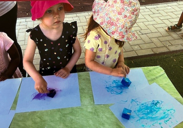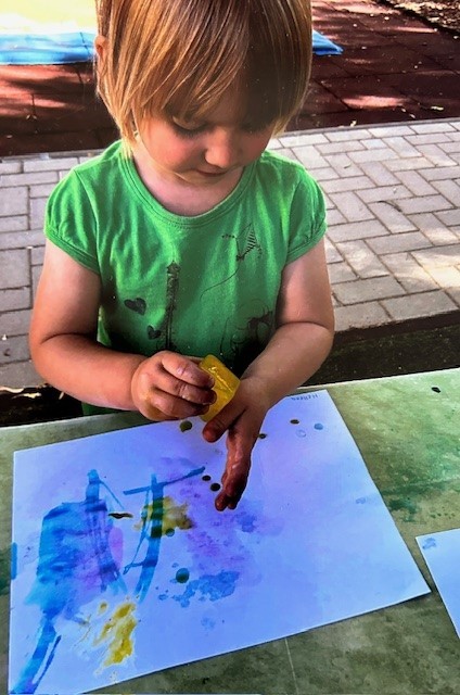 Auf dem Tisch liegen nun weißes Papier und die gefärbten Eiswürfel. Die Kinder werden gefragt, was man damit machen kann. Mara antwortete, dass man damit vielleicht malen kann. Silas und Alma suchen sich die Farben selbst aus. Alma möchte die Farbe Lila, aber nur die Eiswürfel mit dem Stiel, da ihr die anderen zu kalt sind. Silas entscheidet sich für gelb und grün. Beide Kinder führen den Eiswürfel über das Blatt und sind total begeistert, was da so entsteht. Mara und Emilia kommen dann auch noch hinzu und gestalten ihr Bild. Hellena nimmt die Eiswürfel ohne Stiel. Sie möchte das gefrorene Eis komplett spüren, mit allen Sinnen. Sie lässt den Eiswürfel über ihren Daumen gleiten und schaut genau hin was passiert. Das Eis tropft auf ihr Blatt und Hellena äußert: „Oh ist das kalt“.