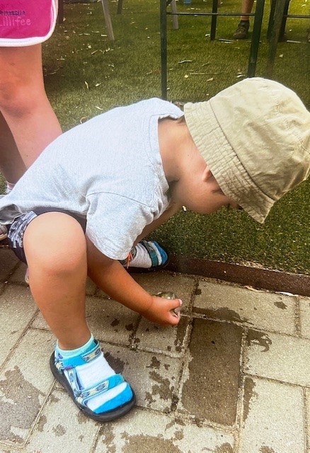 Hellena, Stephanie und Greta sind gespannt was sich in der Form versteckt. Es sind gefrorene Eiswürfel mit Filly Pferden und Dinosauriern. Die Kinder haben die Aufgabe sich Gedanken zu machen, wie komme ich am besten an das Spielzeug. Alma nimmt sich den Eiswürfel in die Hand und führt ihn zum Mund und beginnt an ihm zu lecken. Luise beobachtet Alma und übernimmt die Idee. Silas geht mit einem Eiswürfel zu den Steinen und bewegt ihn darauf hin und her, so dass er sich schneller auflöst, um an den Dinosaurier zu gelangen. Hellena geht zum Trampolin auf die weichen Matten und versucht dort an das Filly Pferd zu kommen, durch die Wärme der Sonne.