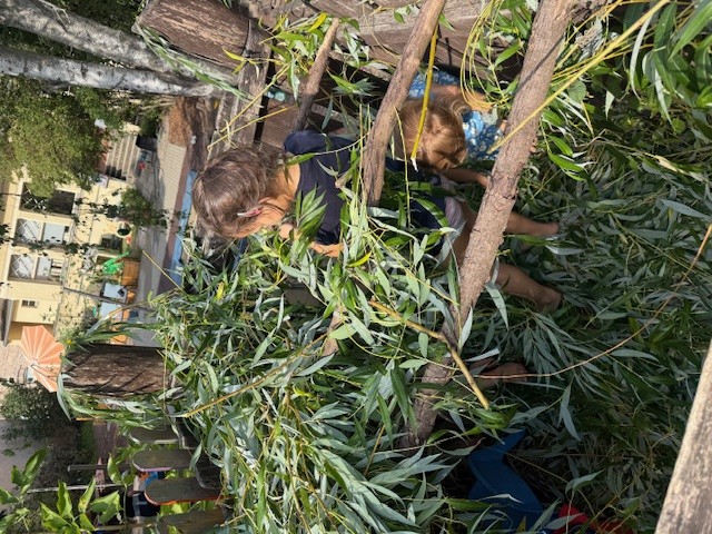 In unserem Kitaprojekt bauen wir gemeinsam einen Dschungel aus dünnen Weidenästen und Blättern. Ziel ist es, Kreativität, Naturverbundenheit und Teamarbeit zu fördern. Die Kinder sammeln Materialien wie: Äste, trockene Weidenblätter und kleine Stöcker. Dabei lernen Sie Sortieren und Auswählen von Baumaterialien. Unter Anleitung, experimentieren sie mit Formen und Stabilität, knüpfen einfache Strukturen und üben vorsichtiges Arbeiten im Team. Dabei entwickeln sie motorische Fähigkeiten, räumliches Denken und Probleme zu lösen. Das Projekt bietet eine sinnliche Erfahrung mit Naturmaterialien, stärkt Verantwortungsbewusstsein und schafft einen geschützten, spielerischen Raum zum Entdecken und Forschen. Kinder treten in Interaktion und treffen Absprachen wie: Arbeitsverteilung, Aufgabenbereiche und ästhetische Umsetzung. Die Höhle wird über Tage mit verschiedenen Rollenspielen belebt.