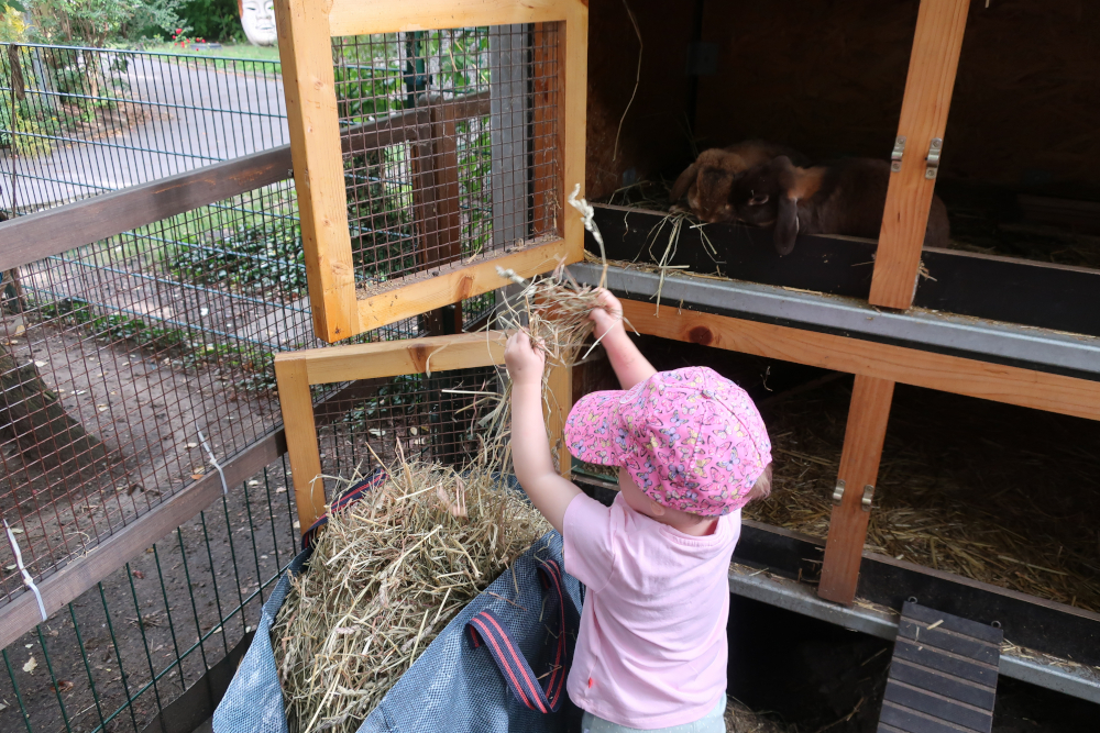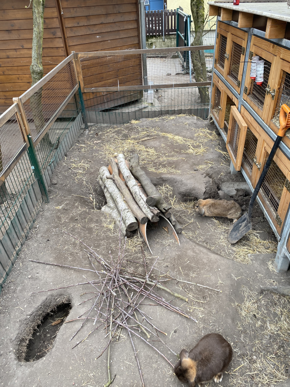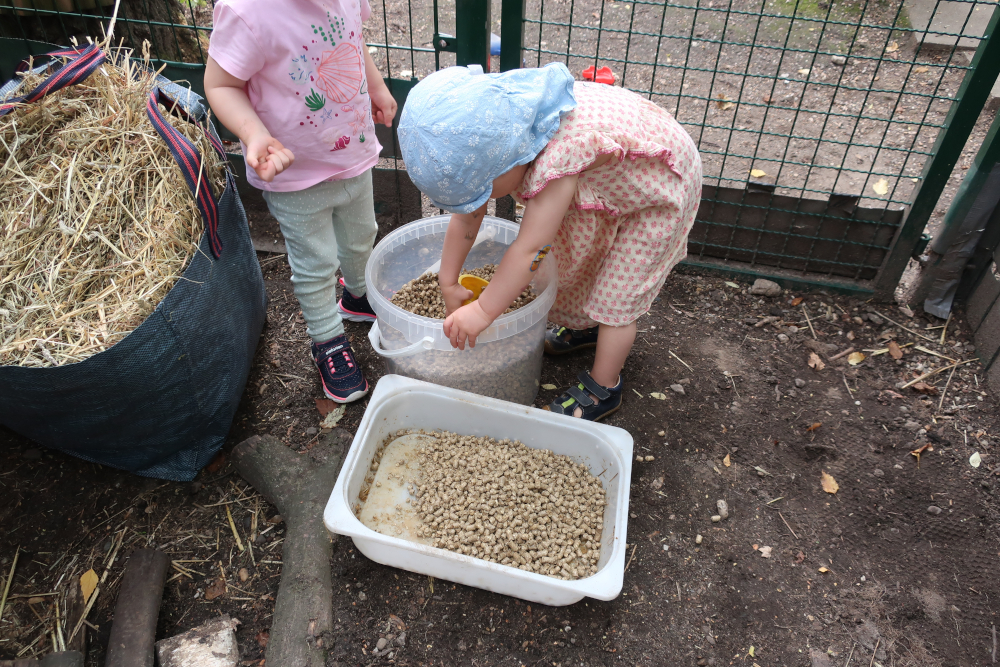 In wechselnder Verantwortung kümmern wir uns um die Versorgung der Hasen. Dabei helfen die Kinder tatkräftig mit. Sie entfernen das Einstreu, reinigen die Toiletten und befüllen diese mit neuen Pellets. Es kommt neues Stroh in den Käfig. Auch das Heu füllen die Kinder selbst auf und wechseln das Wasser aus den Trinkwasserspendern. Zum Schluss säubern wir gemeinsam den Auslauf und füttern die Hasen.