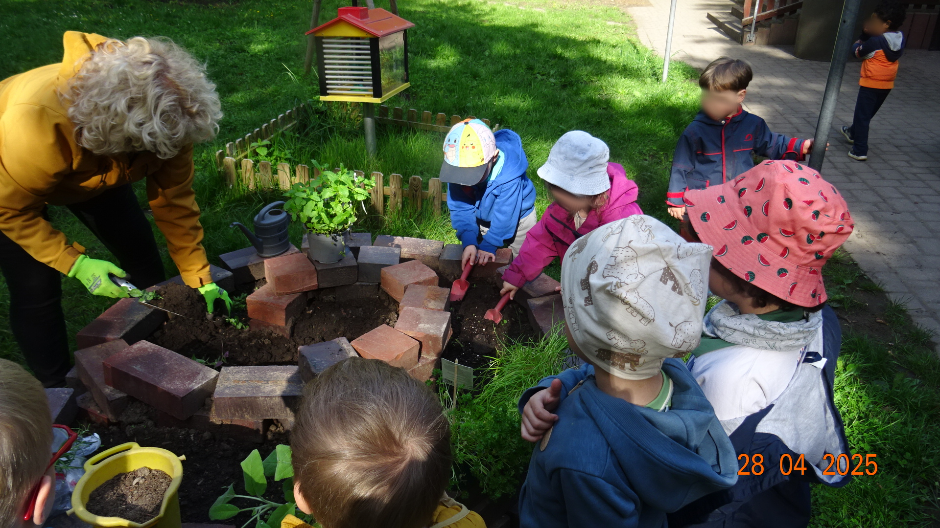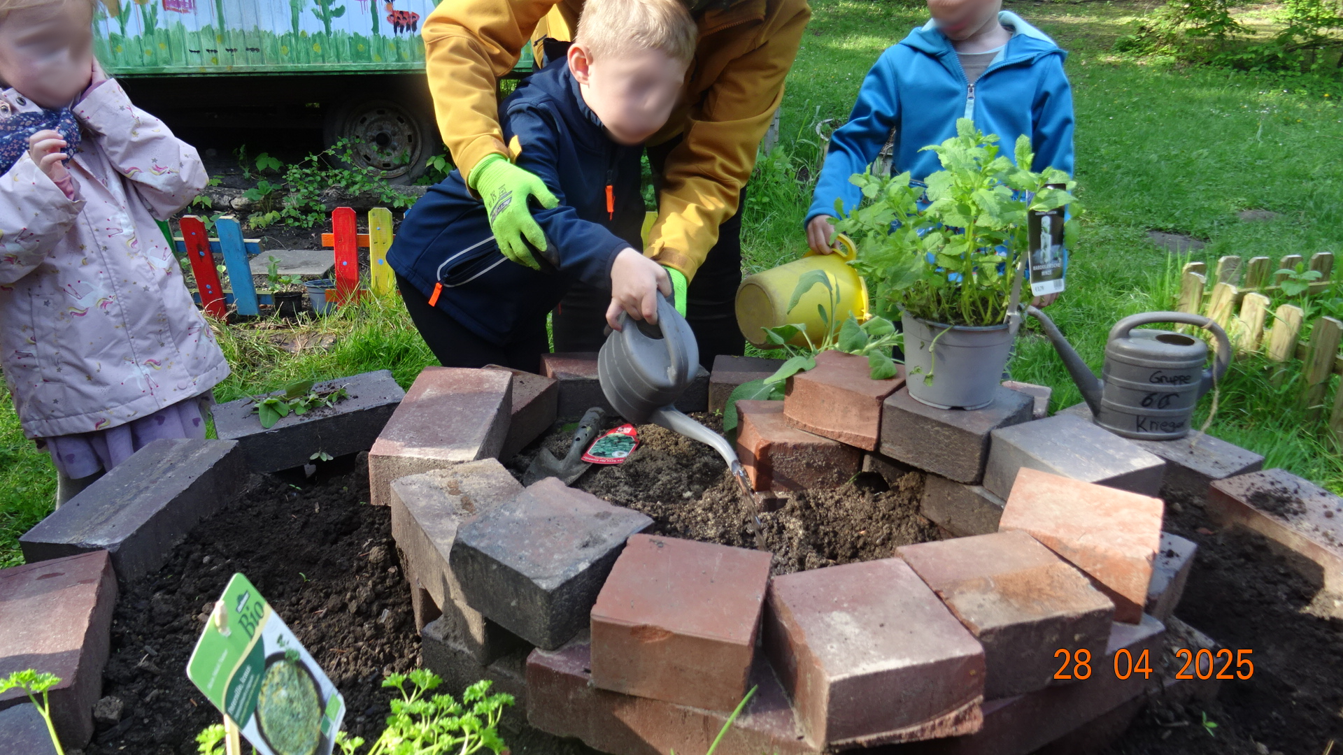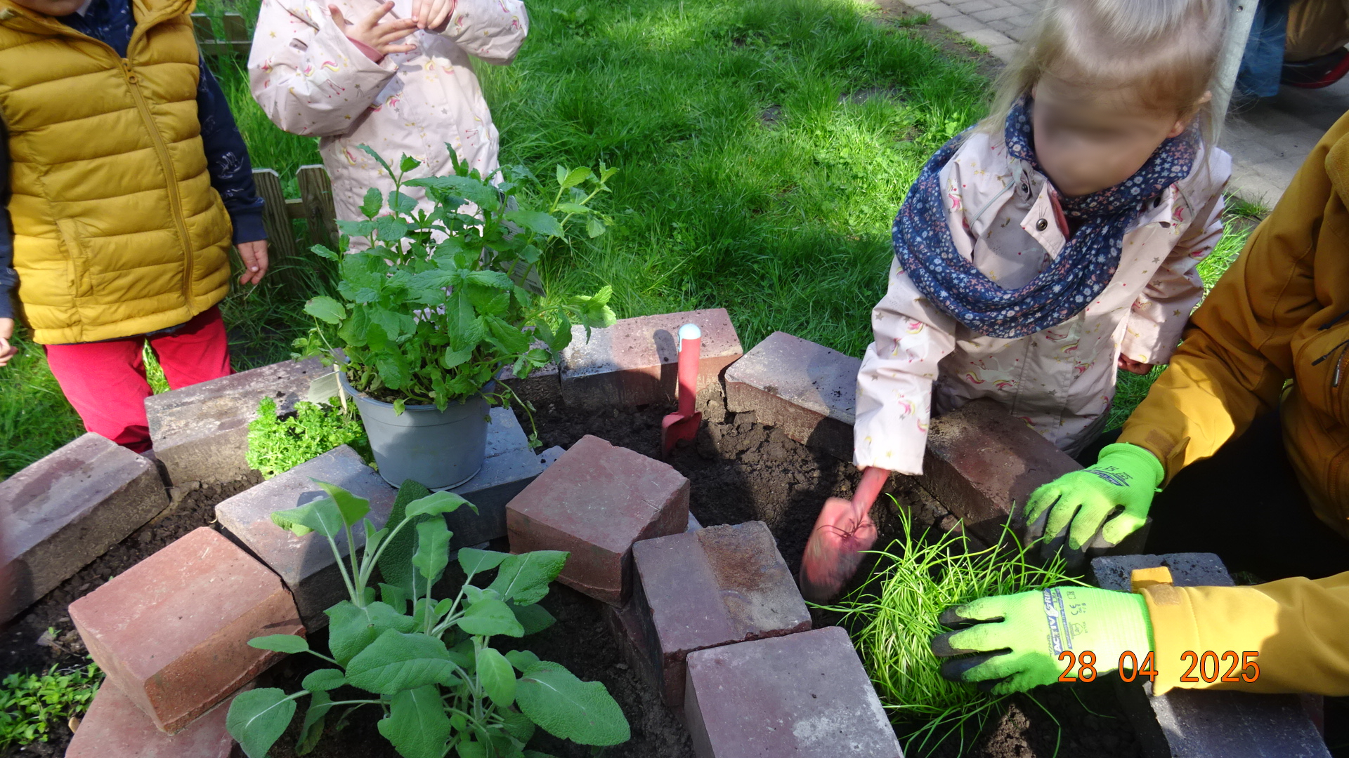 Im hinteren Gartenbereich haben wir eine Kräuterspirale aus Ziegelsteinen angelegt und diese mit Erde befüllt. Am 28. April bepflanzten die Kinder die Kräuterspirale mit vorgezogenen und mitgebrachten Kräutern wie Petersilie und Schnittlauch, Salbei, Rosmarin und Co. Die Kinder können auf ihre Kenntnisse zum Bepflanzen und der Kräuterarten zurückgreifen.