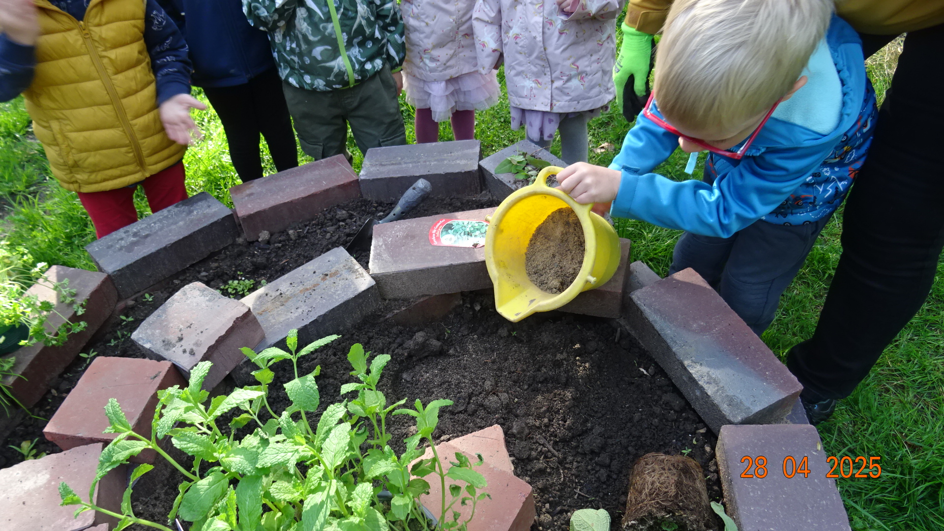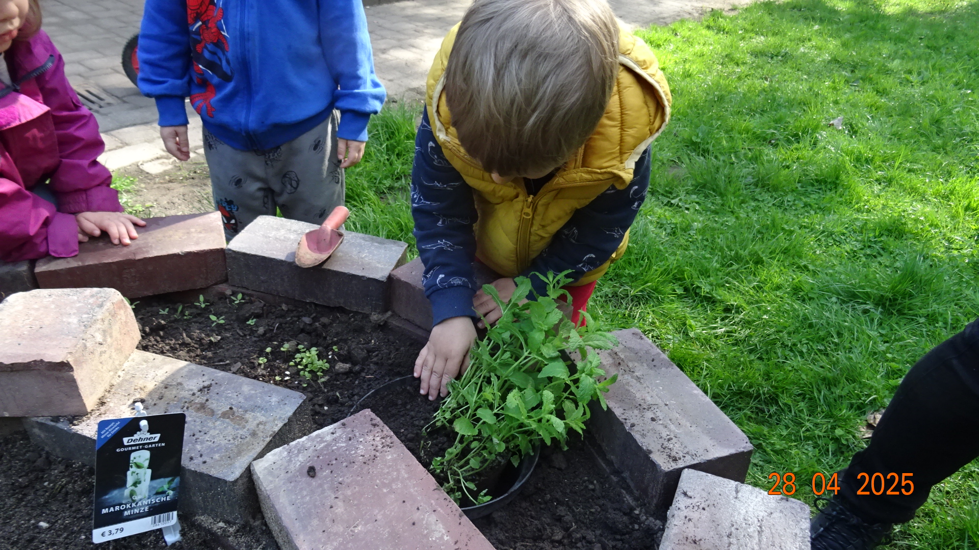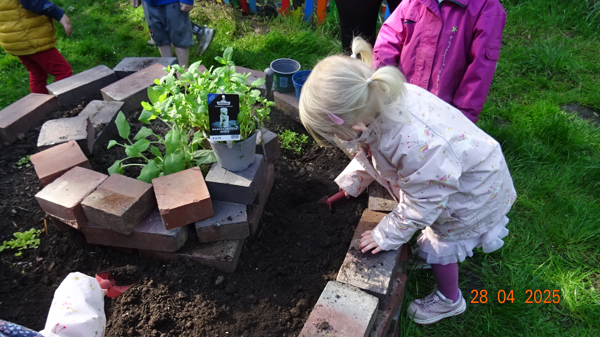 Im hinteren Gartenbereich haben wir eine Kräuterspirale aus Ziegelsteinen angelegt und diese mit Erde befüllt. Am 28. April bepflanzten die Kinder die Kräuterspirale mit vorgezogenen und mitgebrachten Kräutern wie Petersilie und Schnittlauch, Salbei, Rosmarin und Co. Die Kinder können auf ihre Kenntnisse zum Bepflanzen und der Kräuterarten zurückgreifen.
