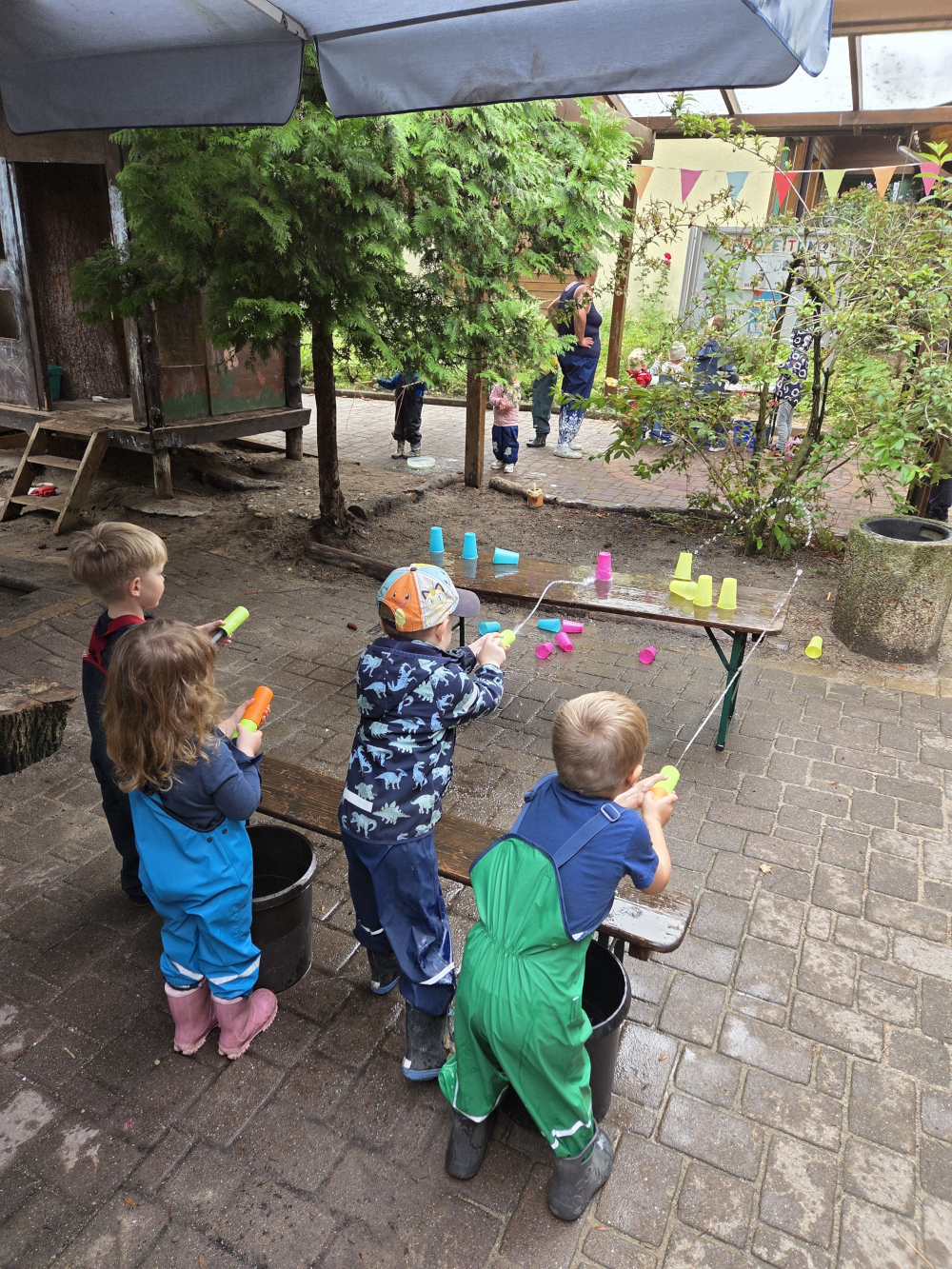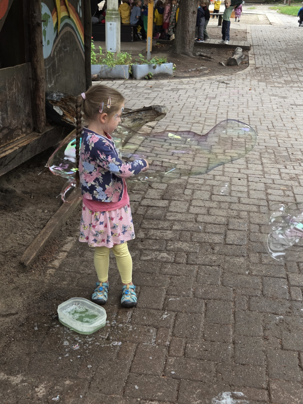 Am 29.08.25 haben wir unser Sommerfest, welches einen Tag zuvor leider ins Wasser gefallen ist, am Vormittag mit allen Kindern nachgeholt. Nach einer gemeinsamen Eröffnungsliederrunde haben die Kinder die unterschiedlichsten Aktivitäten vorgefunden und ausprobiert. Neben Kinderschminken galt es das Olchischubsen zu überstehen, Seifenblasenexperimente durchzuführen, Becher mit Spritzpistolen umzuschießen, Einschätze wollten herausgeklopft und individuelles Papier geschöpft werden. Am Vor- und Nachmittag hat die Kinder ein reichhaltiges Obst- und Kuchenbuffet erwartet, welches uns die Eltern beschert haben.