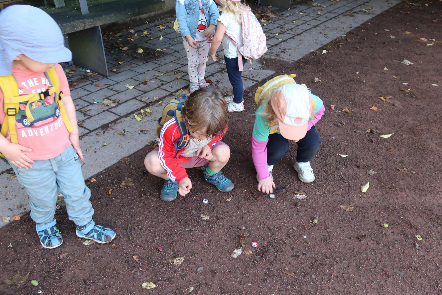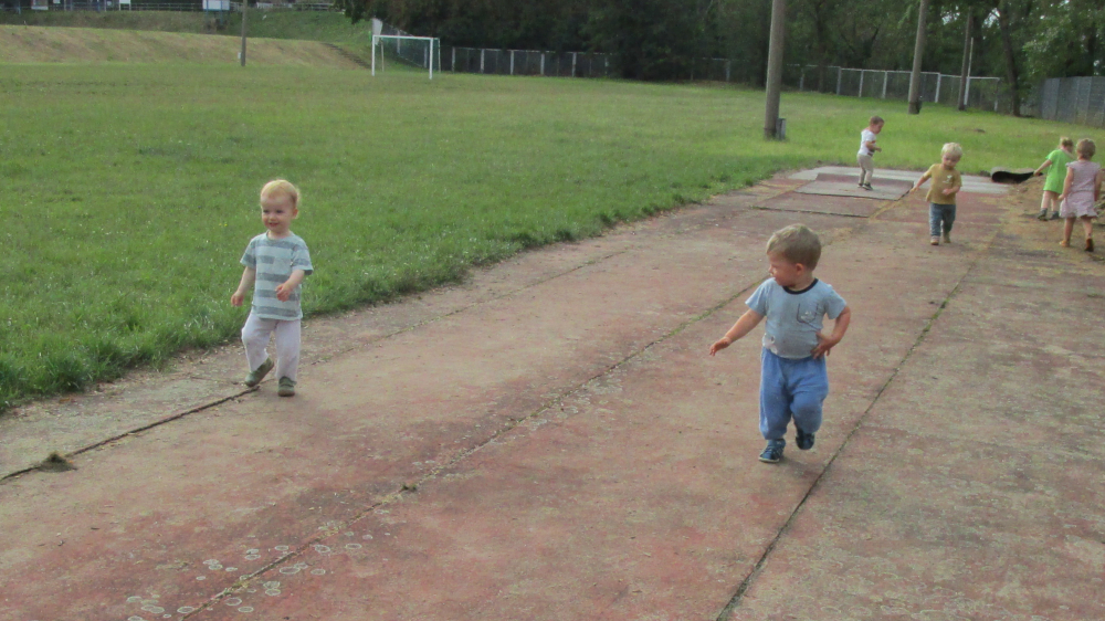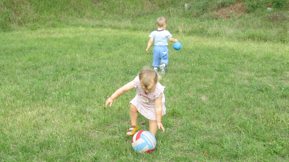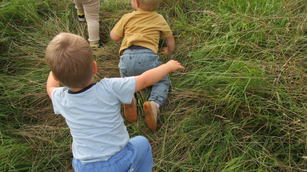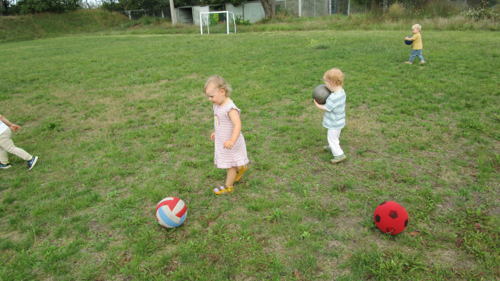 Die Gruppe der 1 bis 2-jährigen Kinder hat zum ersten Mal den angrenzenden Sportplatz erkundet. Sie haben u.a. Fußball gespielt. An den Hängen hatten die Kinder viel Spaß daran, sich auszuprobieren, wie sie nach unten und wieder nach oben kommen.
