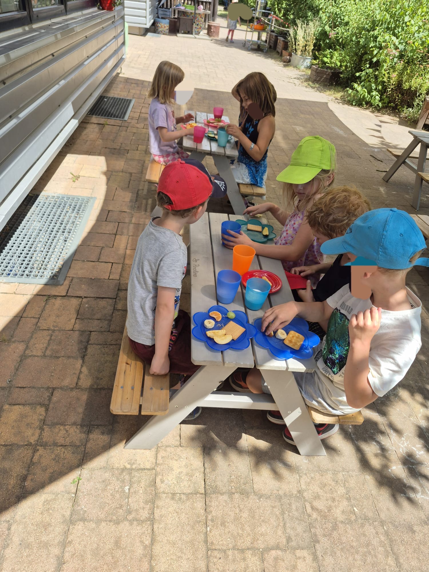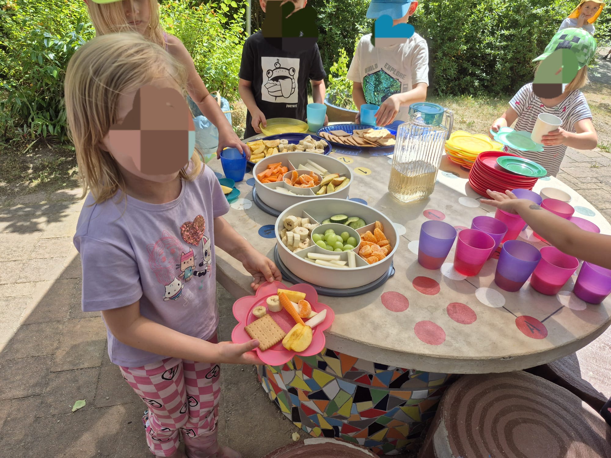 Das gemeinsame Essen schafft eine angenehme und ruhige Atmosphäre. Die Kinder sitzen zusammen, unterhalten sich und genießen dabei die angebotenen Obst- und Gemüsesorten. So wird gesunde und vielfältige Ernährung von Anfang an selbstverständlich erlebt und gelebt.