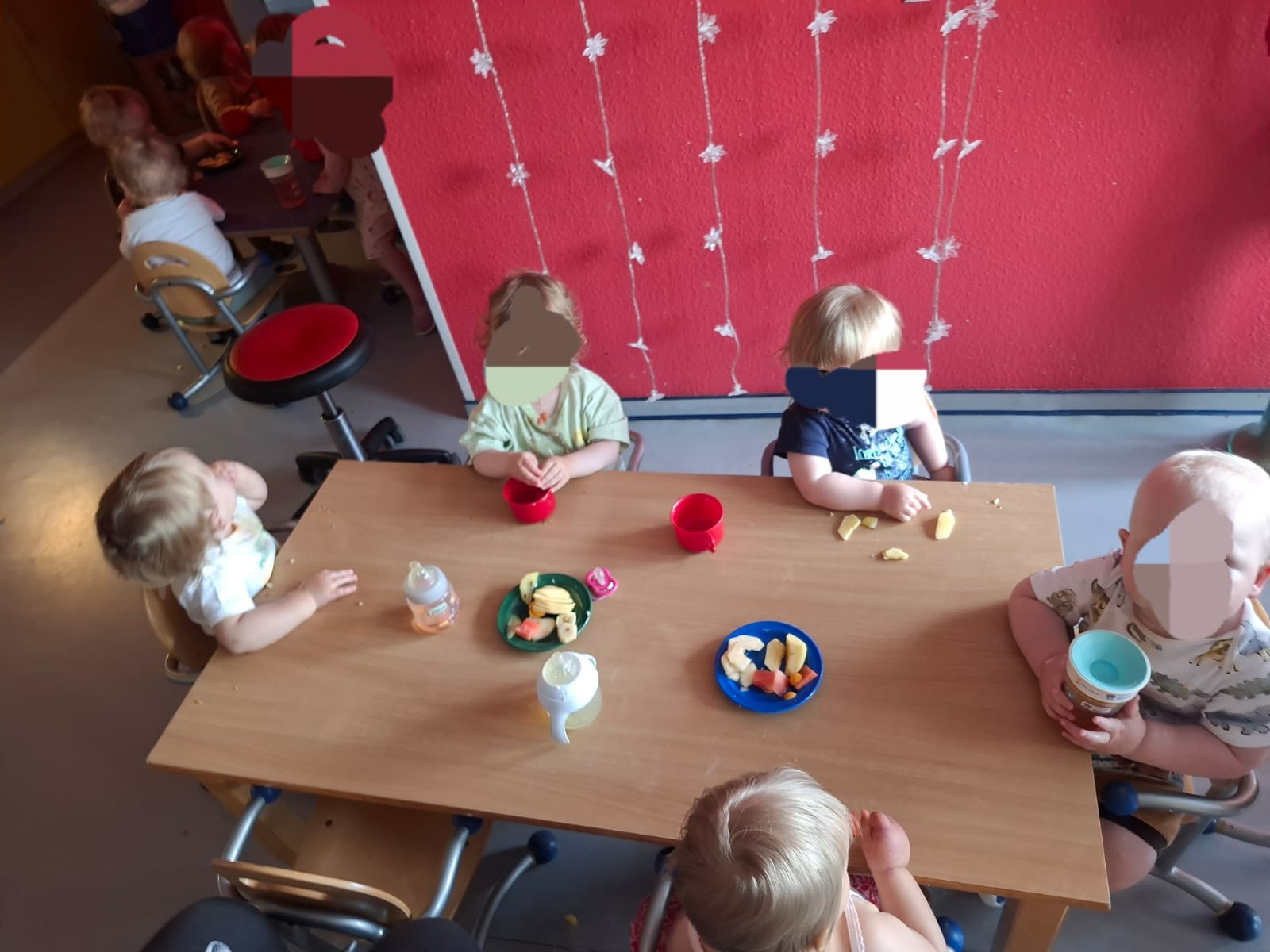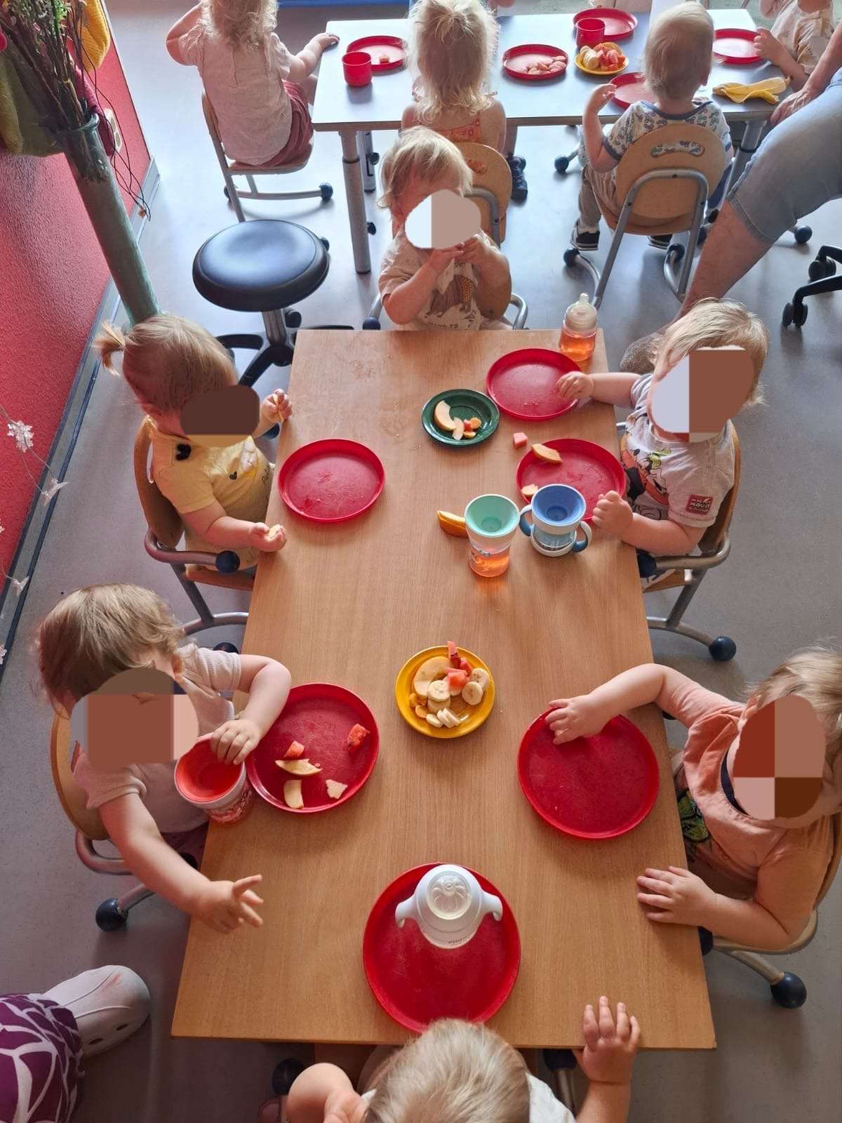 Bereits im Krippenalter erhalten die Kinder bei uns mehrmals täglich frisches Obst und Gemüse. Wir legen großen Wert auf eine ausgewogene und gesunde Ernährung und fördern diese gezielt im Alltag.