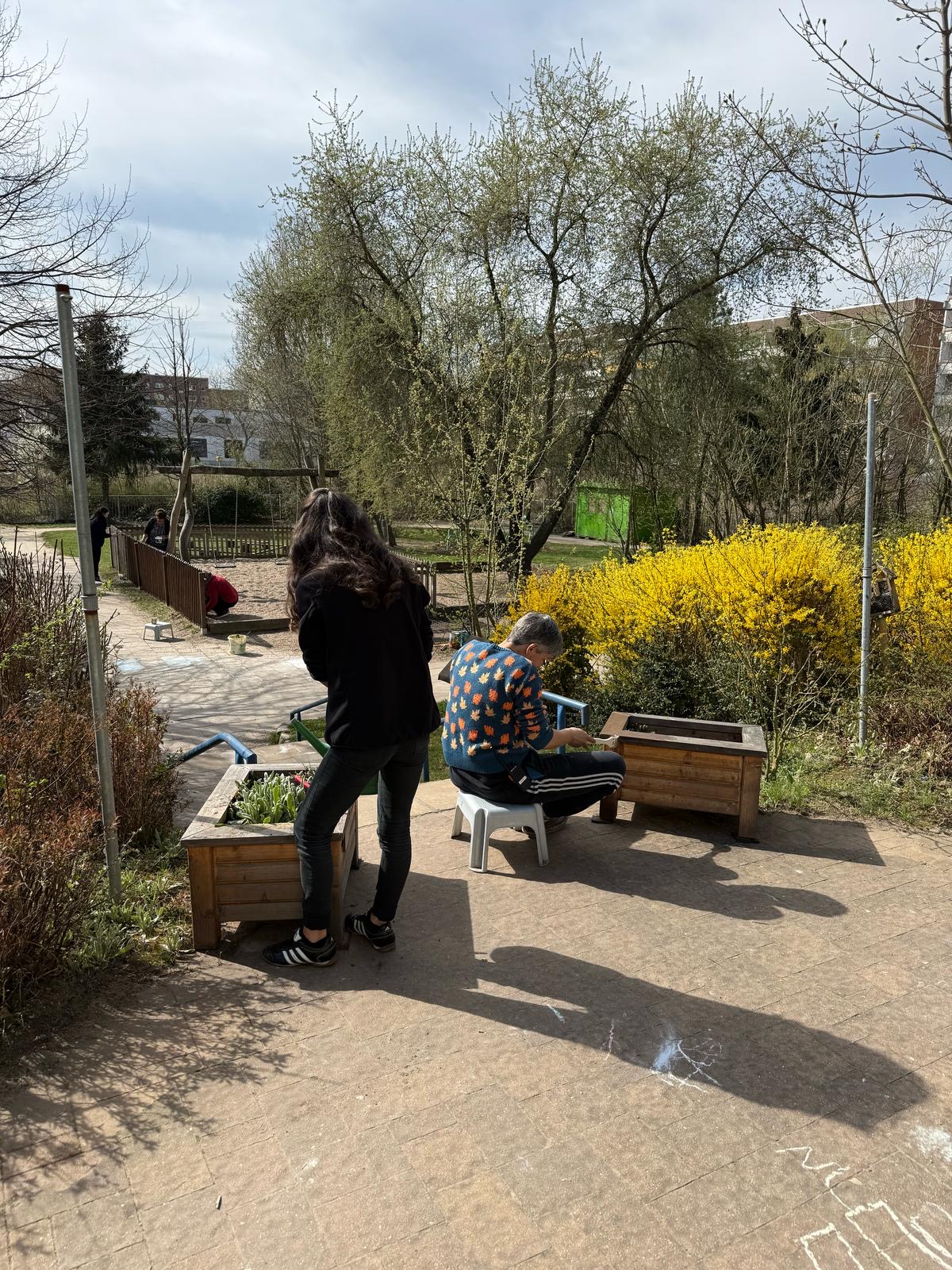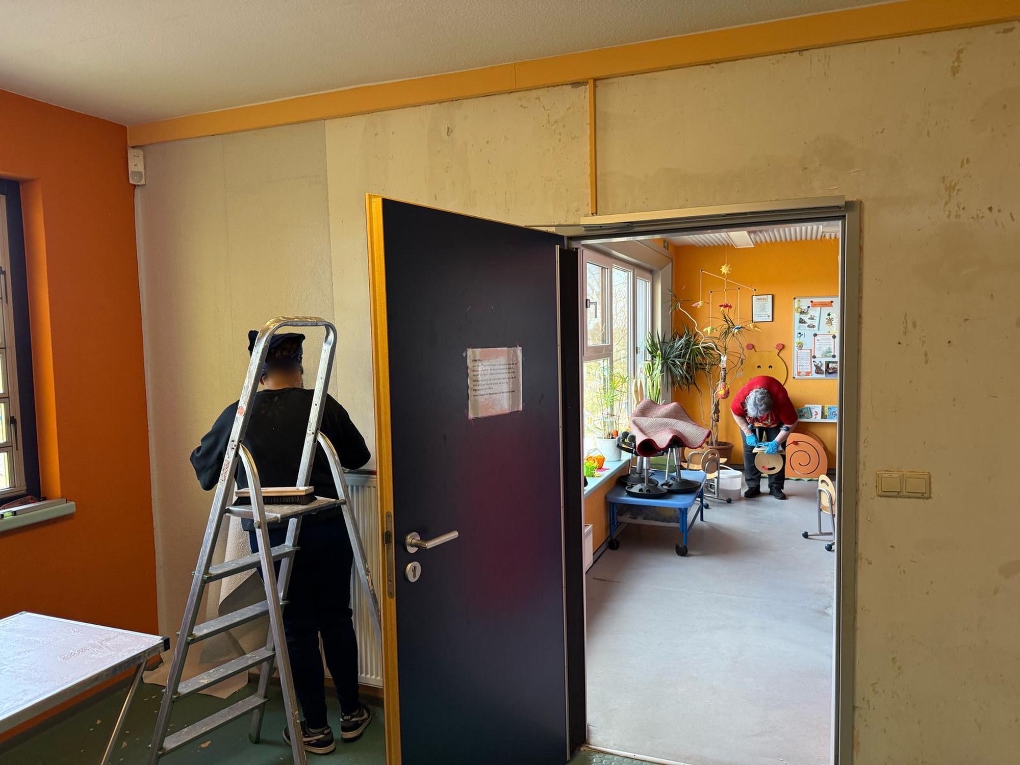 Beim großen Arbeitseinsatz am 05. April 2025 wurden mit tatkräftiger Unterstützung der Eltern zahlreiche Verschönerungs- und Instandhaltungsarbeiten in unserer Kita umgesetzt. Gemeinsam wurden das neue Trampolin aufgebaut, die Zäune gestrichen, Tapeten im Krippenbereich erneuert sowie Tische und Stühle gründlich gereinigt. Auch die Gartenhäuser wurden aufgeräumt und der Nutzgarten von Unkraut befreit.