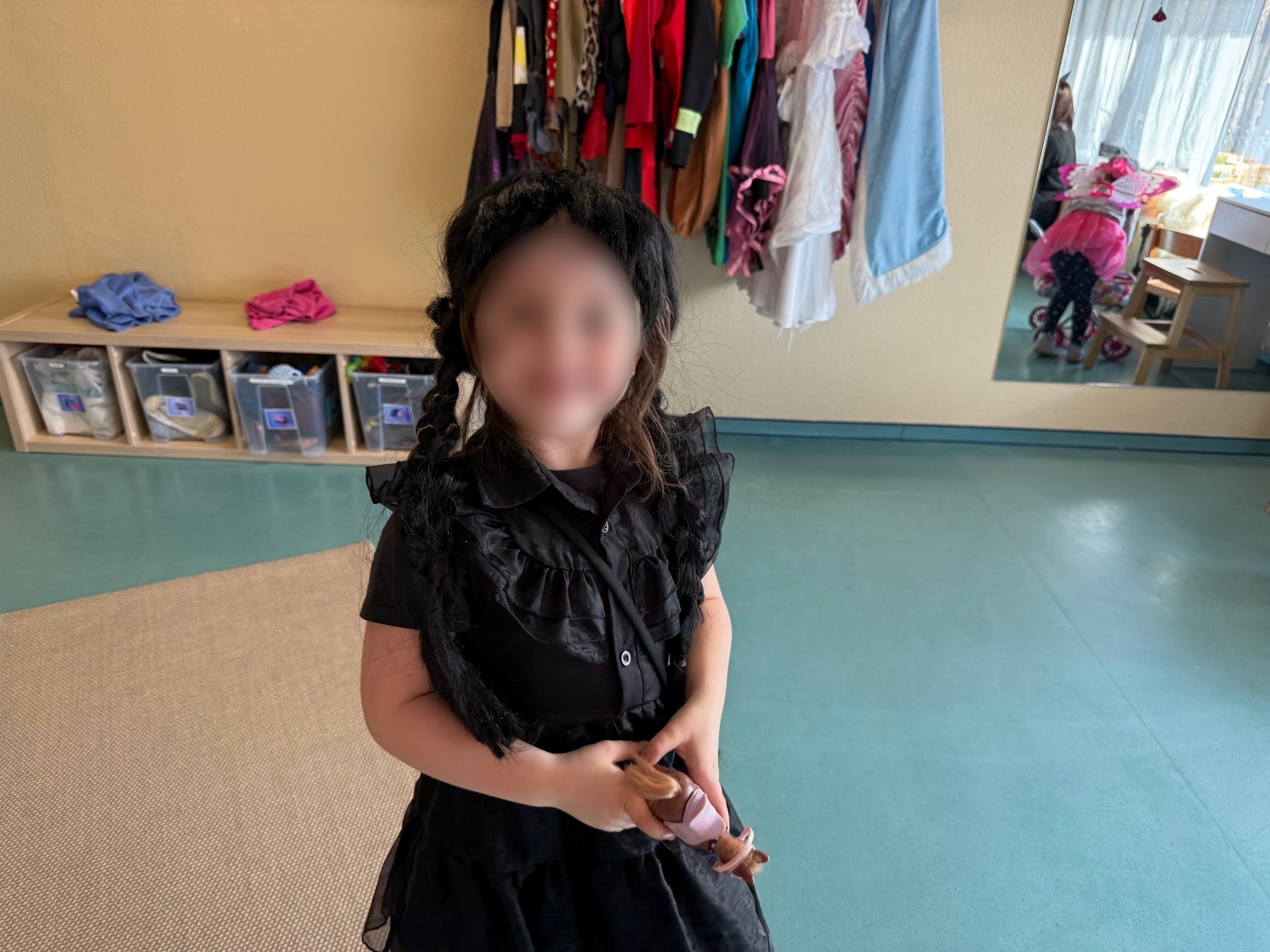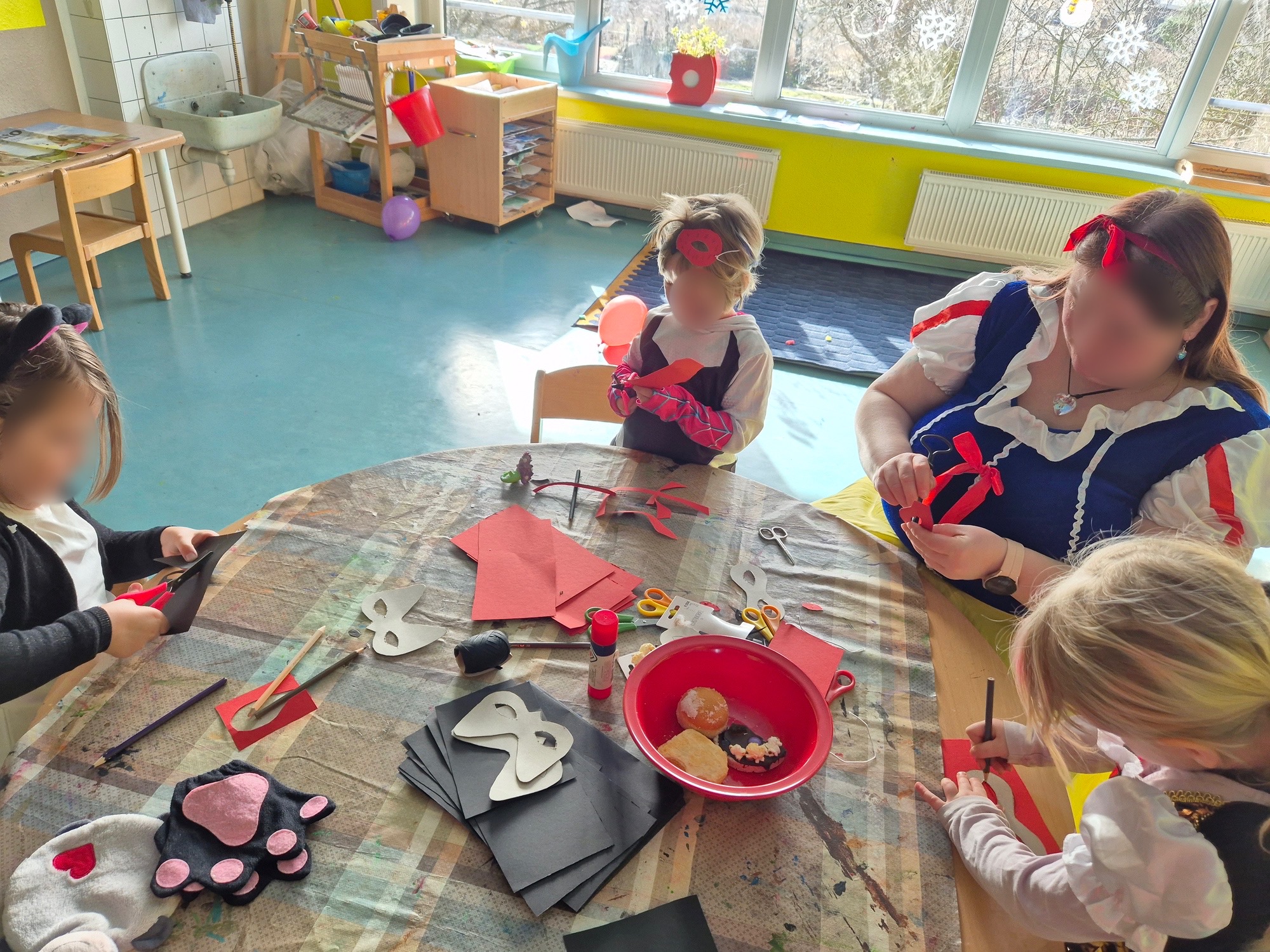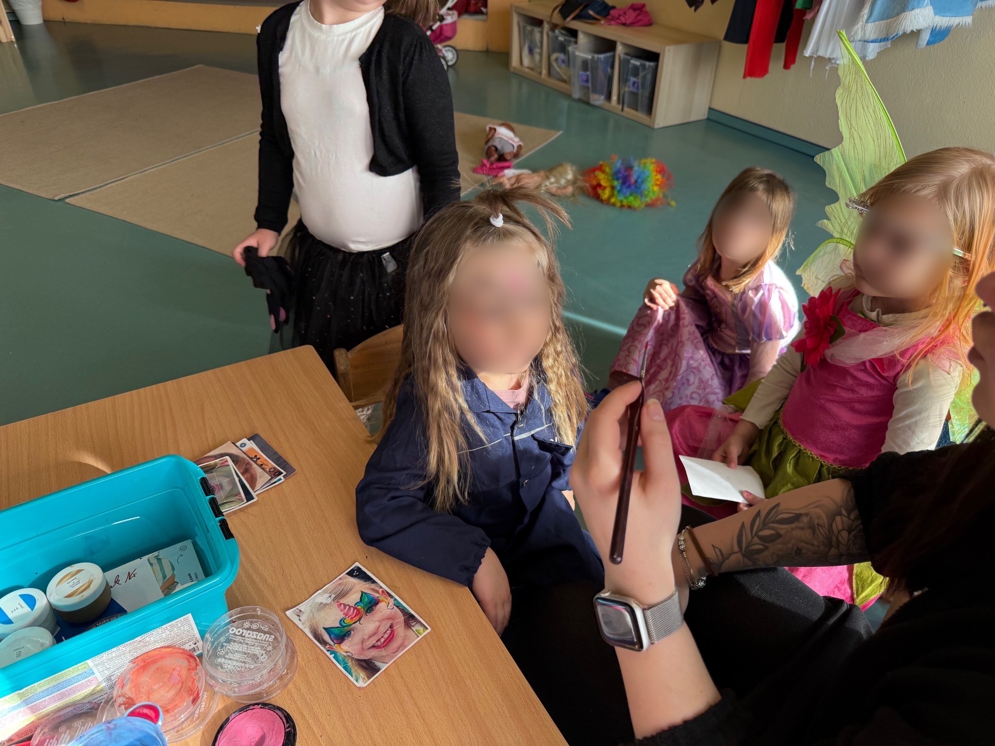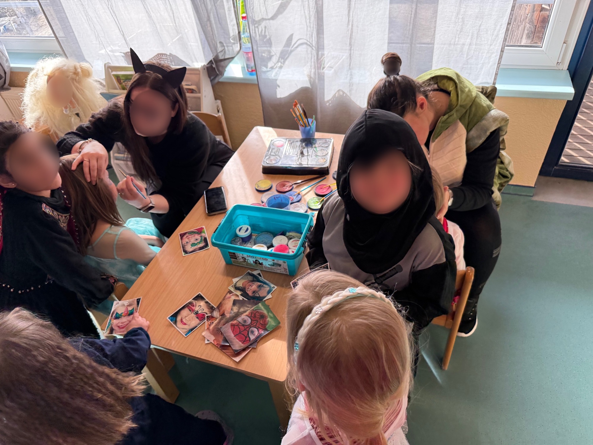 Alle Kinder trugen ein kreatives Kostüm, das sie um 9 Uhr im Bewegungsraum präsentieren konnten. Anschließend gingen wir in die obere Etage, wo verschiedene Aktivitäten auf die Kinder warteten: Sie konnten sich schminken lassen, Masken basteln, tanzen und Ballon-Konfetti gestalten.